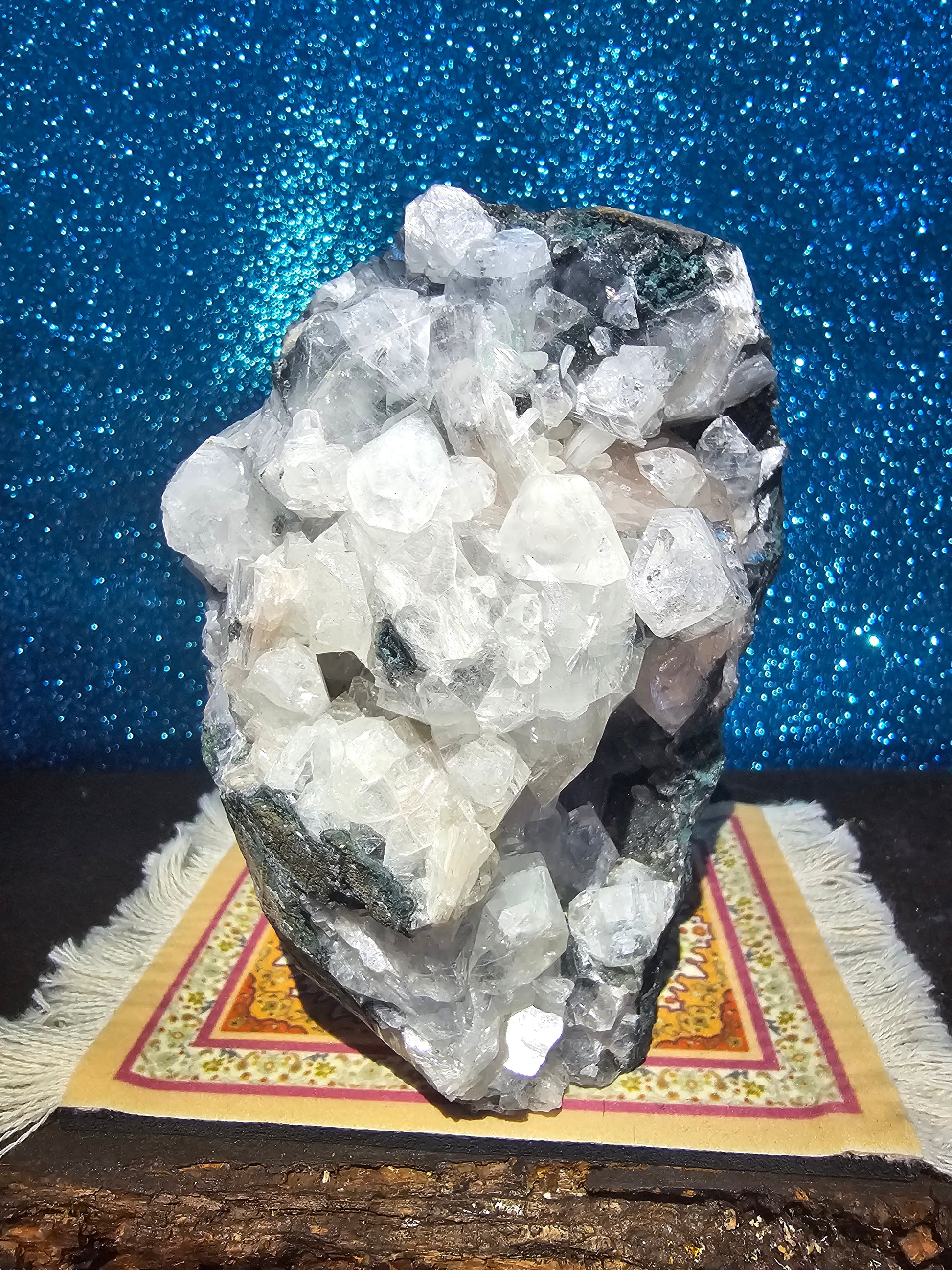 Presenting the exquisite Diamond Apophylite Specimen – a true marvel of nature's artistry and a testament to the captivating beauty of crystal formations. This exceptional specimen showcases the harmonious fusion of diamond-like sparkle and the ethereal grace of apophylite, resulting in a mesmerizing masterpiece that evokes a sense of wonder and awe.