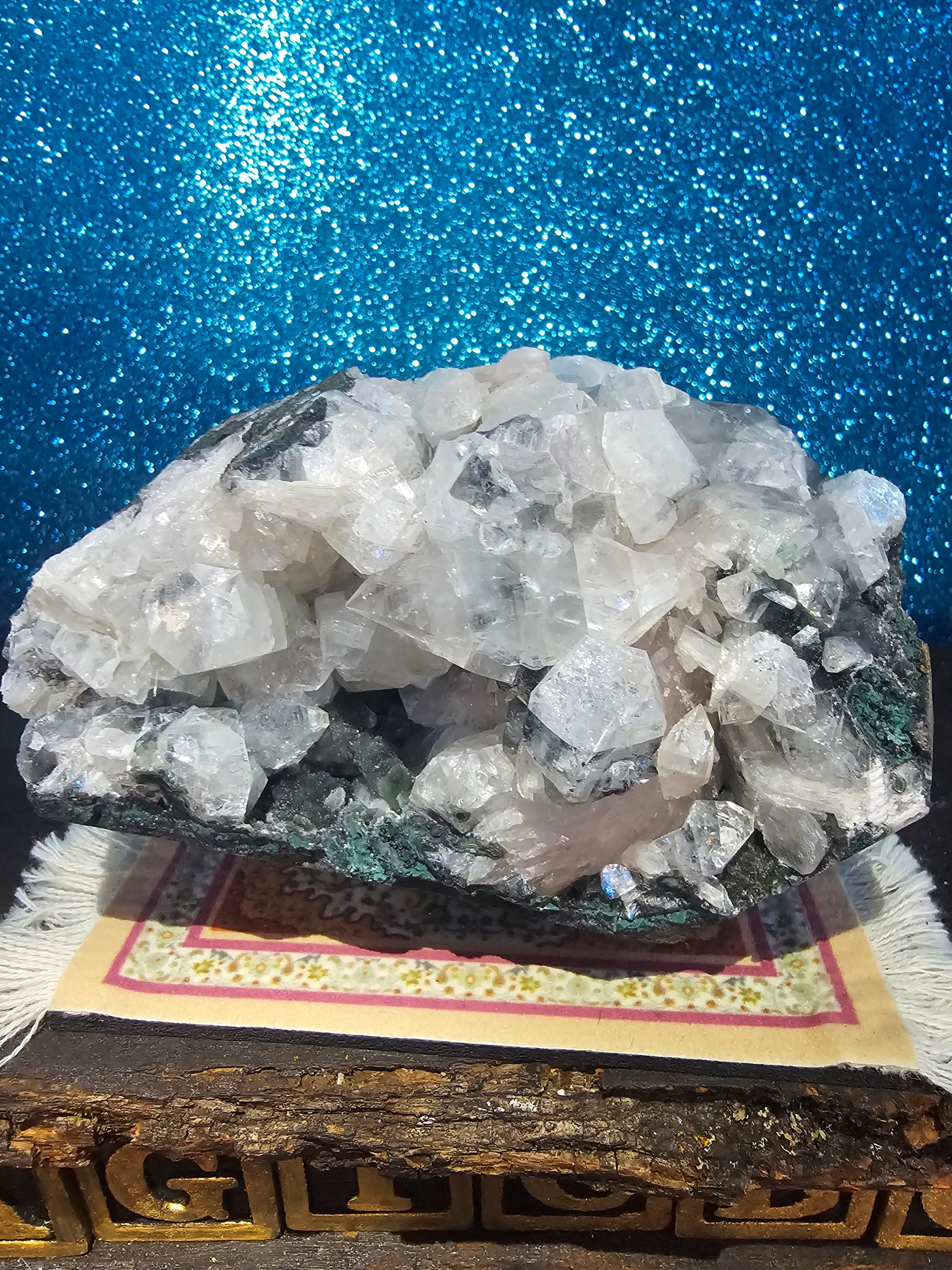 Gaze upon the Diamond Apophylite Specimen, and you'll be immediately drawn to its radiant allure. The delicate, pyramid-like apophylite crystals, reminiscent of glistening diamonds, delicately blanket the matrix, creating a captivating contrast between the natural sparkle and the subdued backdrop. The specimen's pristine clarity and reflective qualities give it a distinct brilliance, captivating the eye from every angle.
