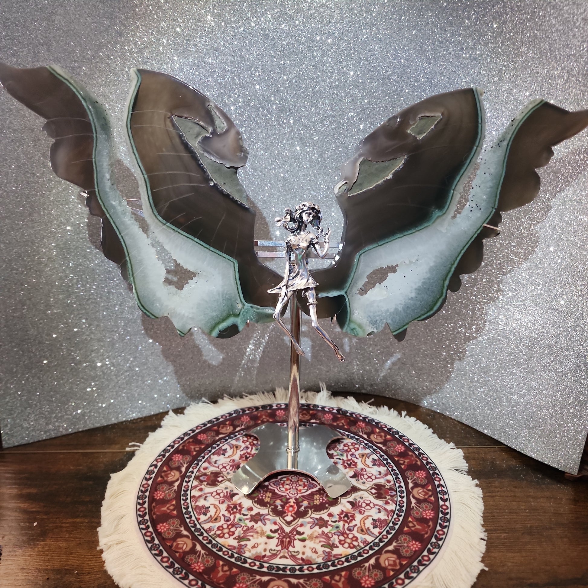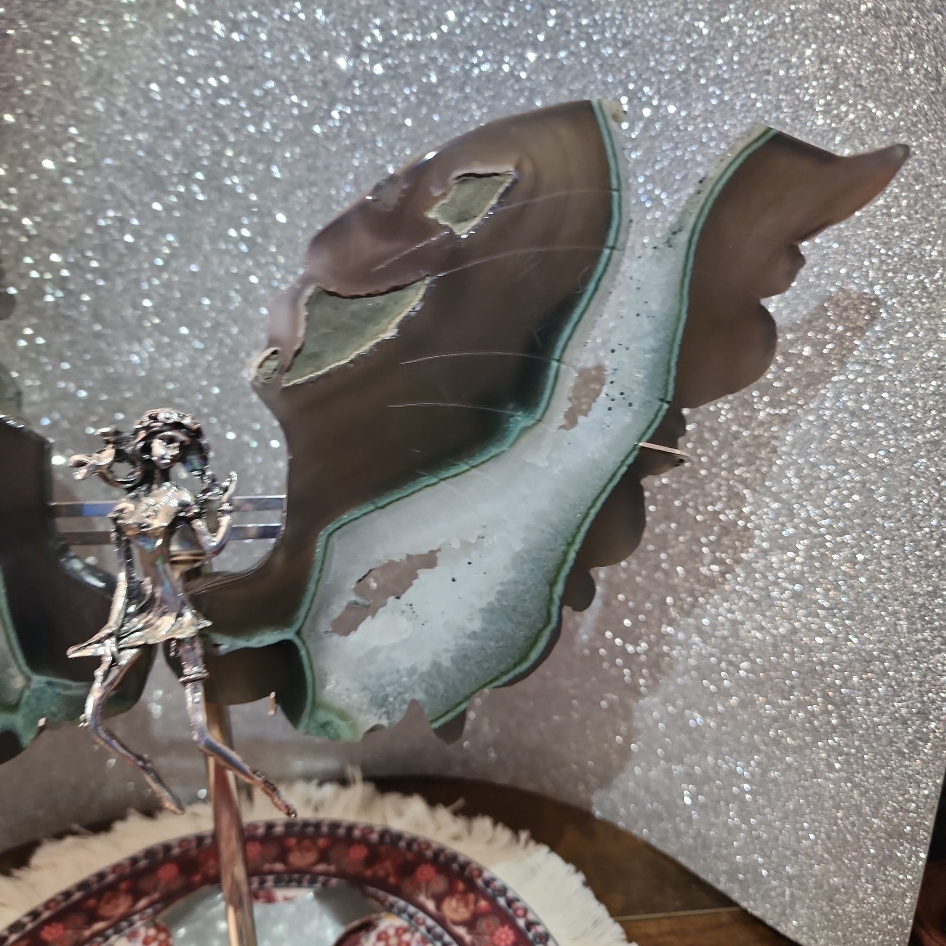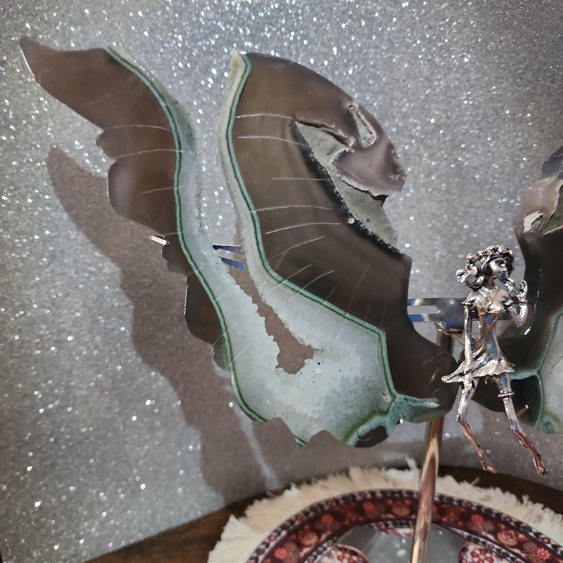 Introducing our Agate Fairy Wings with Stand, a delicate and enchanting piece of nature's artistry. Crafted from exquisite agate slices, these translucent, intricately banded "fairy wings" showcase a kaleidoscope of colors and patterns. Displayed on a specially designed stand, this unique decorative item adds a touch of whimsy and elegance to any space, making it a captivating conversation starter and a magical addition to your home or office decor.