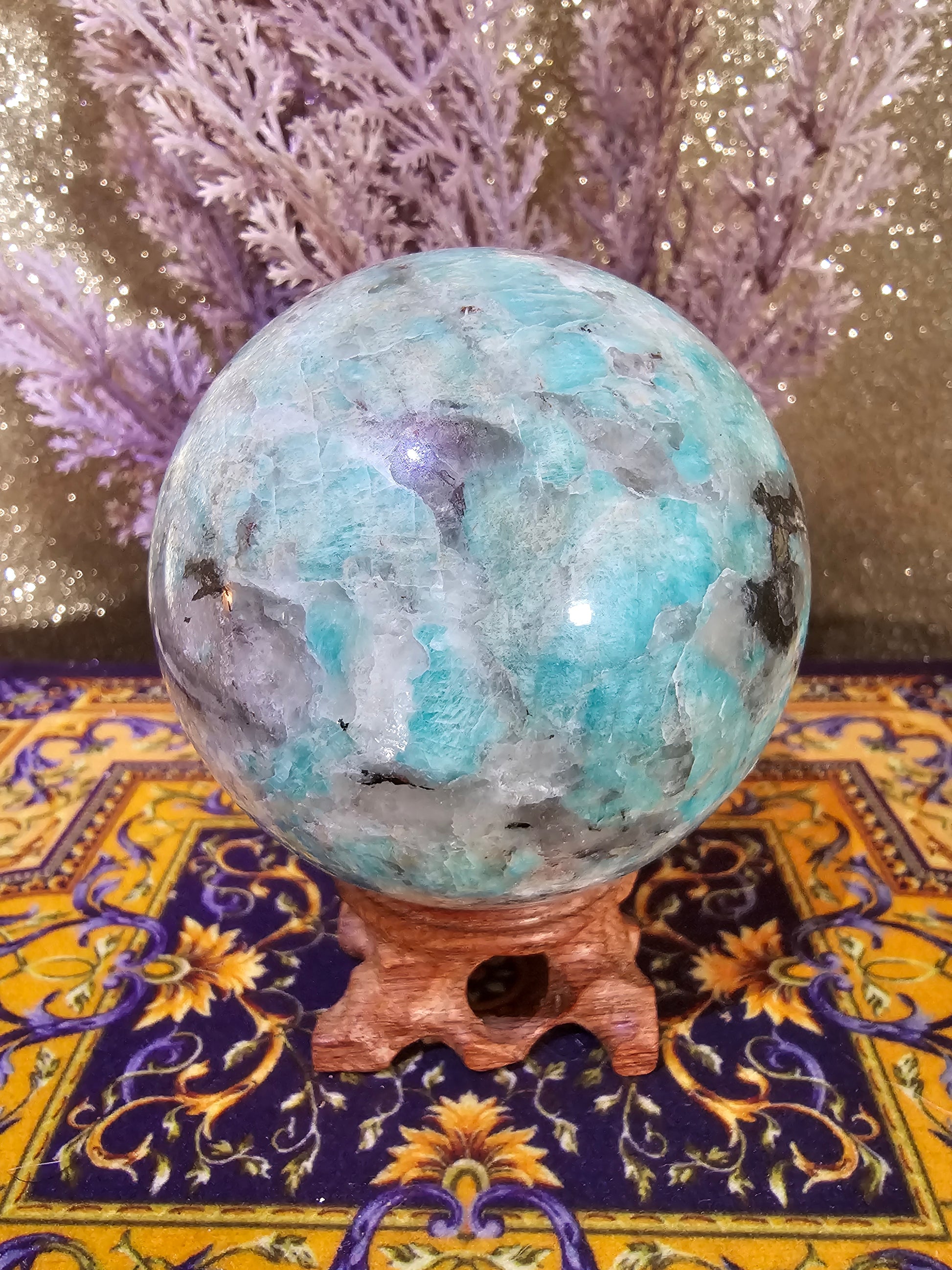 Our Amazonite Sphere is a mesmerizing gemstone creation that encapsulates the calming and serene energy of Amazonite in a perfectly polished spherical form. Meticulously crafted, this unique piece radiates both visual elegance and the harmonious energy inherent in this soothing gemstone.