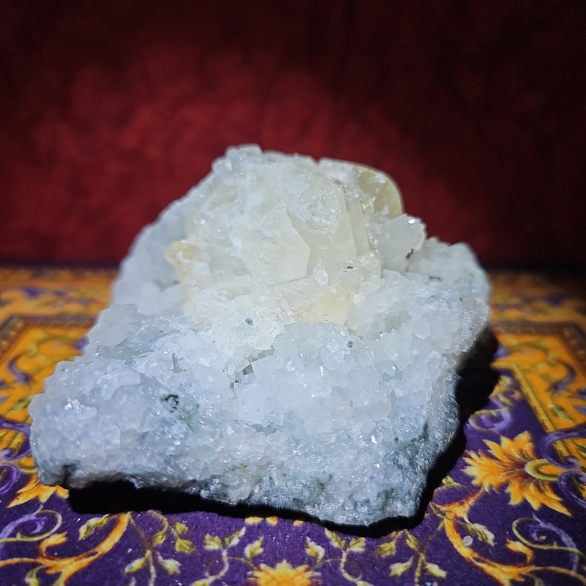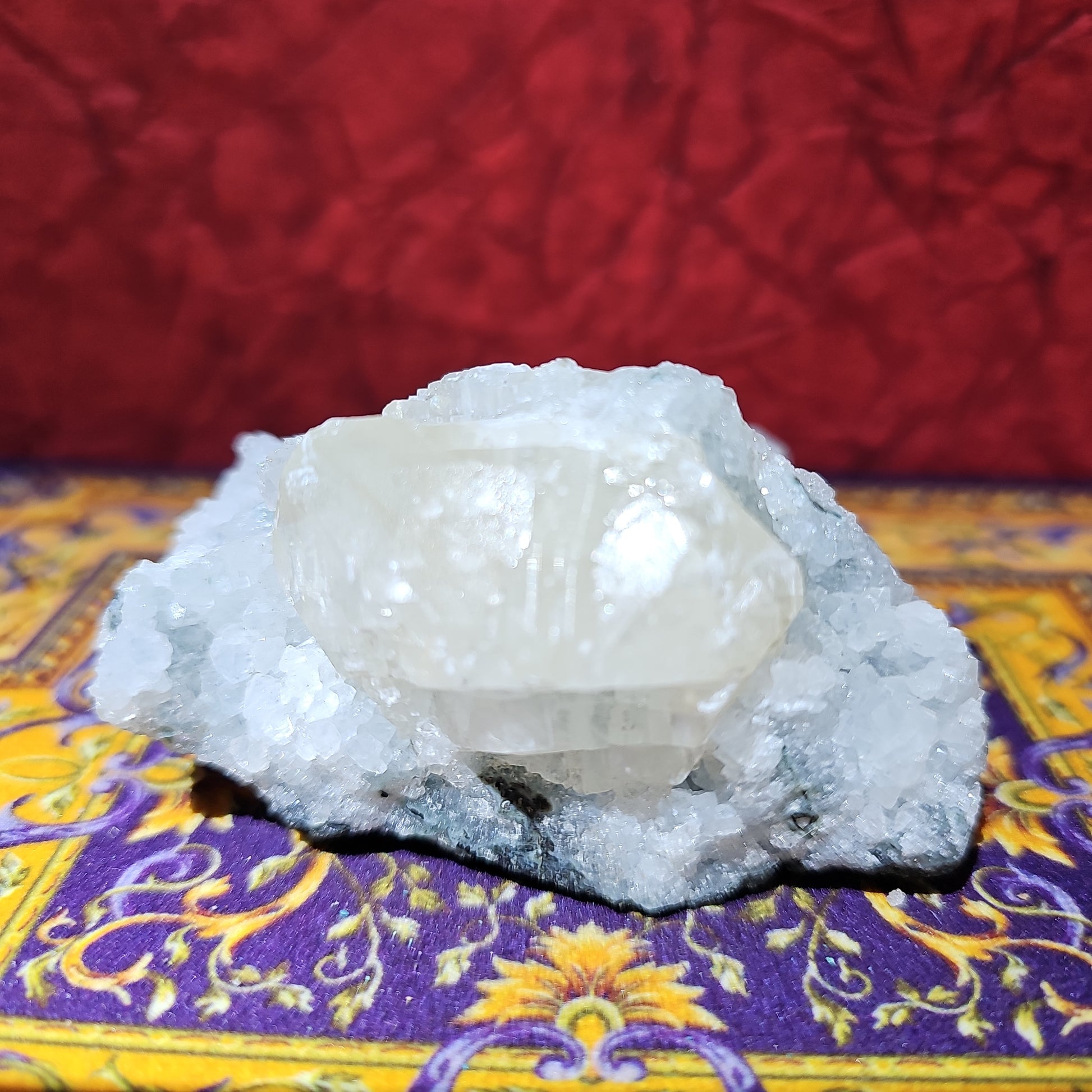 Presenting our Apophyllite Calcite Specimen – a shimmering embodiment of tranquility and spiritual illumination. Meticulously sourced and curated, this exquisite piece captures the ethereal beauty and healing energy of genuine apophyllite crystals.