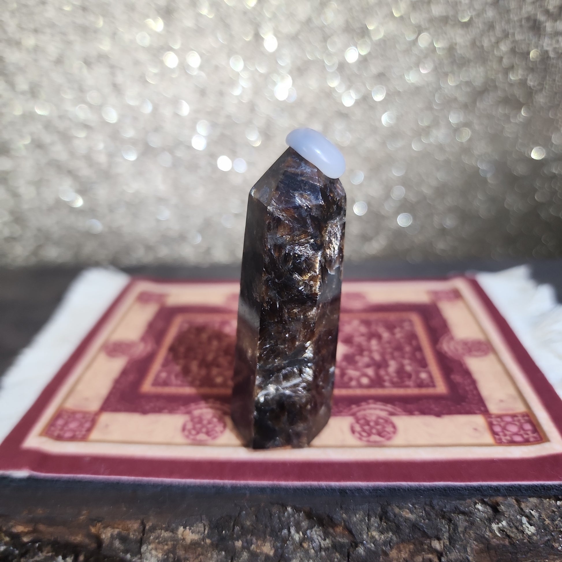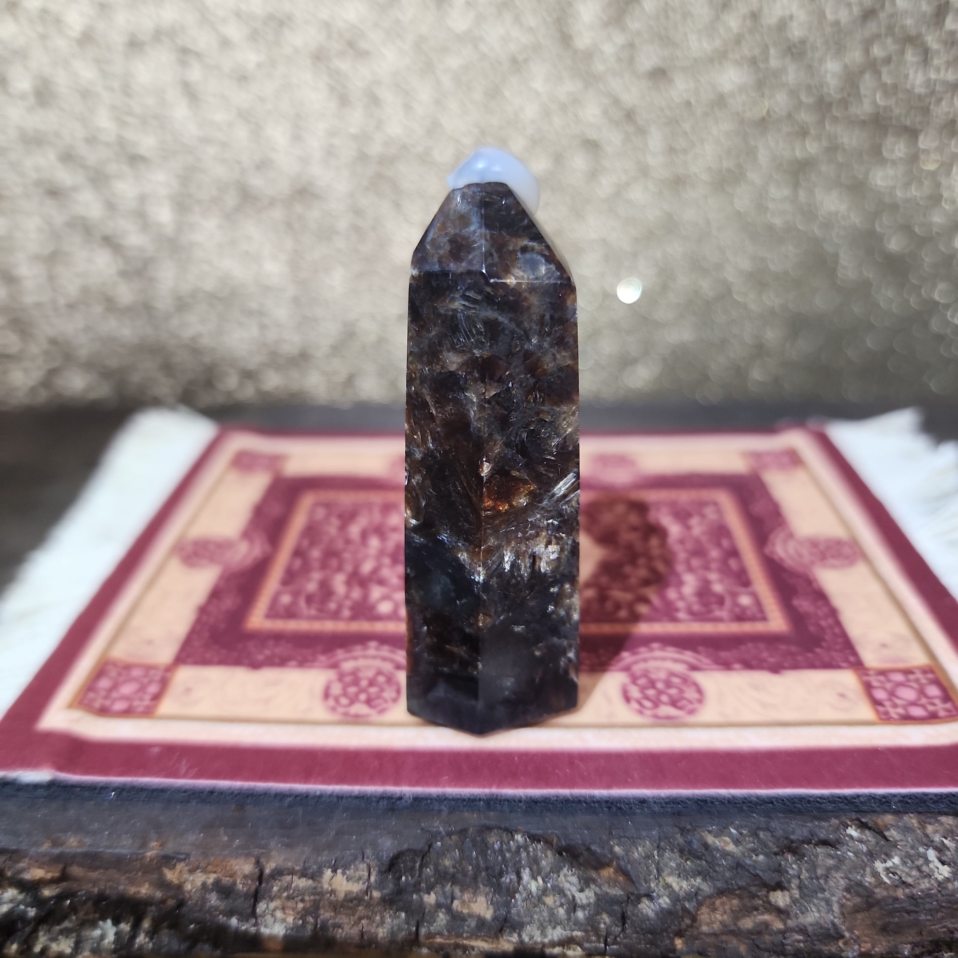 Each Arfvedsonite Tower is a true treasure, carefully selected for its exceptional quality and striking appearance. Its smooth, polished surface reveals intricate patterns and glimmers of iridescent light, inviting you to explore the depths of its allure and tap into its profound energy.