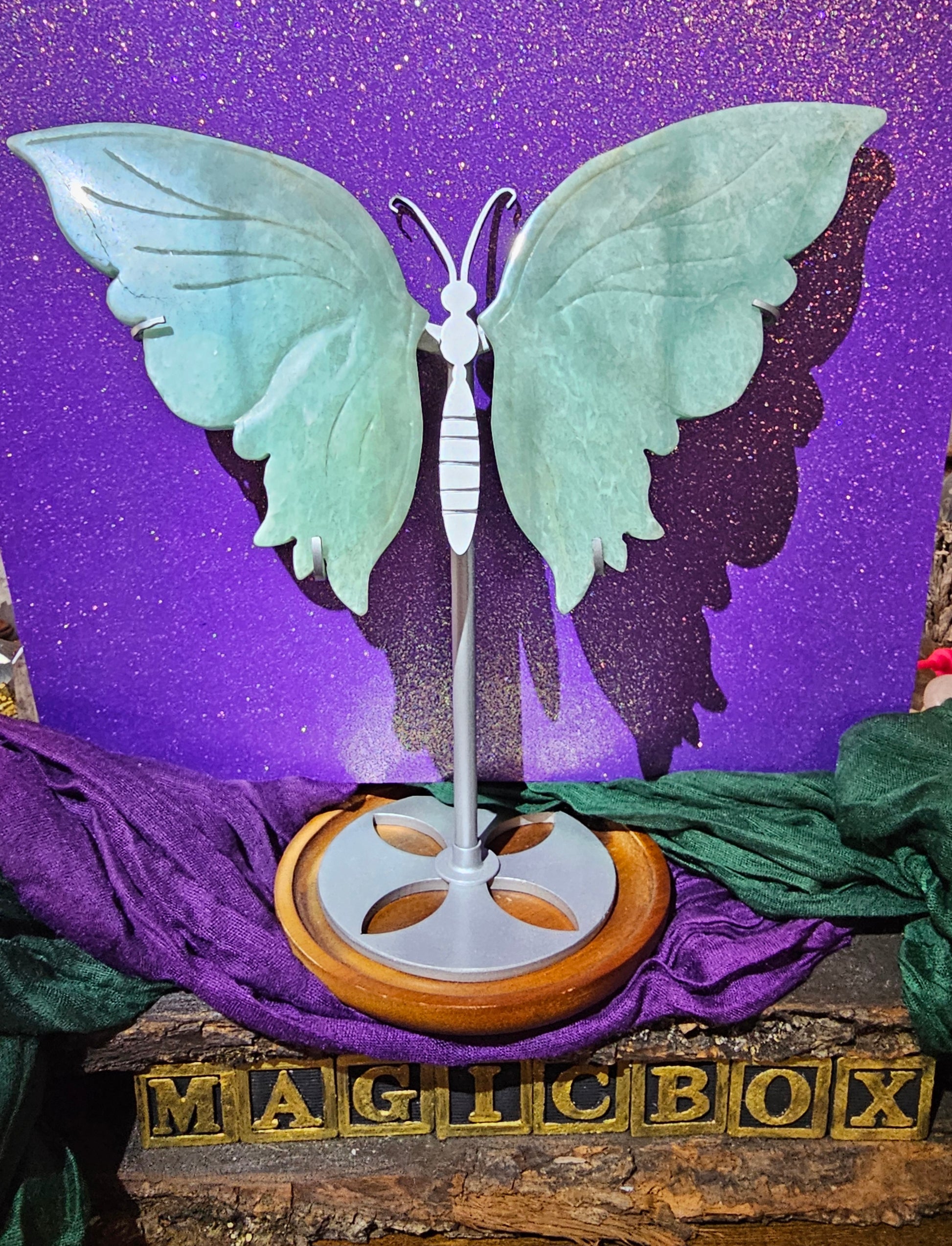 Each set of butterfly wings is meticulously carved and polished to highlight the iridescent hues and natural shimmer of Aventurine. The smooth, flowing lines of the wings reflect the graceful motion of a butterfly in flight, creating a mesmerizing display that exudes tranquility and enchantment.