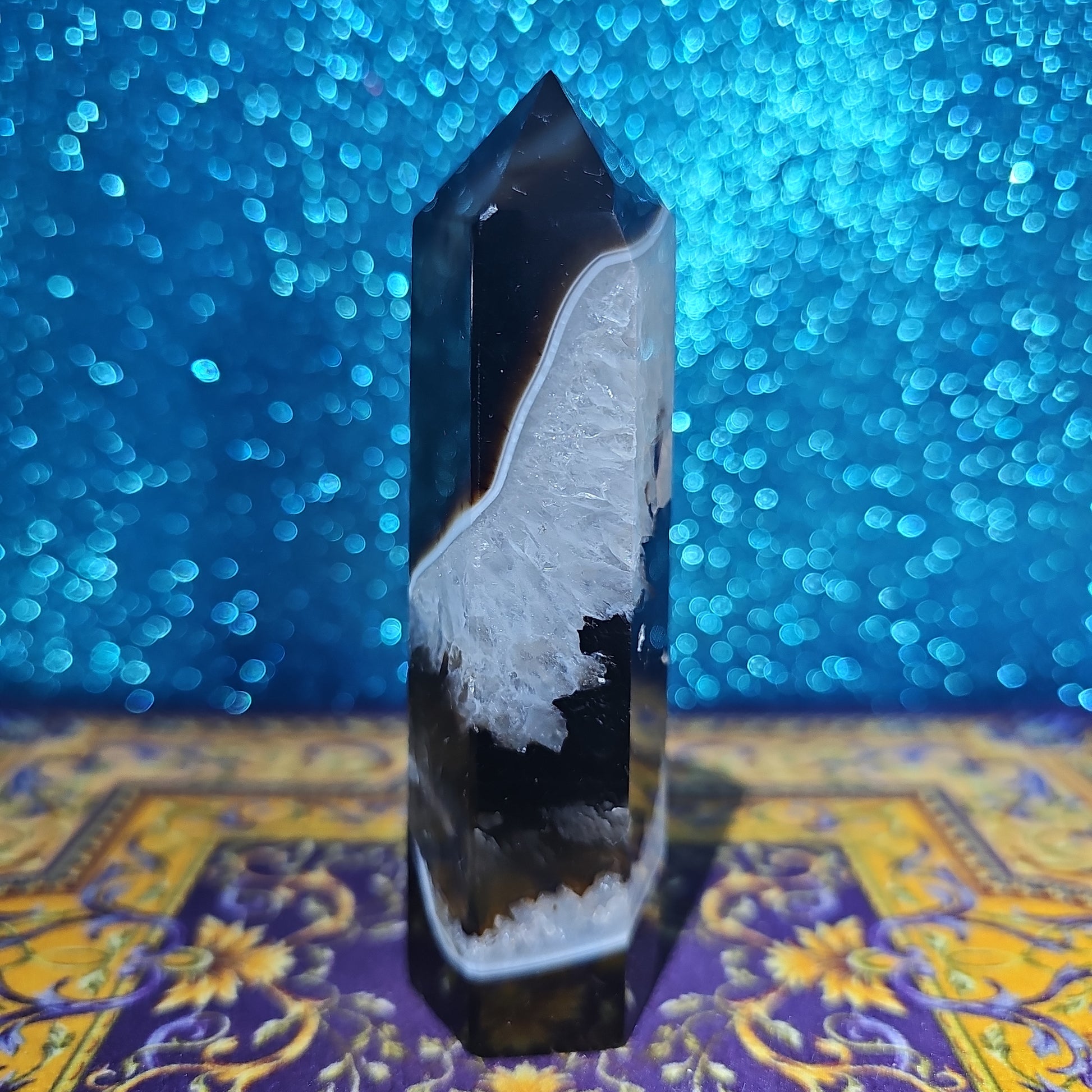 Behold the majestic Black Agate Tower, a timeless symbol of strength, protection, and grounding. Carved from the finest quality black agate, this towering obelisk exudes an aura of mystery and power.