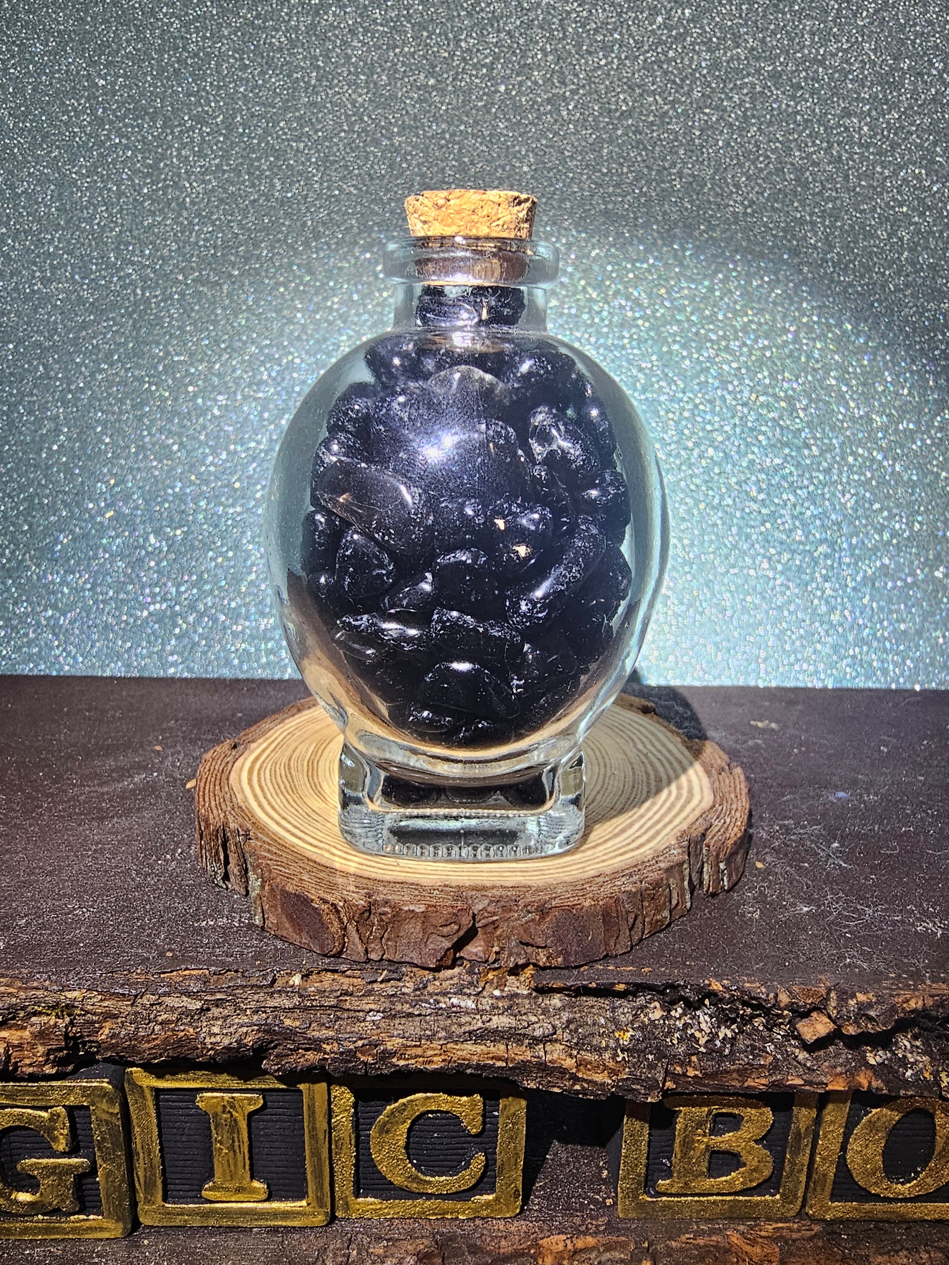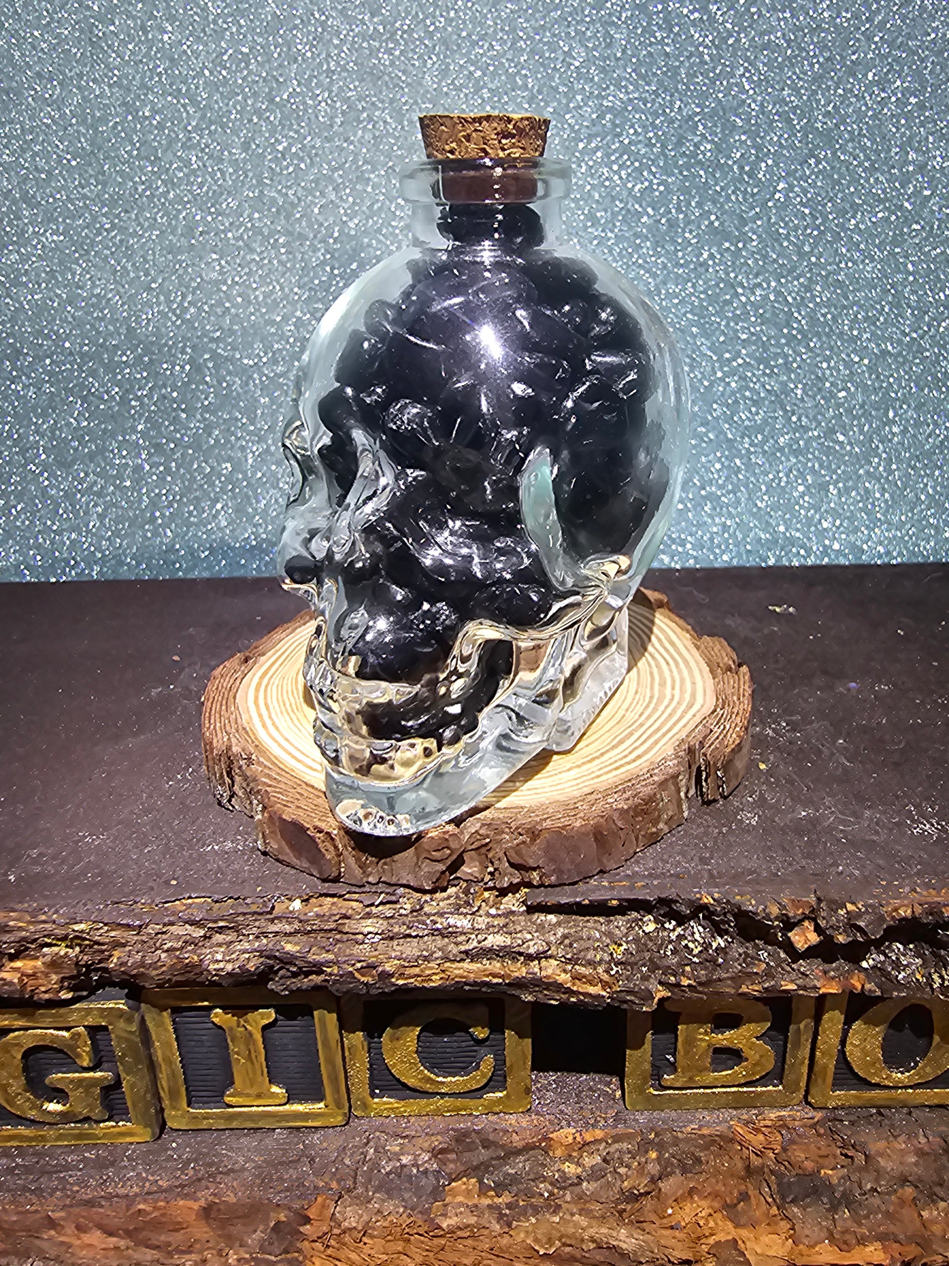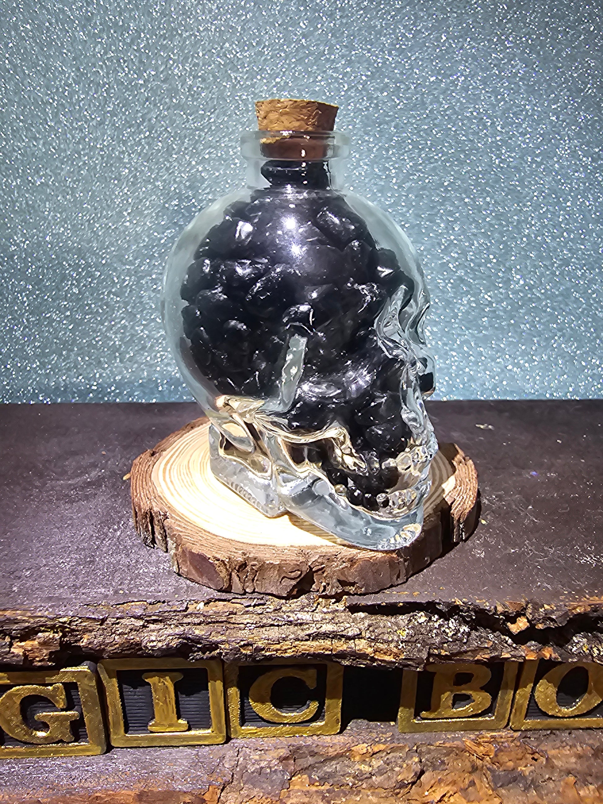 Each skull head is expertly designed and crafted from glass, then filled with polished black obsidian chips that enhance its depth and allure. The smooth, glossy surface and intricate details create a captivating display that exudes strength and protection.
