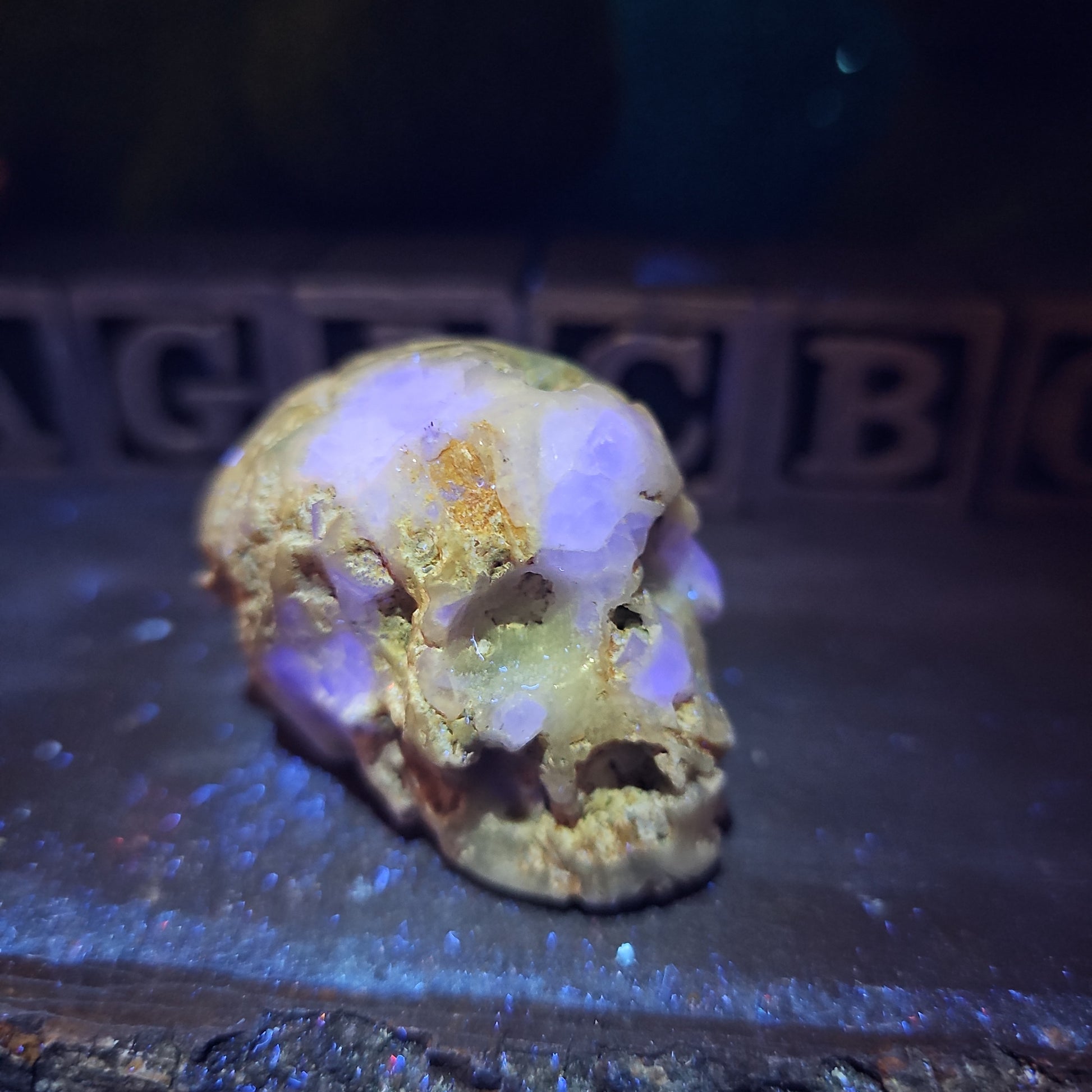 Unveil the enchanting blend of Caribbean Calcite and Fluorite with our captivating skull specimen. Handcrafted with meticulous attention to detail, this unique piece showcases the vibrant hues of Caribbean Calcite fused with the soothing energy of Fluorite.