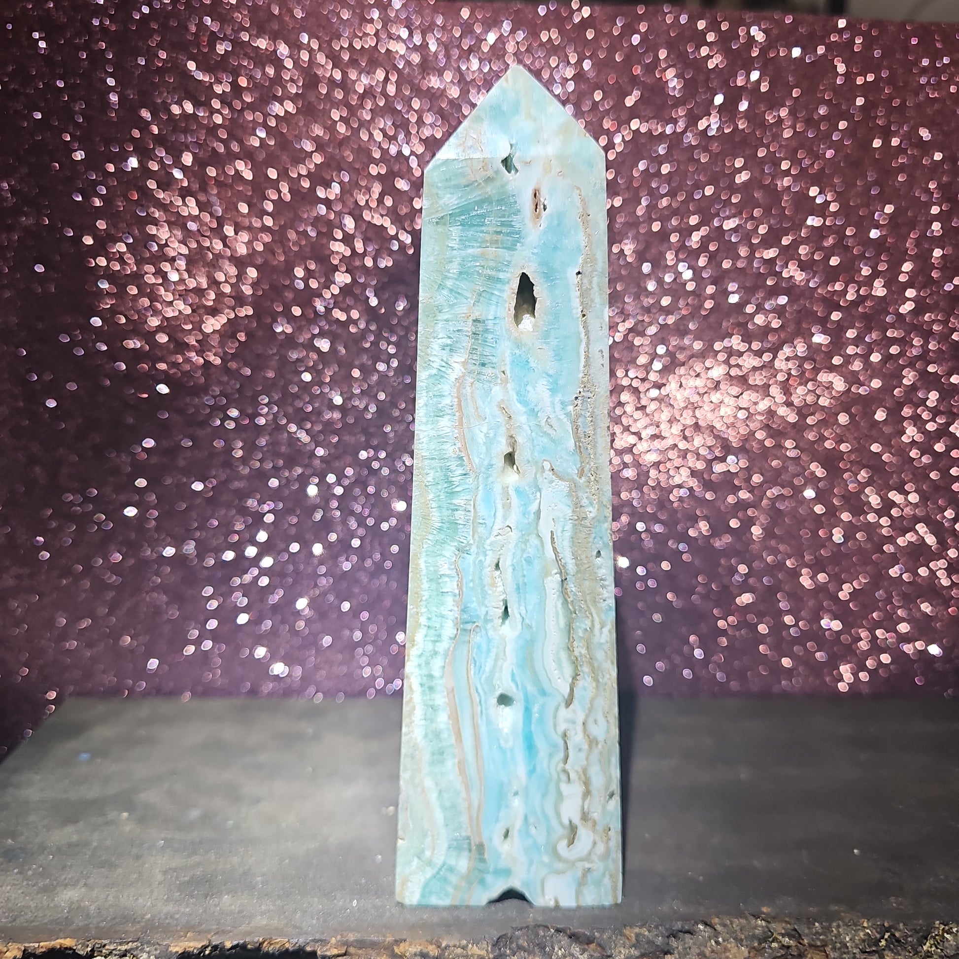 Introducing the stunning Caribbean Calcite Tower, a unique and eye-catching addition to any crystal collection. Mined from the tropical paradise of the Dominican Republic, this rare crystal is prized for its calming blue hues, reminiscent of the turquoise waters of the Caribbean sea.