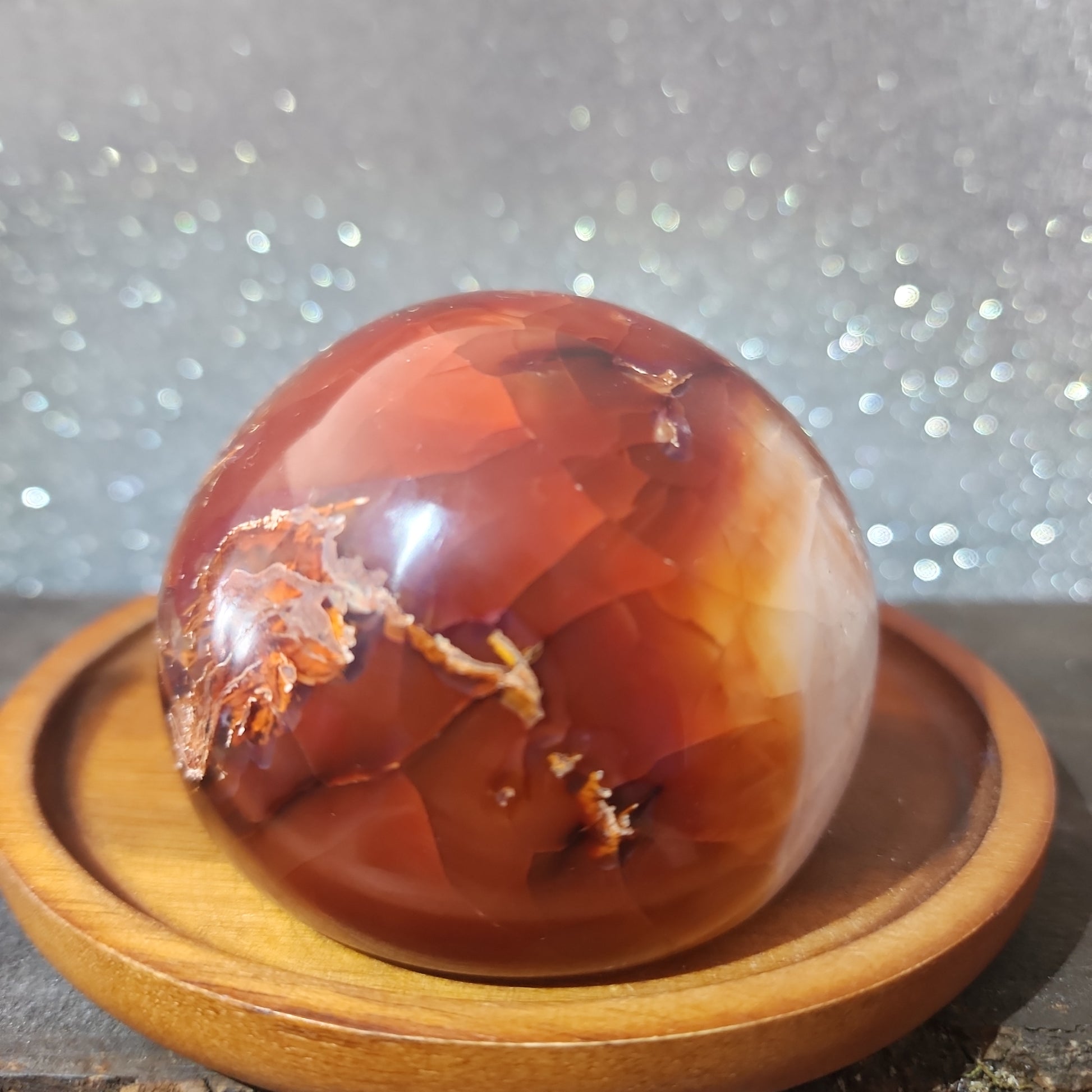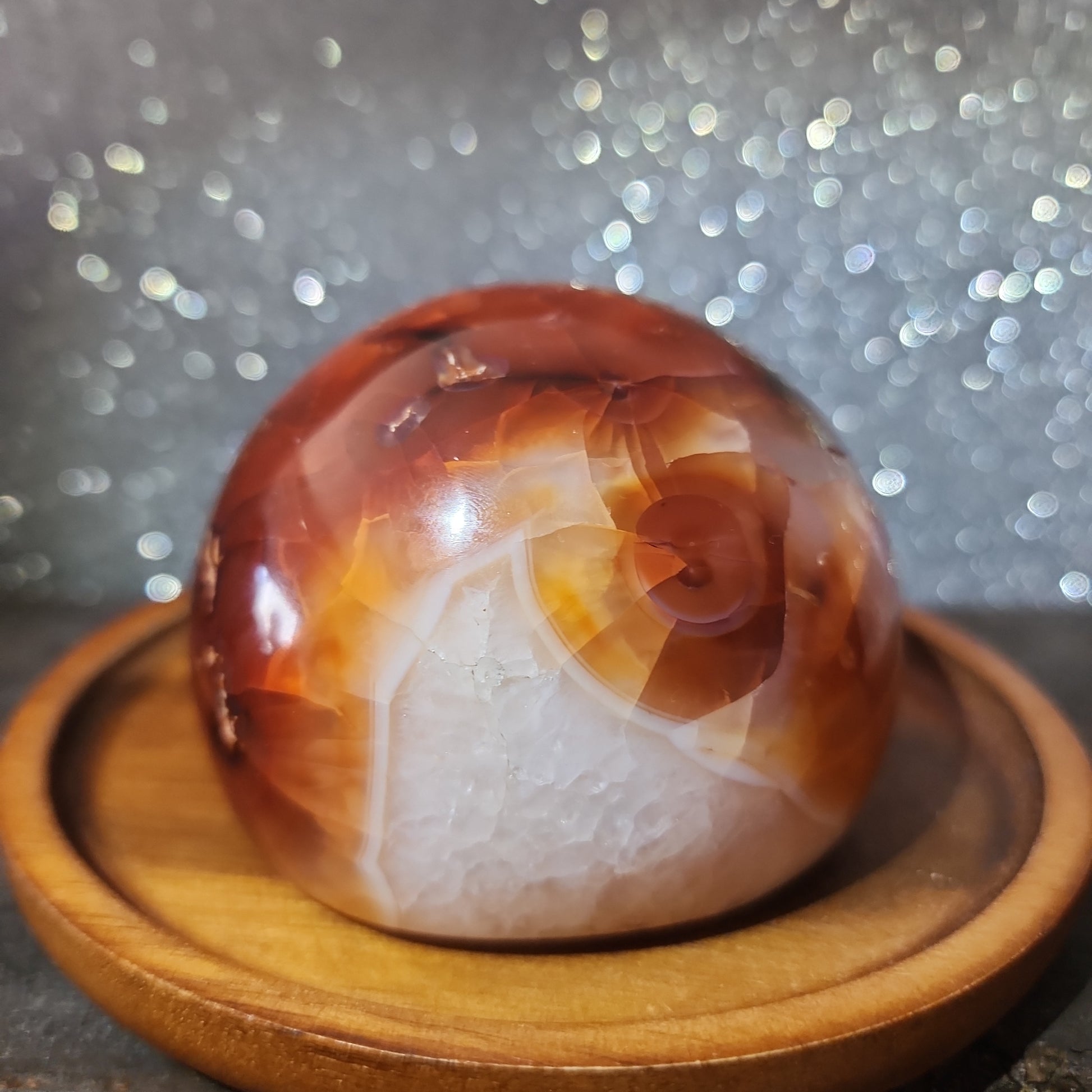Crafted from high-quality carnelian and agate, this sphere boasts a rich and warm color palette, with deep reds and browns mingling with soft oranges and yellows. Its polished surface shines in the light, revealing intricate patterns and lines that are unique to each sphere.