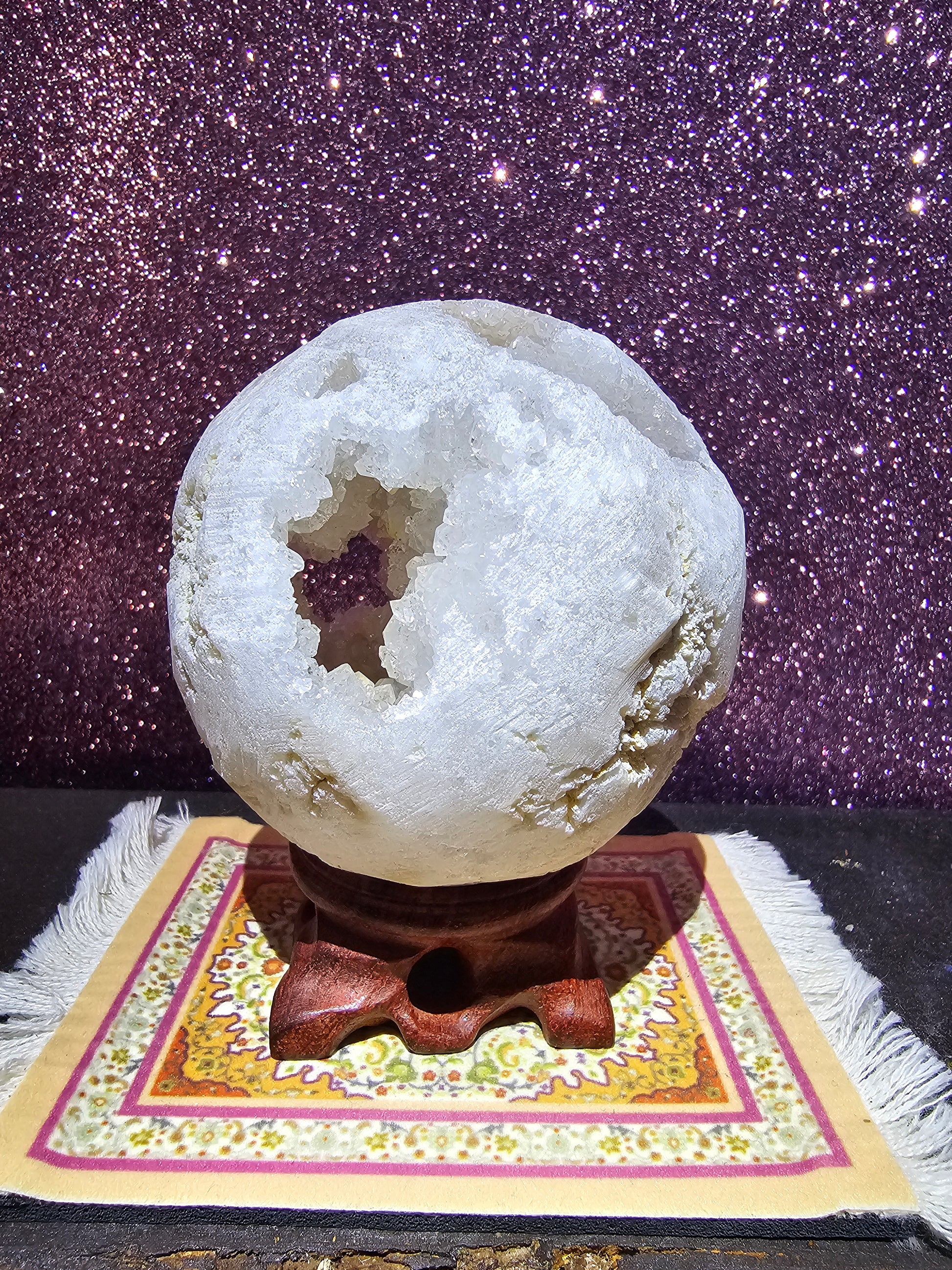 A Clear Quartz Druzy Sphere is a spherical-shaped crystal made from clear quartz that has a druzy coating on its surface. Druzy refers to a layer of tiny crystals that form on the surface of the quartz, giving it a sparkling and glittering appearance.