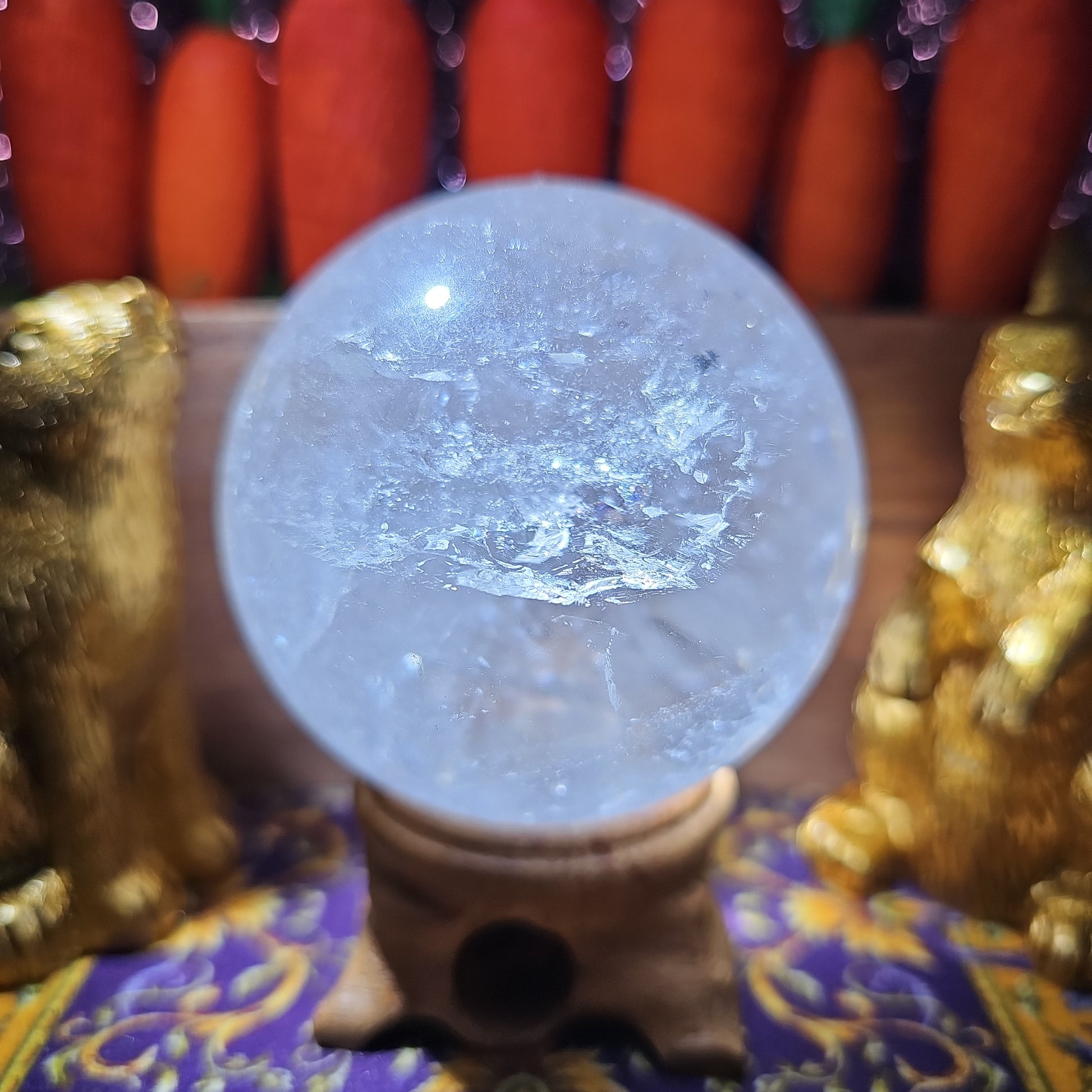 Clear quartz is a versatile and highly sought-after crystal that can be used for a wide range of purposes, including meditation, spiritual development, and energy work. It is believed to help clear the mind, enhance intuition, and promote overall well-being. With its pure and transparent appearance, this clear quartz sphere is sure to enhance the energy of any space it's placed in.