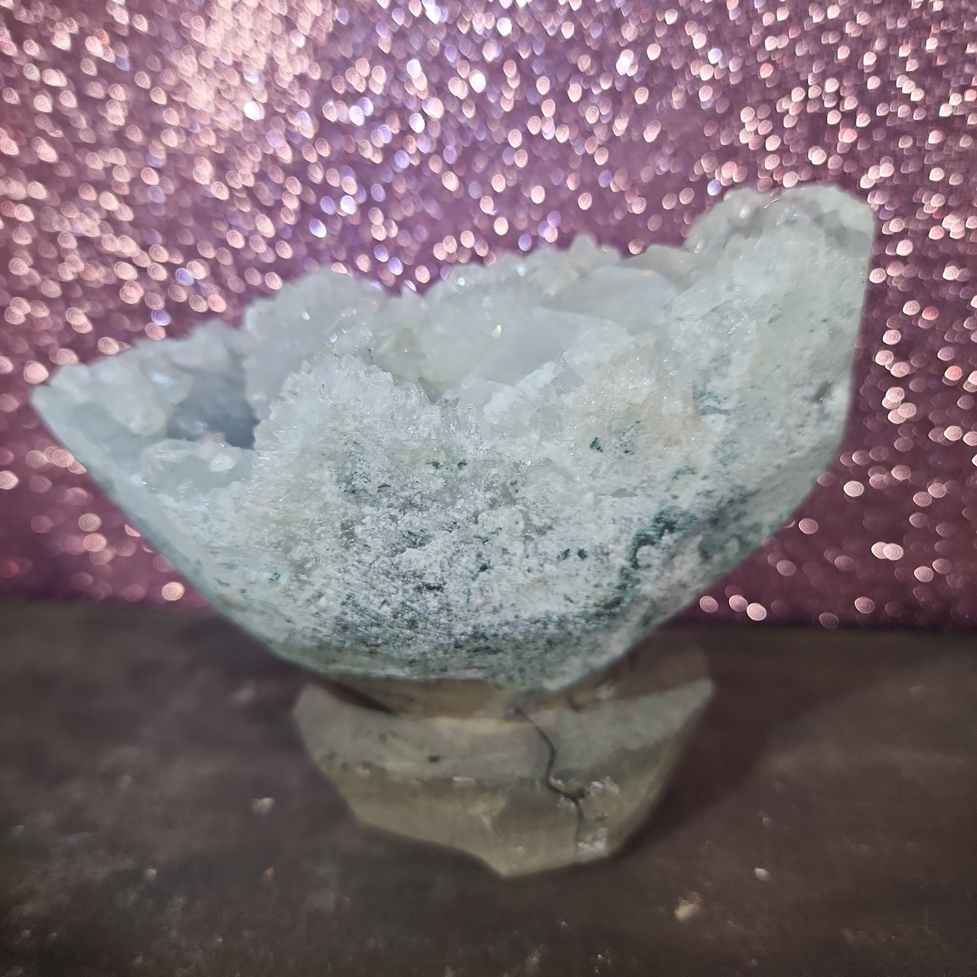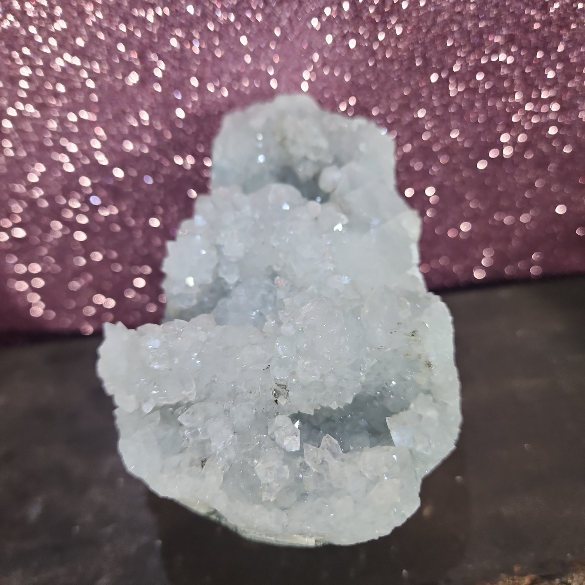 Gaze upon the Diamond Apophylite Specimen, and you'll be immediately drawn to its radiant allure. The delicate, pyramid-like apophylite crystals, reminiscent of glistening diamonds, delicately blanket the matrix, creating a captivating contrast between the natural sparkle and the subdued backdrop. The specimen's pristine clarity and reflective qualities give it a distinct brilliance, captivating the eye from every angle.