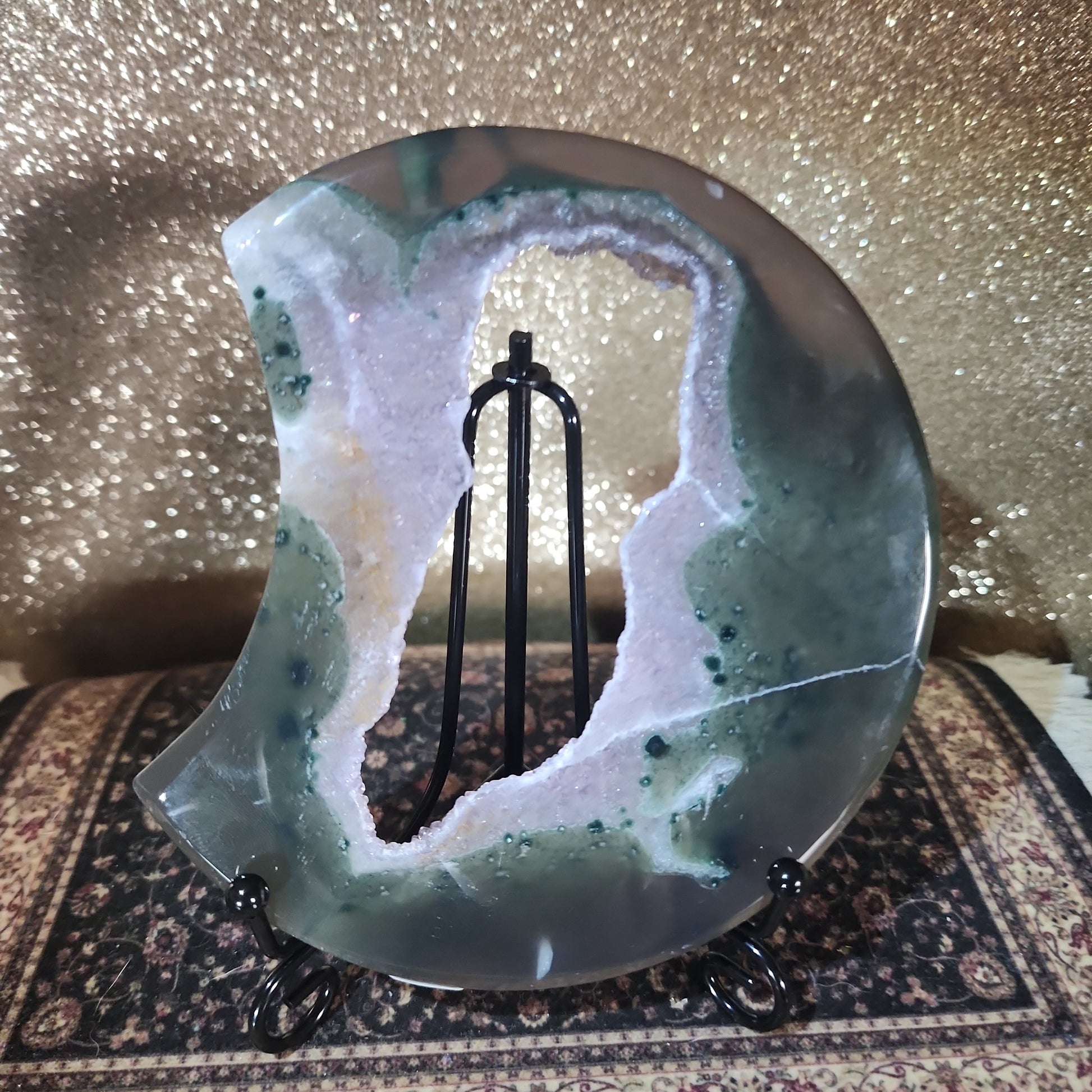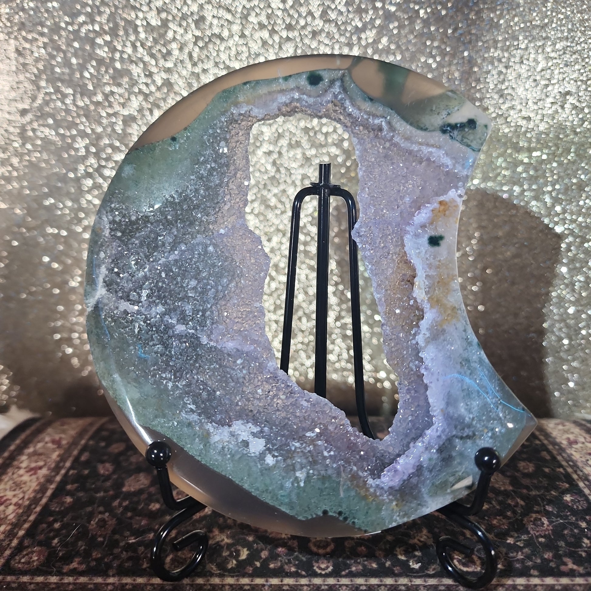 Introducing the stunning Druzy Amethyst Moon, a captivating and enchanting piece that brings the beauty of nature into your living space. This unique creation combines the allure of amethyst, known for its soothing and protective properties, with the mesmerizing charm of a moon-shaped druzy formation.