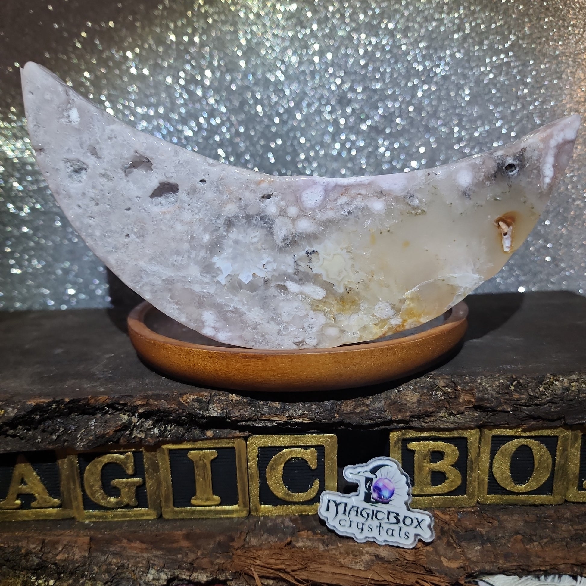 This exquisite half moon carving is made from natural flower agate, a gemstone known for its stunning patterns resembling blooming flowers. The carving showcases the unique beauty of the stone with its intricate layers of pastel pinks, creamy whites, and delicate greens. The smooth, polished surface of the carving reveals the stone's intricate patterns, which are sure to mesmerize anyone who beholds it.