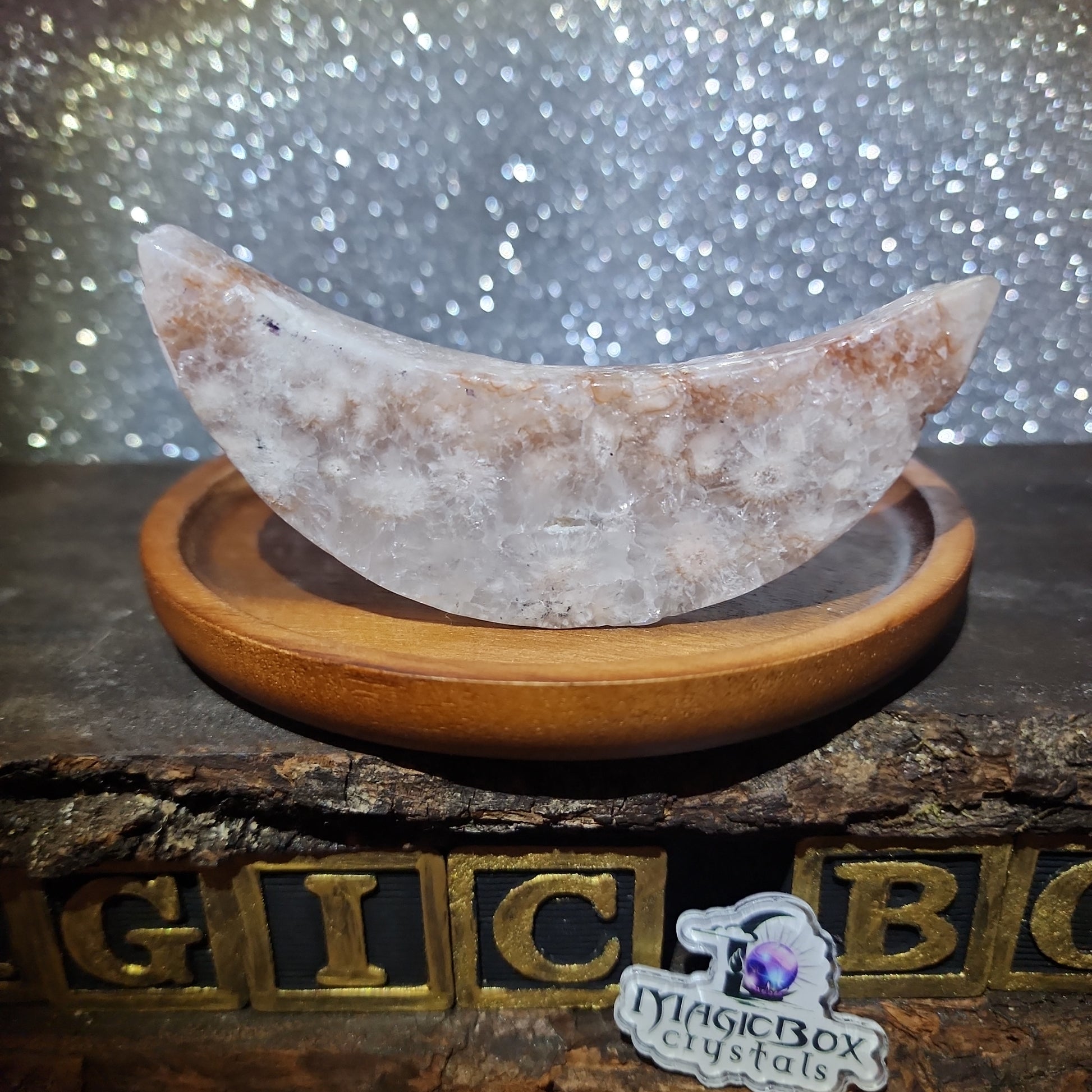 This exquisite half moon carving is made from natural flower agate, a gemstone known for its stunning patterns resembling blooming flowers. The carving showcases the unique beauty of the stone with its intricate layers of pastel pinks, creamy whites, and delicate greens. The smooth, polished surface of the carving reveals the stone's intricate patterns, which are sure to mesmerize anyone who beholds it.