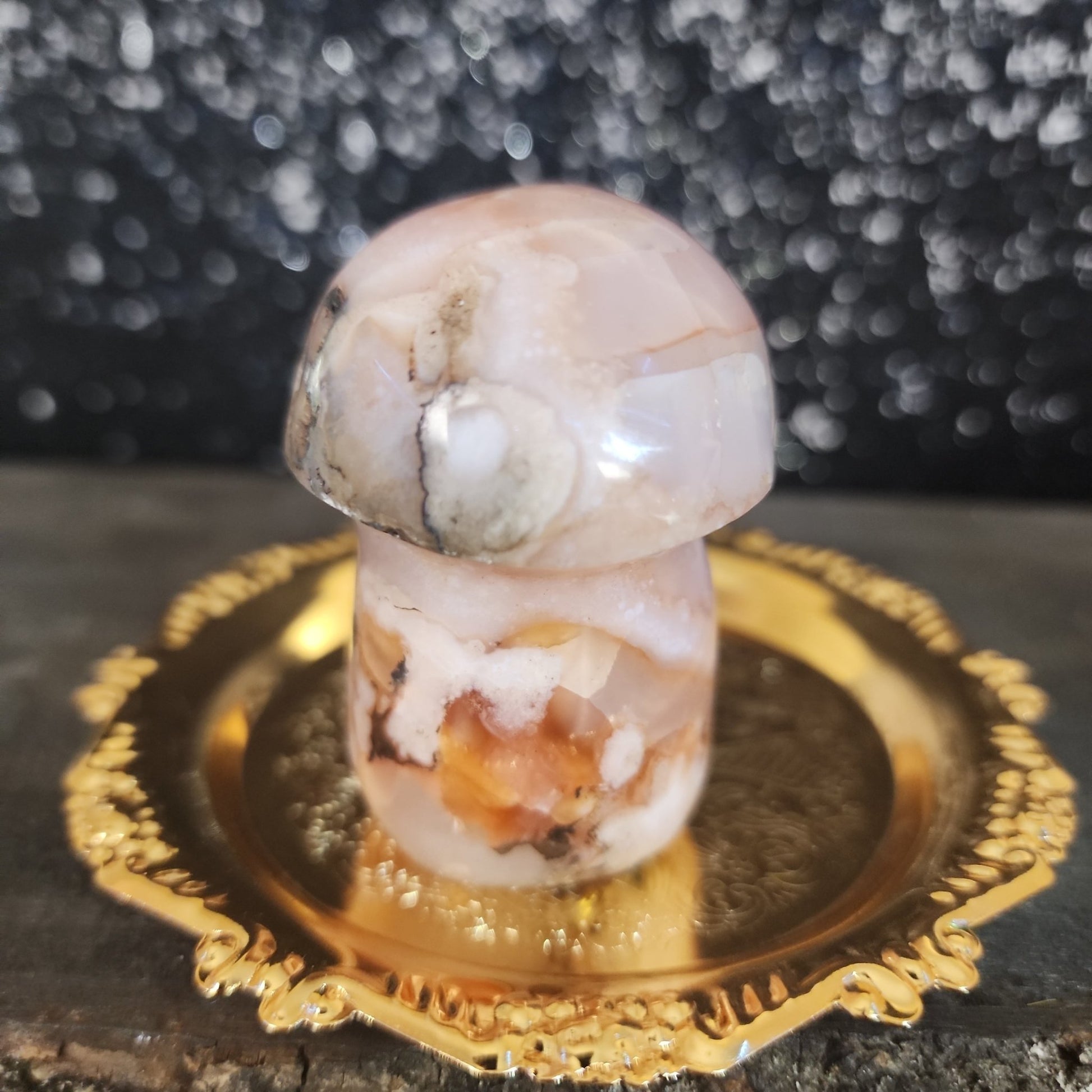 Flower Agate Mushroom is a beautiful and unique crystal specimen that is carved into a mushroom shape. Flower Agate is a relatively new type of Agate discovered in Madagascar, known for its delicate, flowery patterns that resemble cherry blossoms.