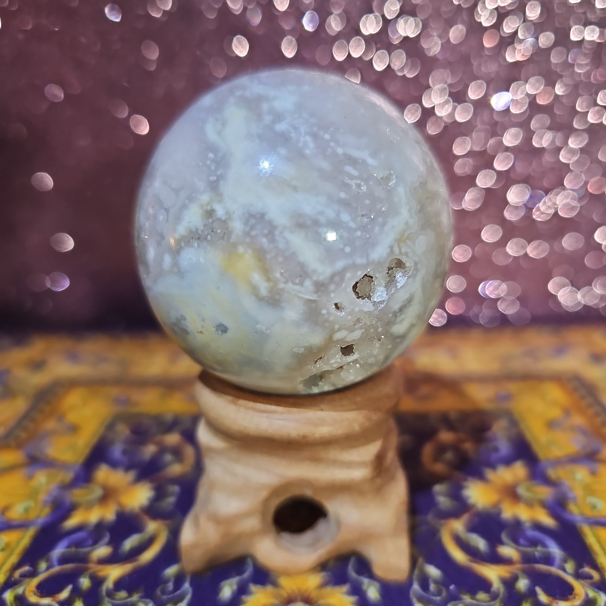 Introducing the mesmerizing Flower Agate Sphere! Crafted from exquisite natural stone, this sphere showcases delicate floral patterns that gracefully bloom across its surface. Each sphere is a unique work of art, radiating soothing energies and bringing a sense of tranquility to any space.
