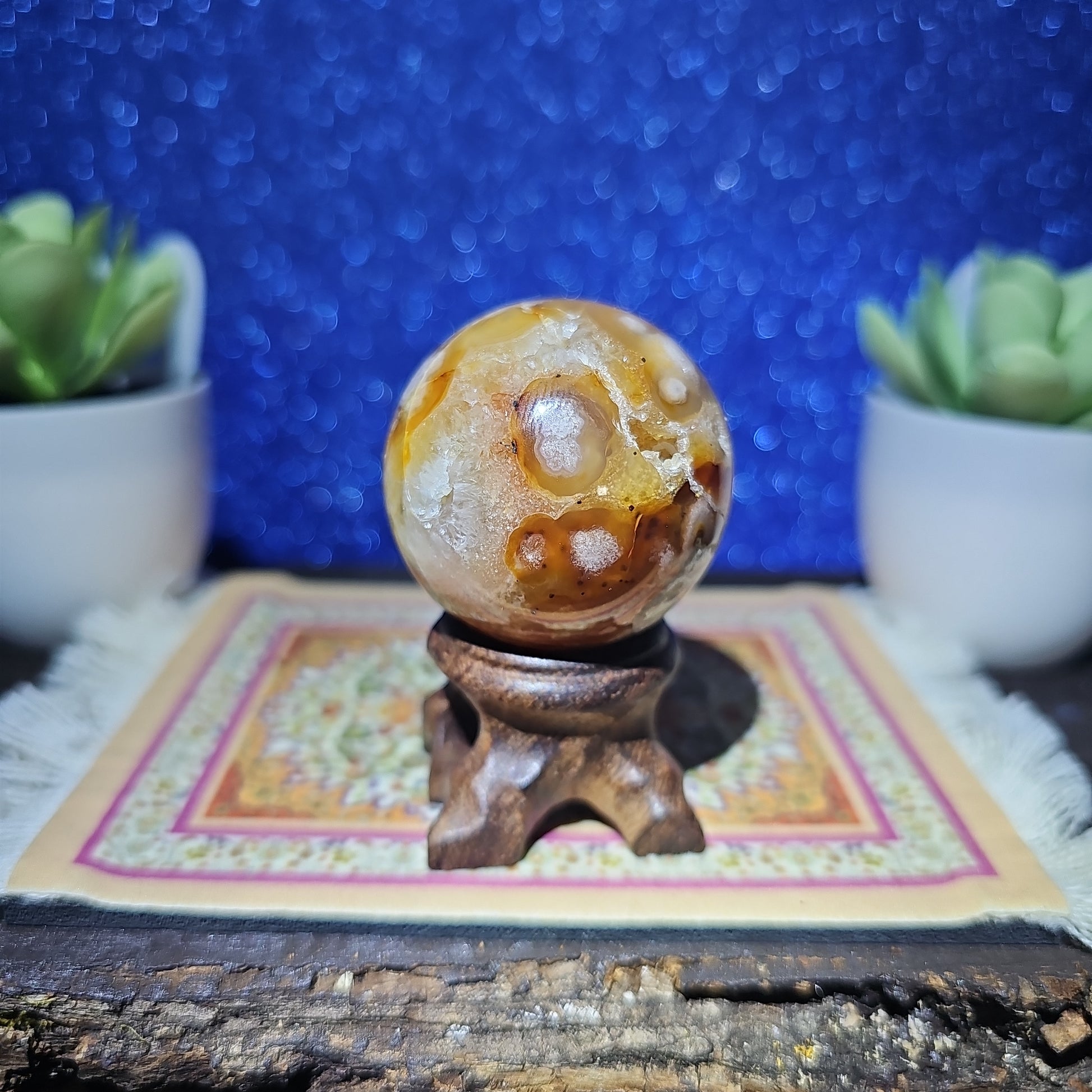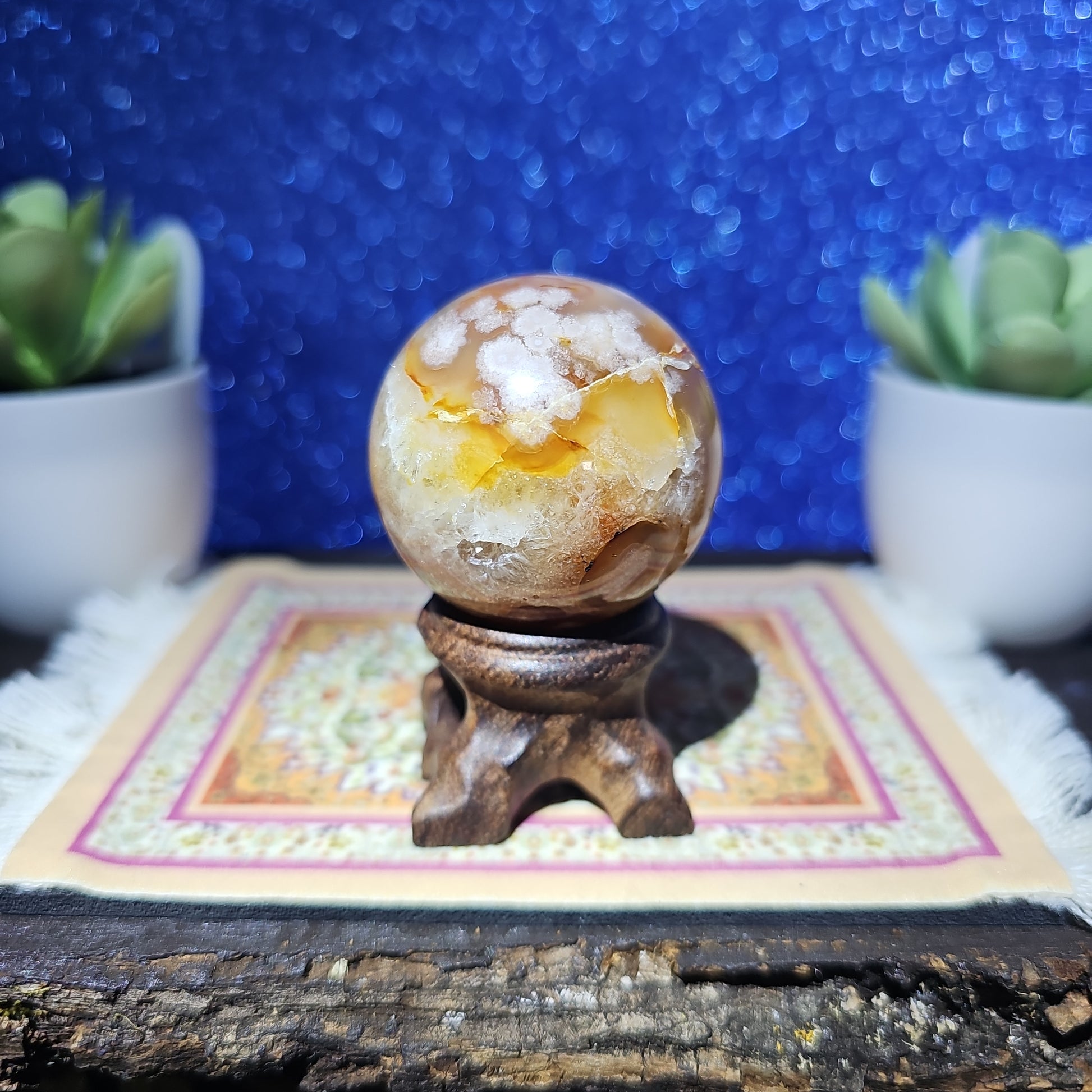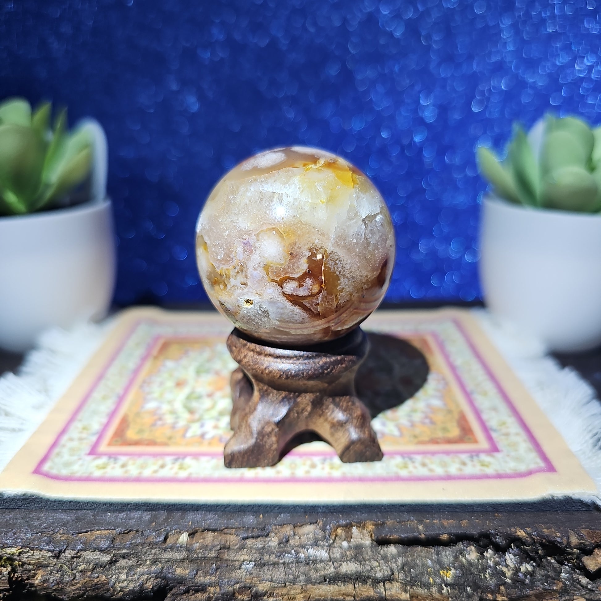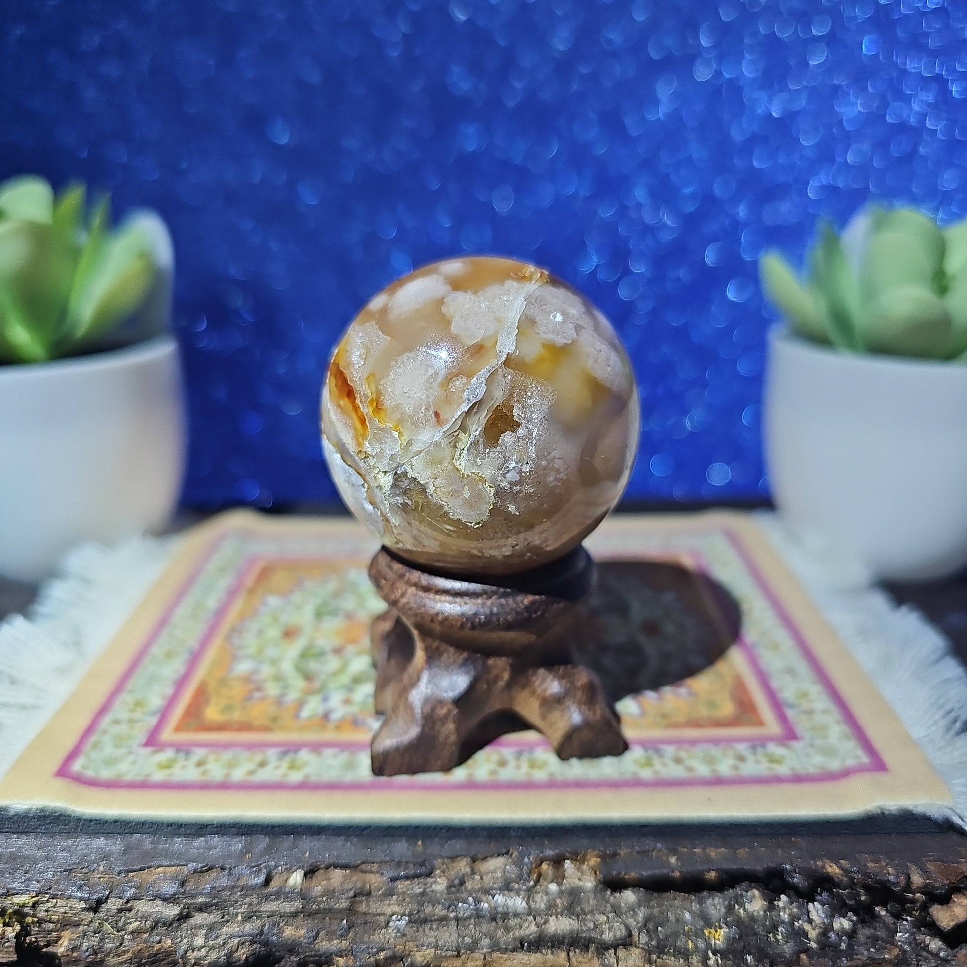 Introducing the mesmerizing Flower Agate Sphere! Crafted from exquisite natural stone, this sphere showcases delicate floral patterns that gracefully bloom across its surface. Each sphere is a unique work of art, radiating soothing energies and bringing a sense of tranquility to any space.