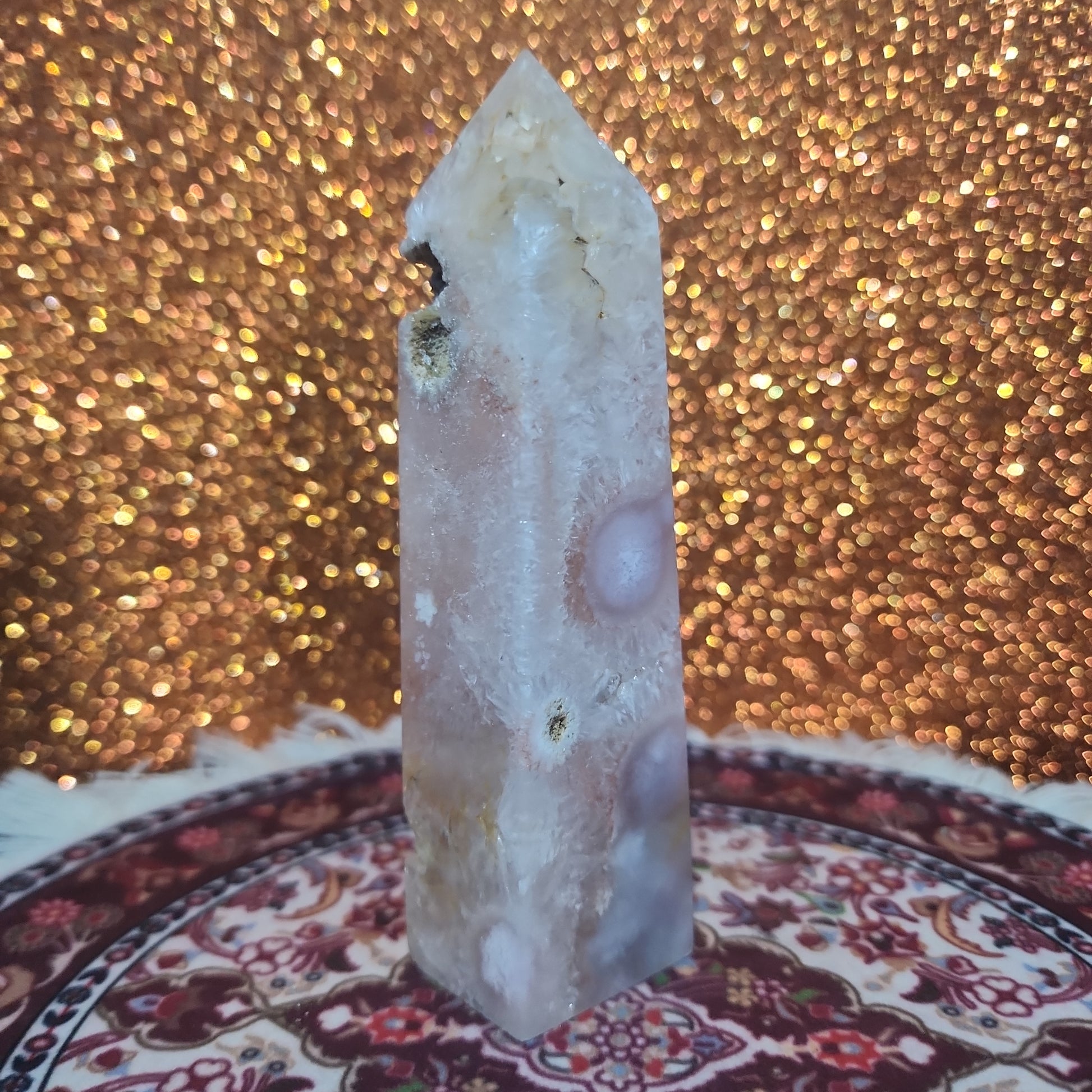 Introducing the stunning Flower Agate Tower, a unique and mesmerizing addition to any crystal collection. This tower is crafted from natural Flower Agate, a rare and beautiful variety of agate that is known for its captivating floral patterns and vibrant hues.