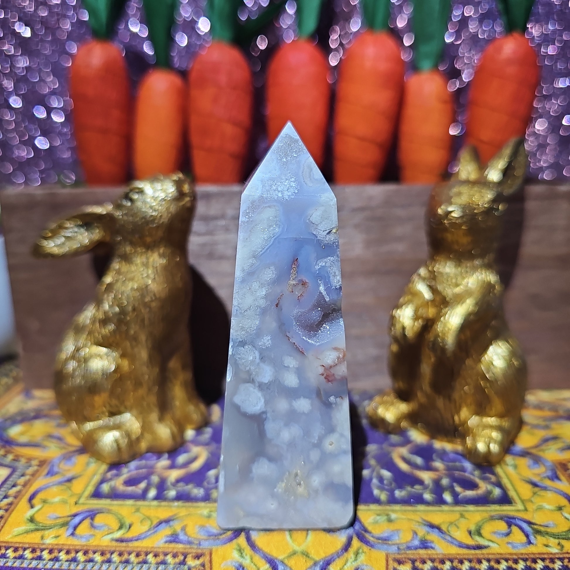 Introducing the stunning Flower Agate Tower, a unique and mesmerizing addition to any crystal collection. This tower is crafted from natural Flower Agate, a rare and beautiful variety of agate that is known for its captivating floral patterns and vibrant hues.