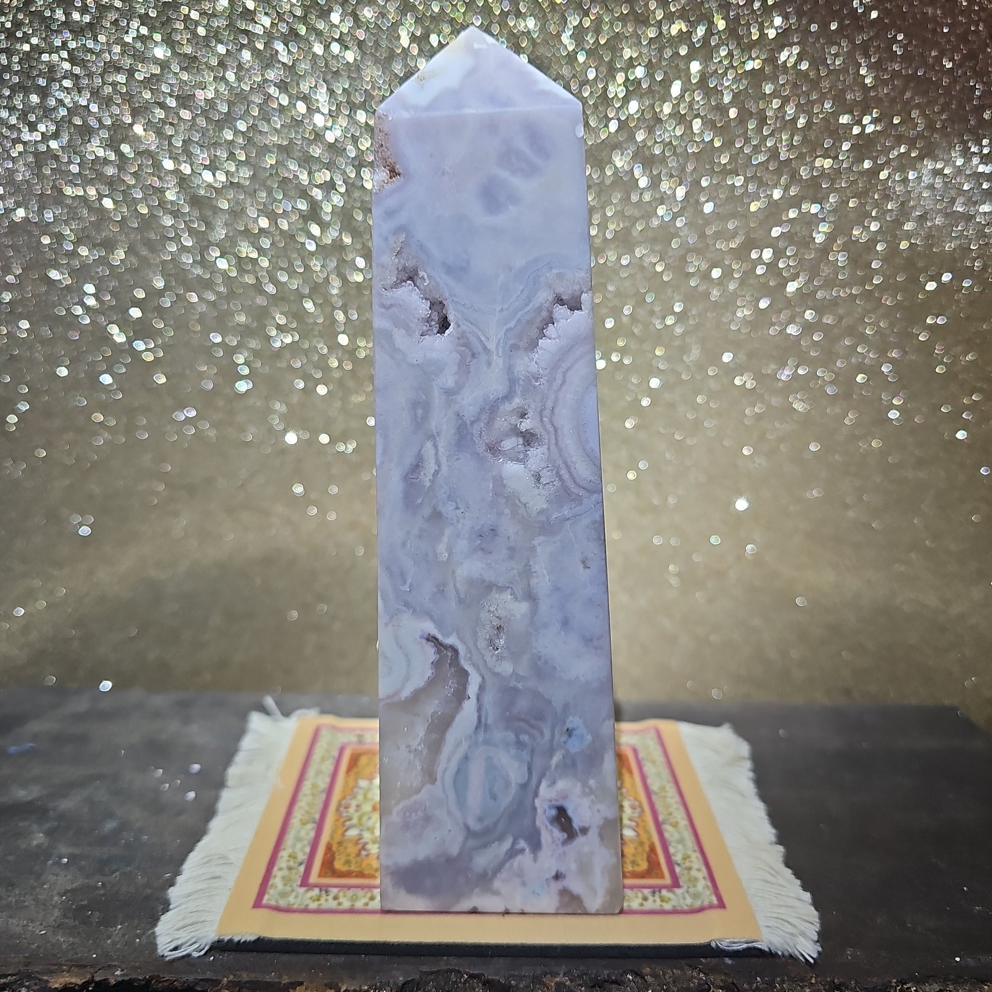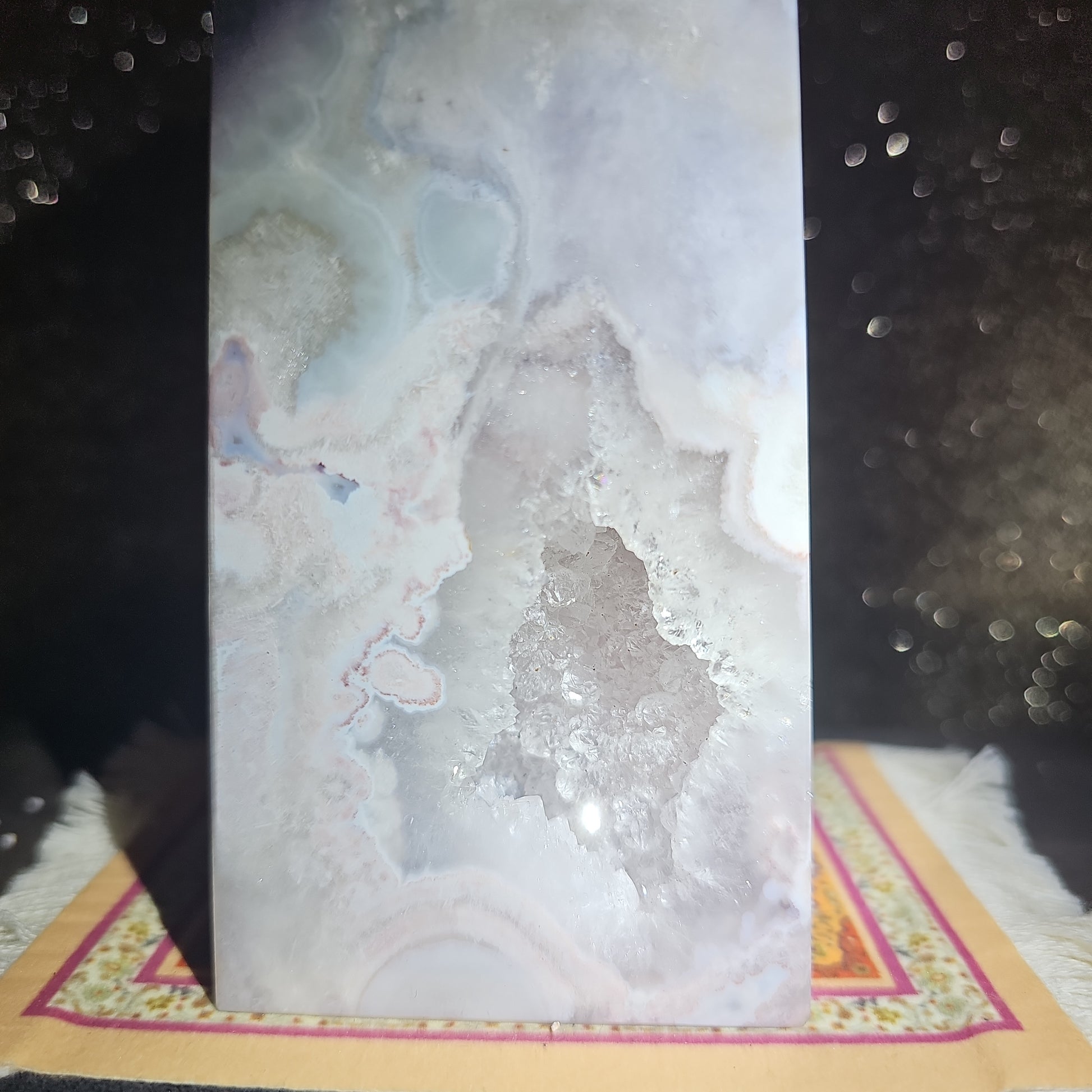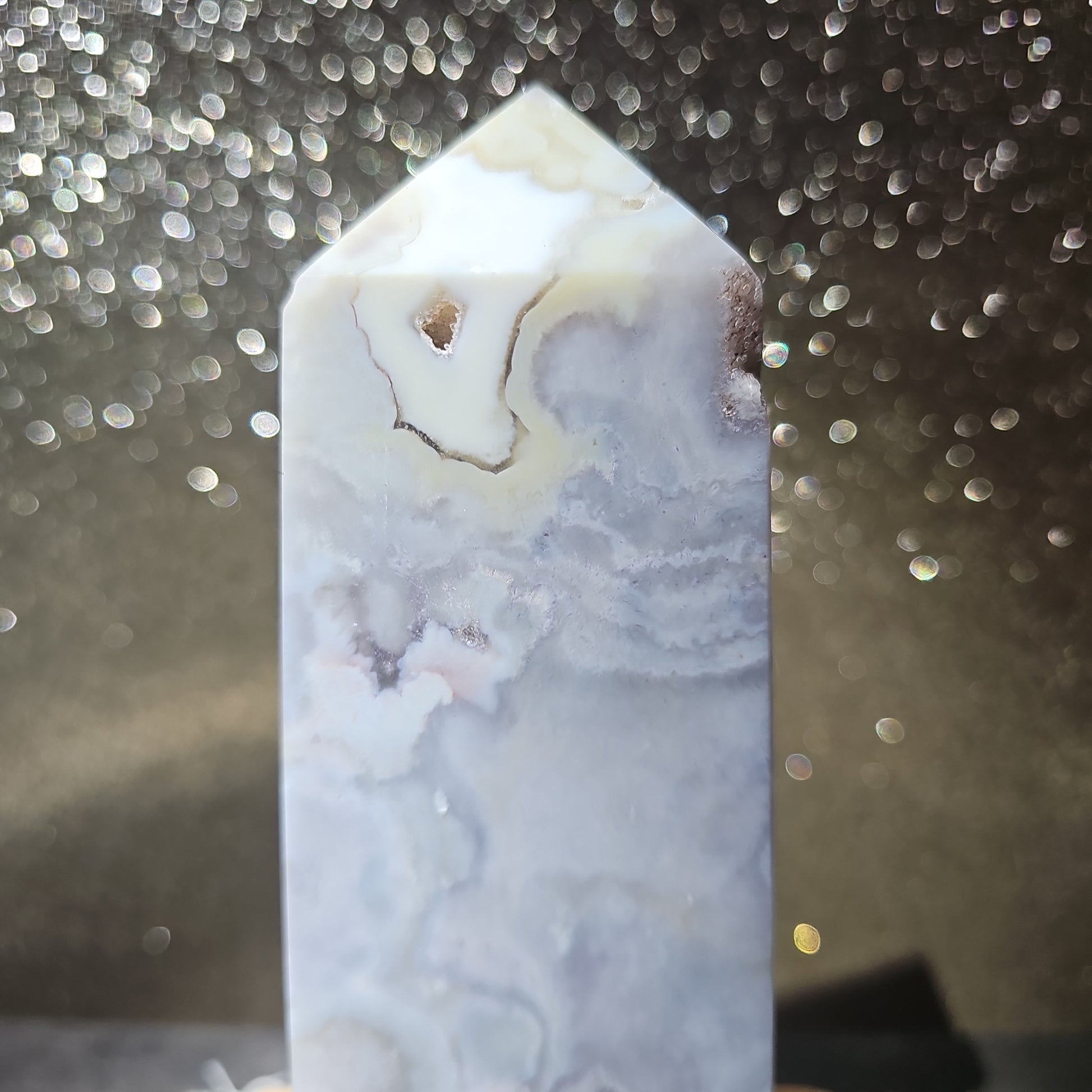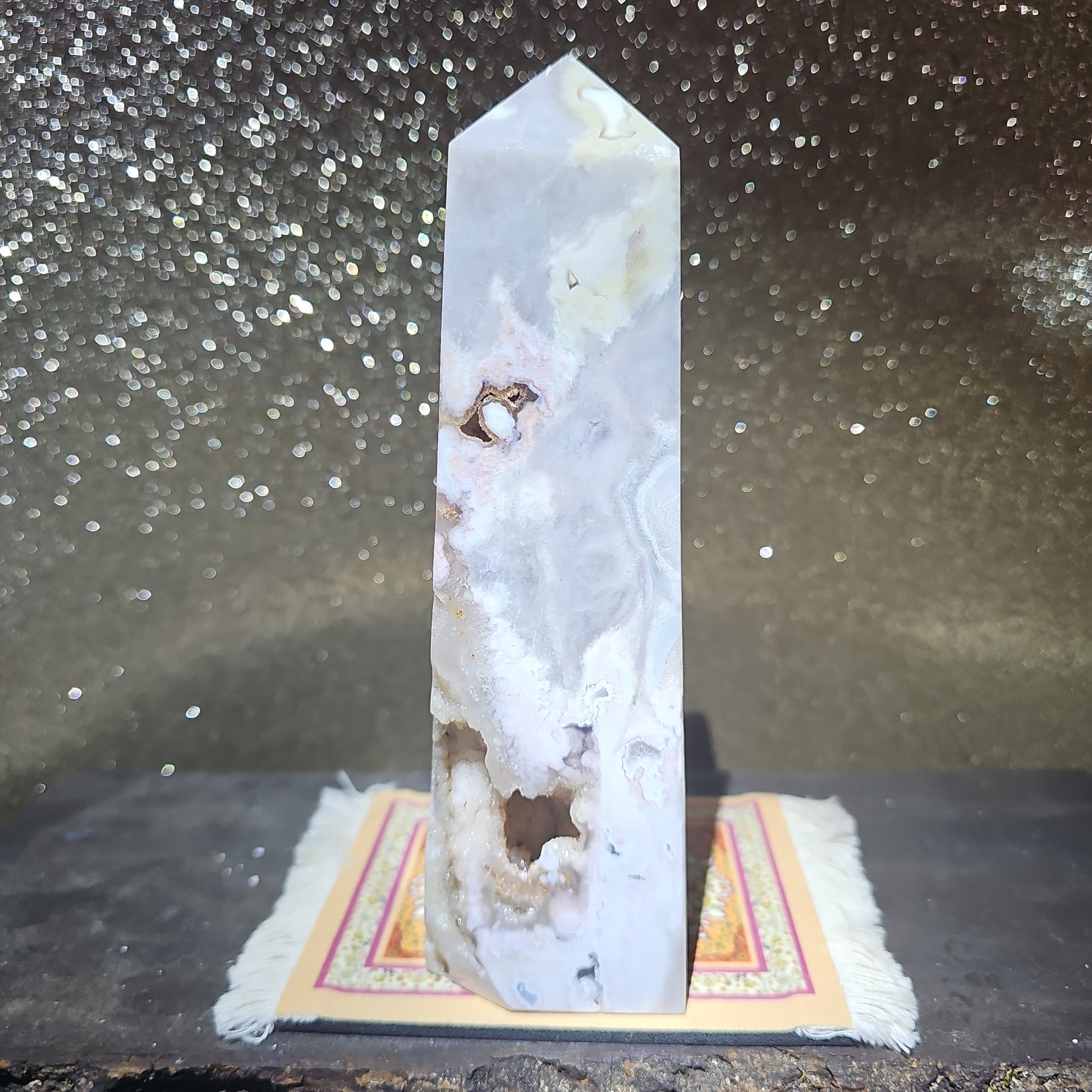 Introducing the stunning Flower Agate Tower, a unique and mesmerizing addition to any crystal collection. This tower is crafted from natural Flower Agate, a rare and beautiful variety of agate that is known for its captivating floral patterns and vibrant hues.
