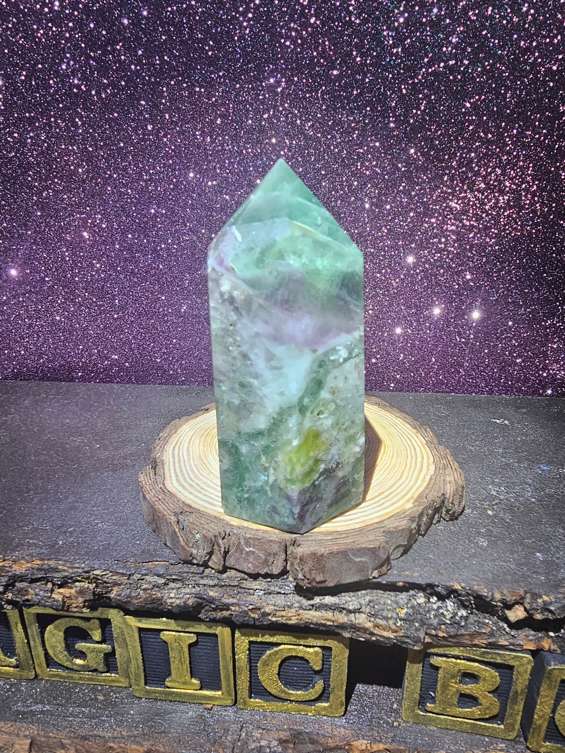 Fluorite is known for its stunning range of colors, from deep purple to vibrant green, and this tower showcases those colors perfectly. Its smooth, polished surface and striking geometric shape make it a perfect centerpiece for your desk, shelf, or meditation space.
