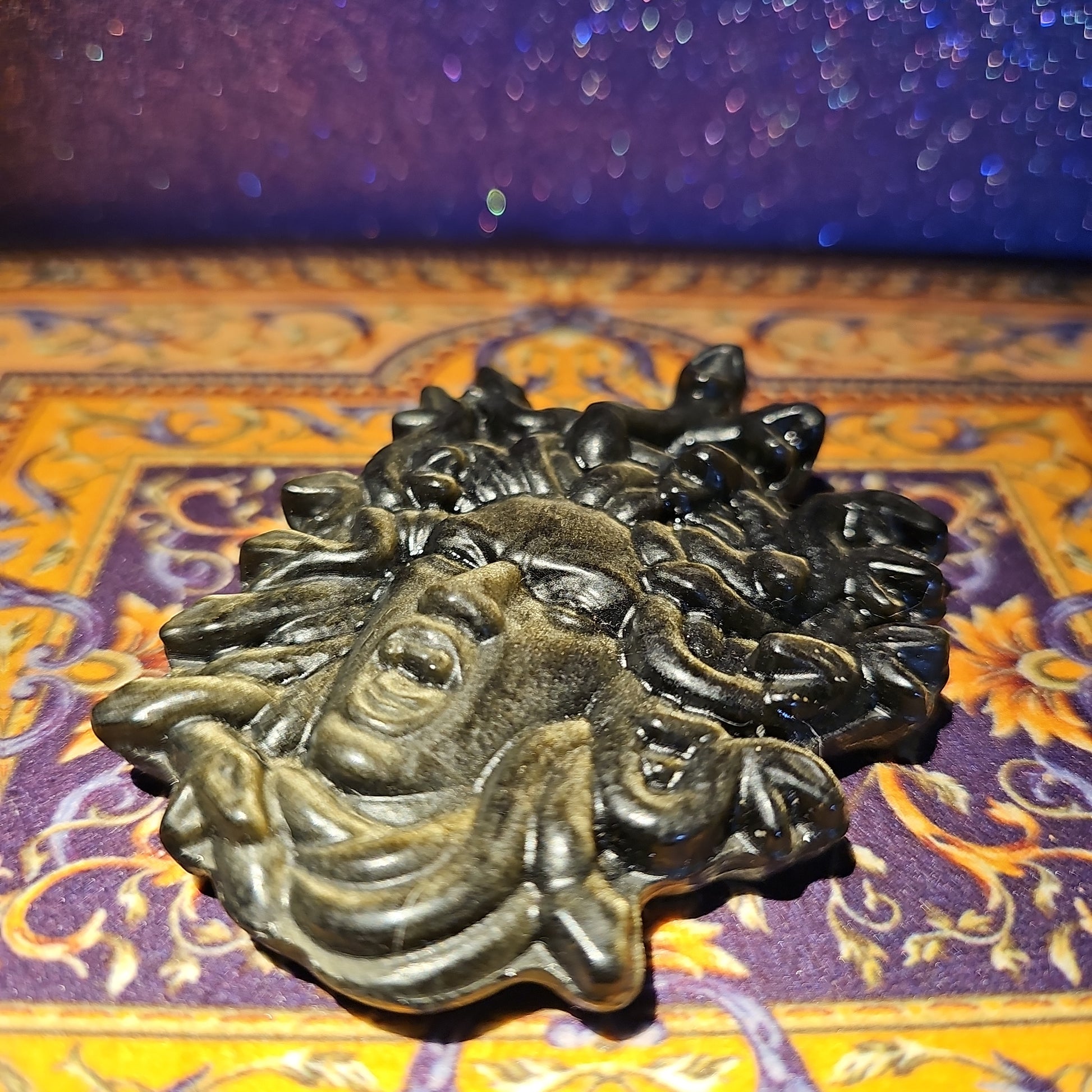 Golden obsidian, known for its dark, golden sheen and grounding properties, takes on a mythical form with the intricately carved Medusa Head. The snake-like details and intense gaze evoke the essence of Medusa, adding an element of mystique to the elegant beauty of golden obsidian.