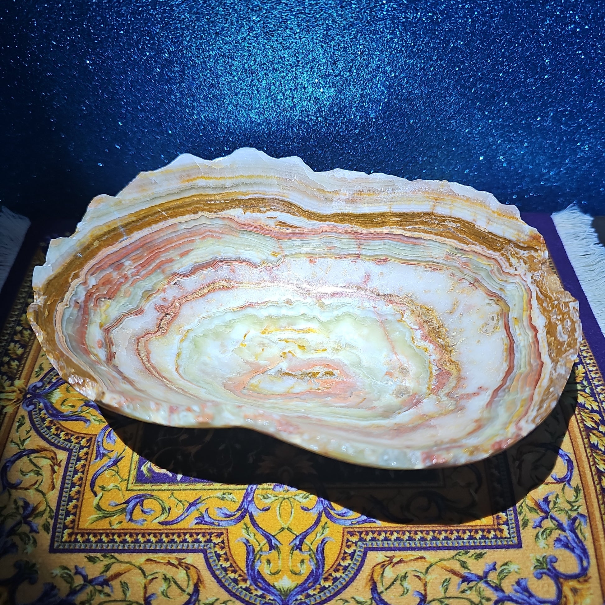 Green onyx is renowned for its soothing and calming energy, making it the perfect choice for a vessel that embodies tranquility and serenity. Whether used as a decorative accent or a functional piece, this bowl brings a touch of natural beauty and refinement to any space.