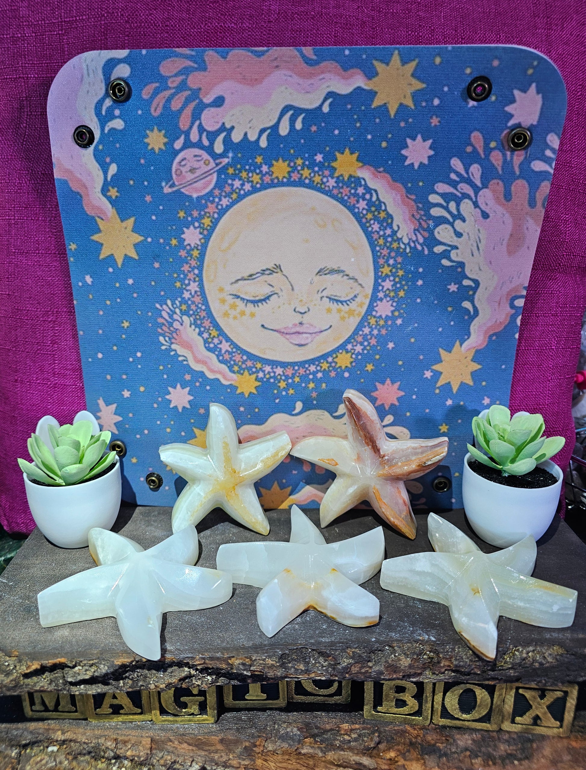 Bring the soothing energy of the sea into your home with our Green Onyx Starfish Set. This exquisite collection features five beautifully carved starfish figurines crafted from the finest green onyx, along with a soft bowl for display.