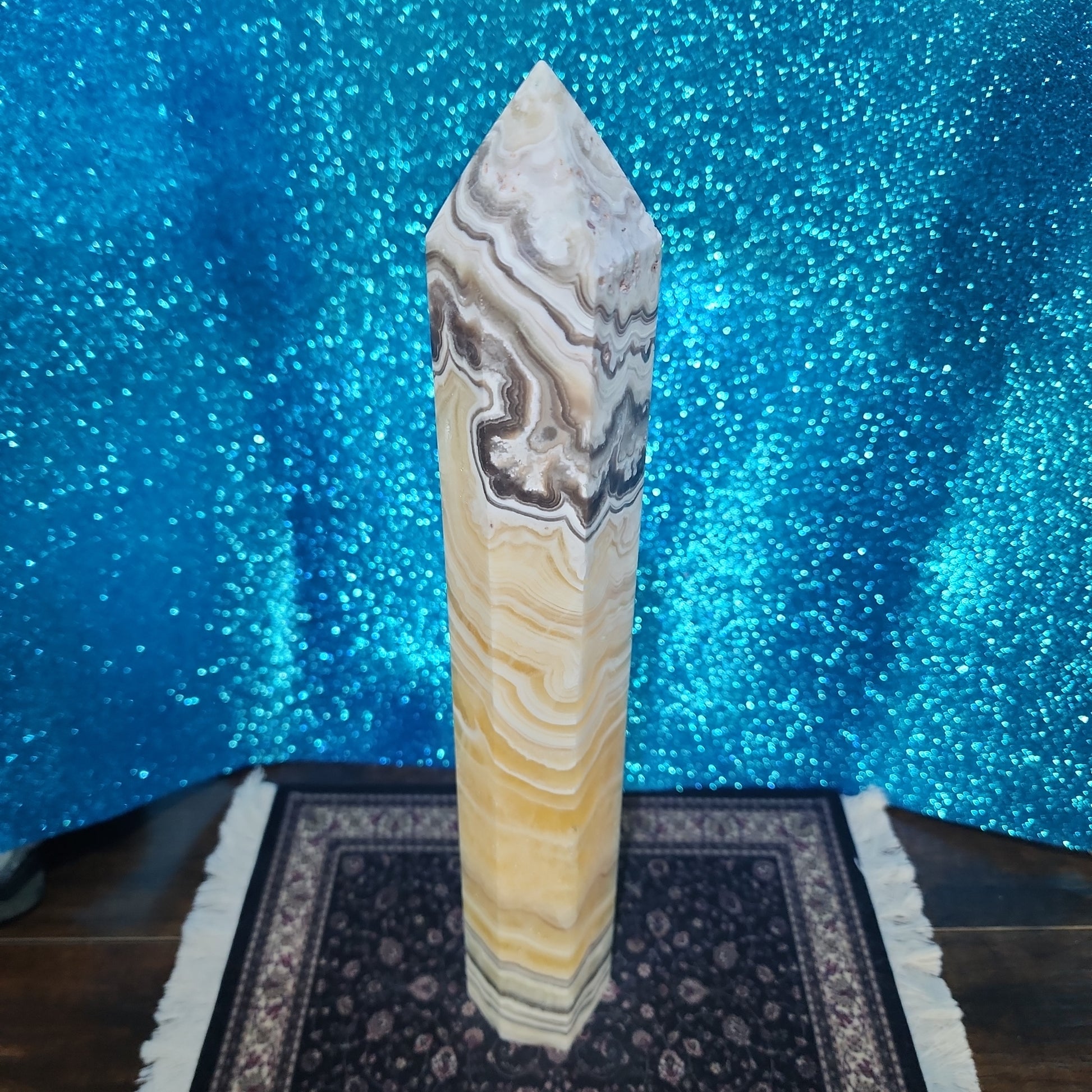 The Honey Calcite Tower stands tall and proud, showcasing the unique natural patterns and formations that make each piece one-of-a-kind. Its smooth, polished surface reflects light, creating a captivating display that catches the eye and uplifts the spirit.