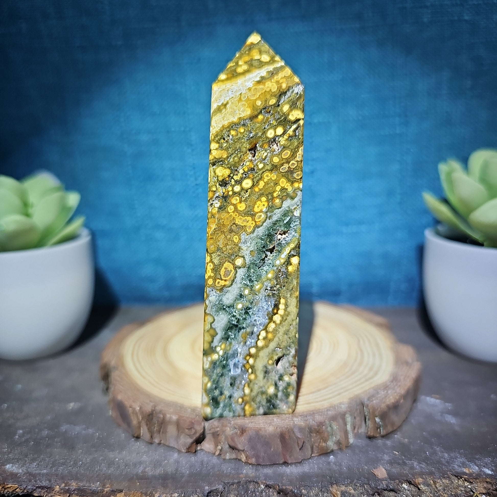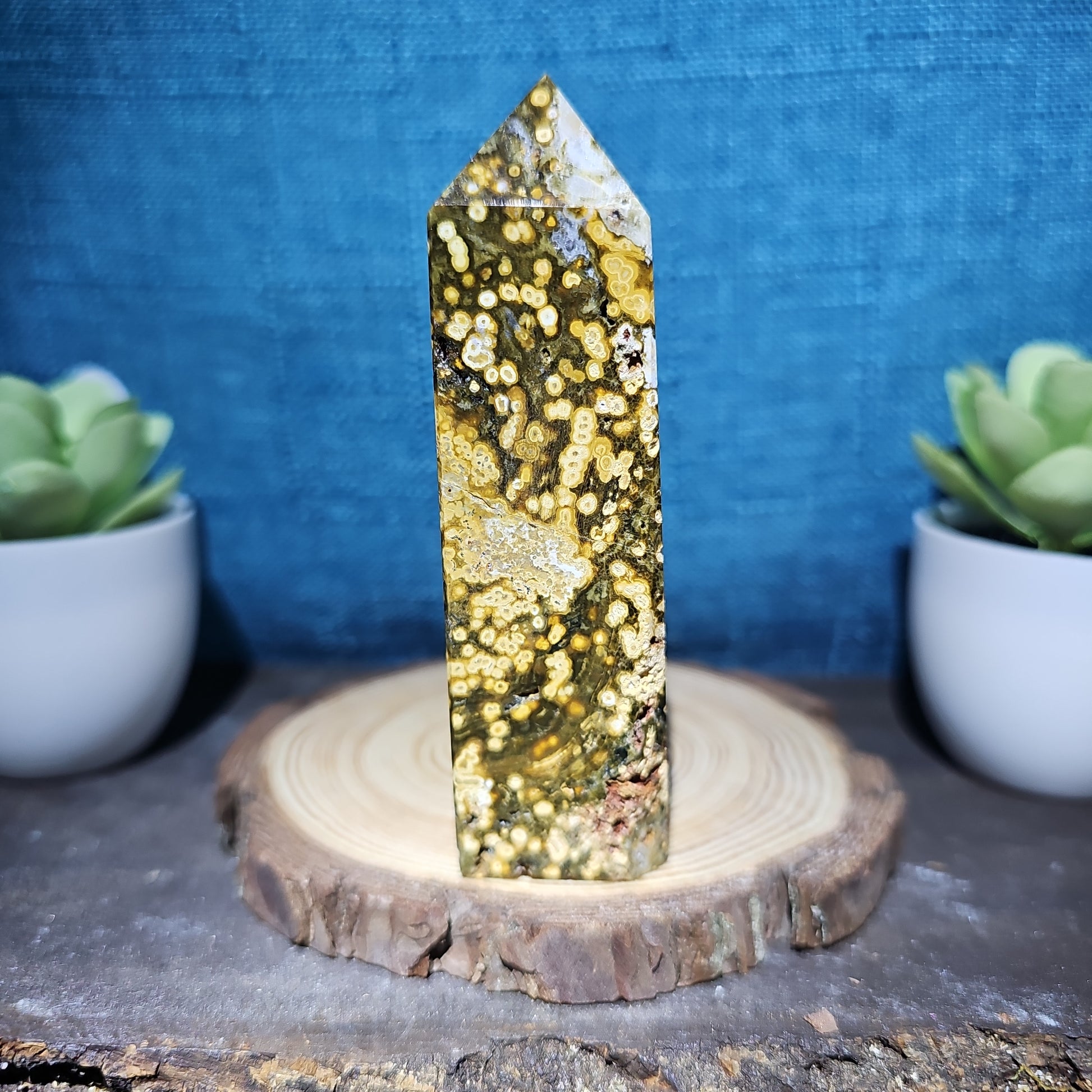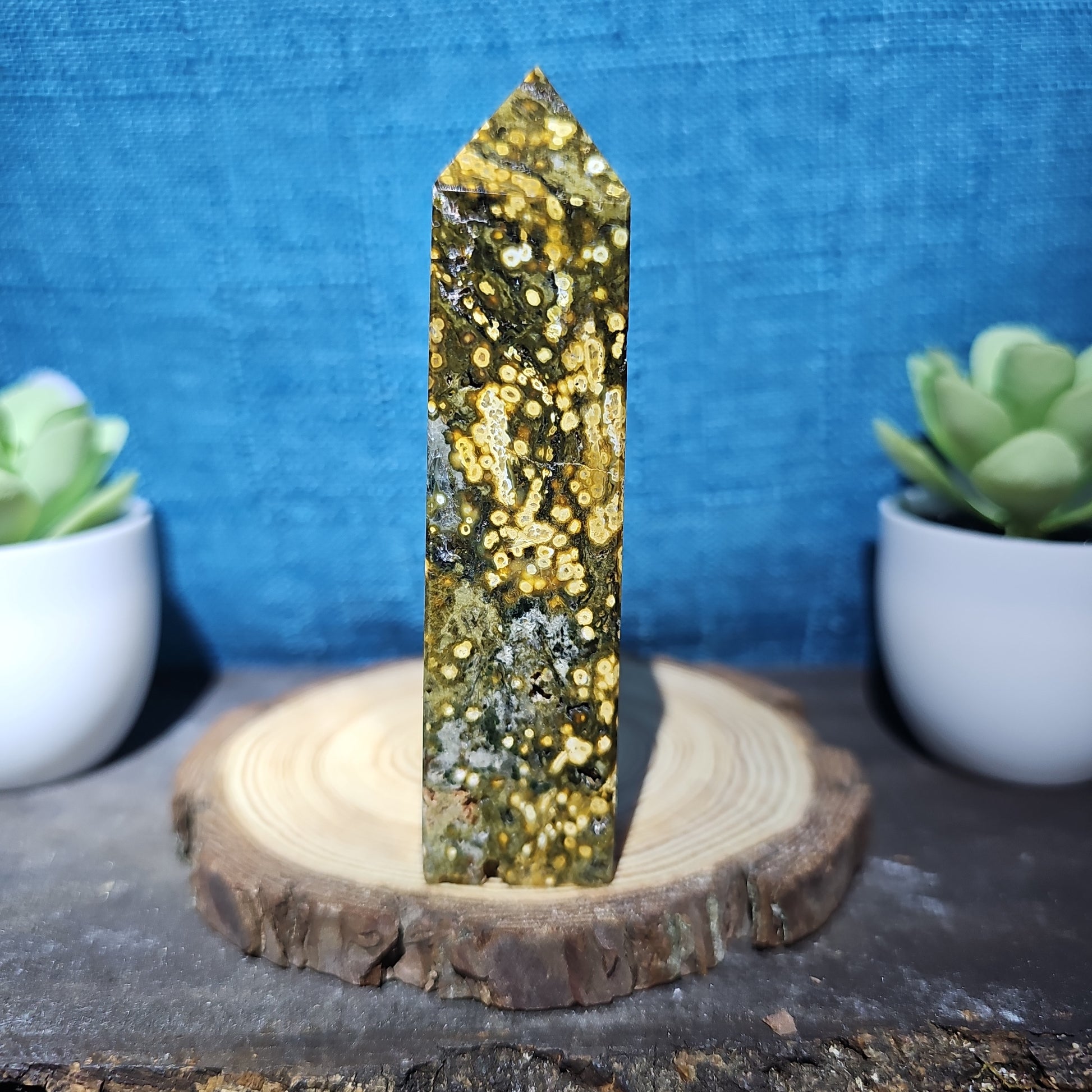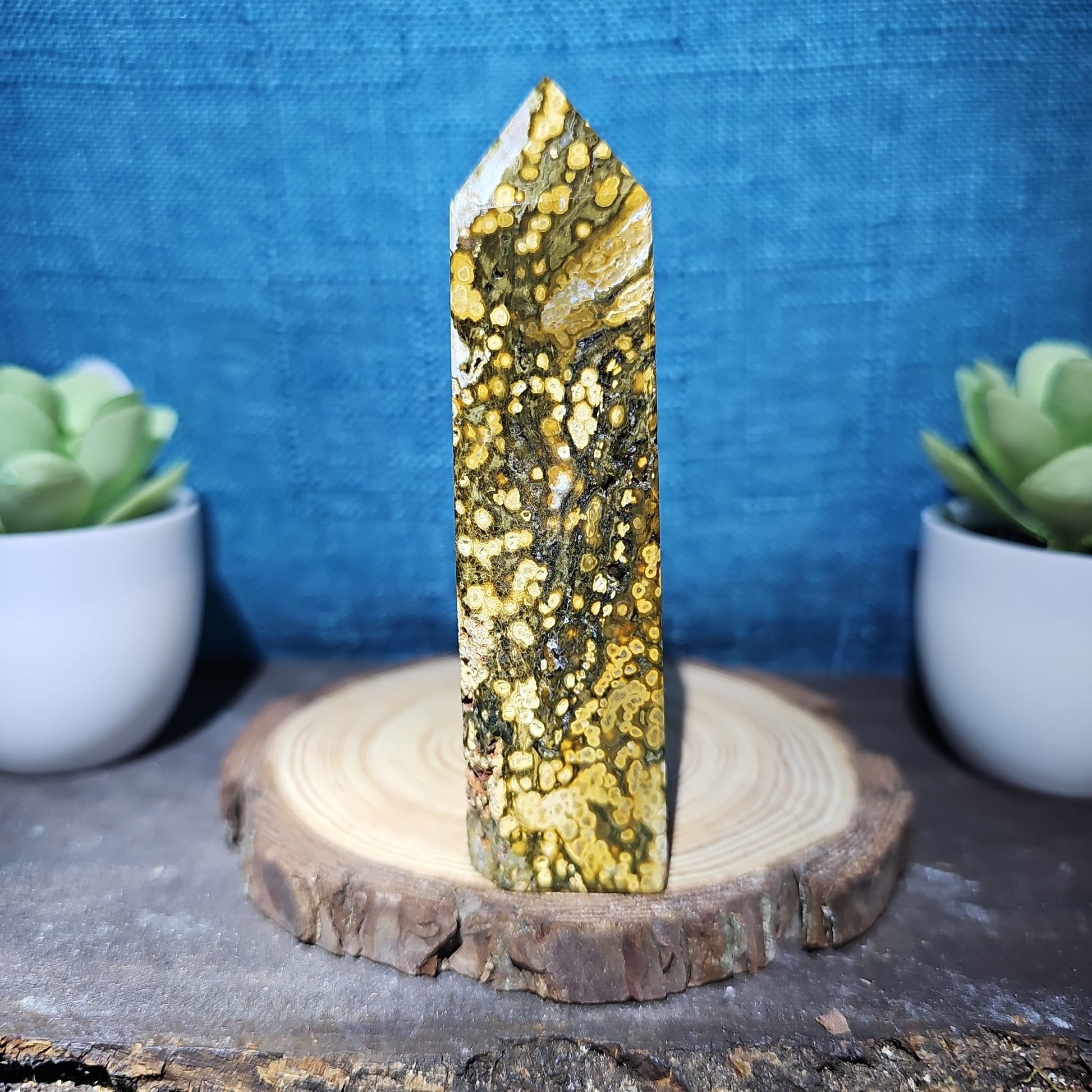 Each Bumblebee Jasper Tower is completely unique, making it a one-of-a-kind piece that you'll treasure for years to come. Whether you're a crystal collector or just looking to add some beauty and positive energy to your home or office, this tower is an excellent choice. Don't miss out on the opportunity to own a piece of the natural world's beauty and power with the Bumblebee Jasper Tower.