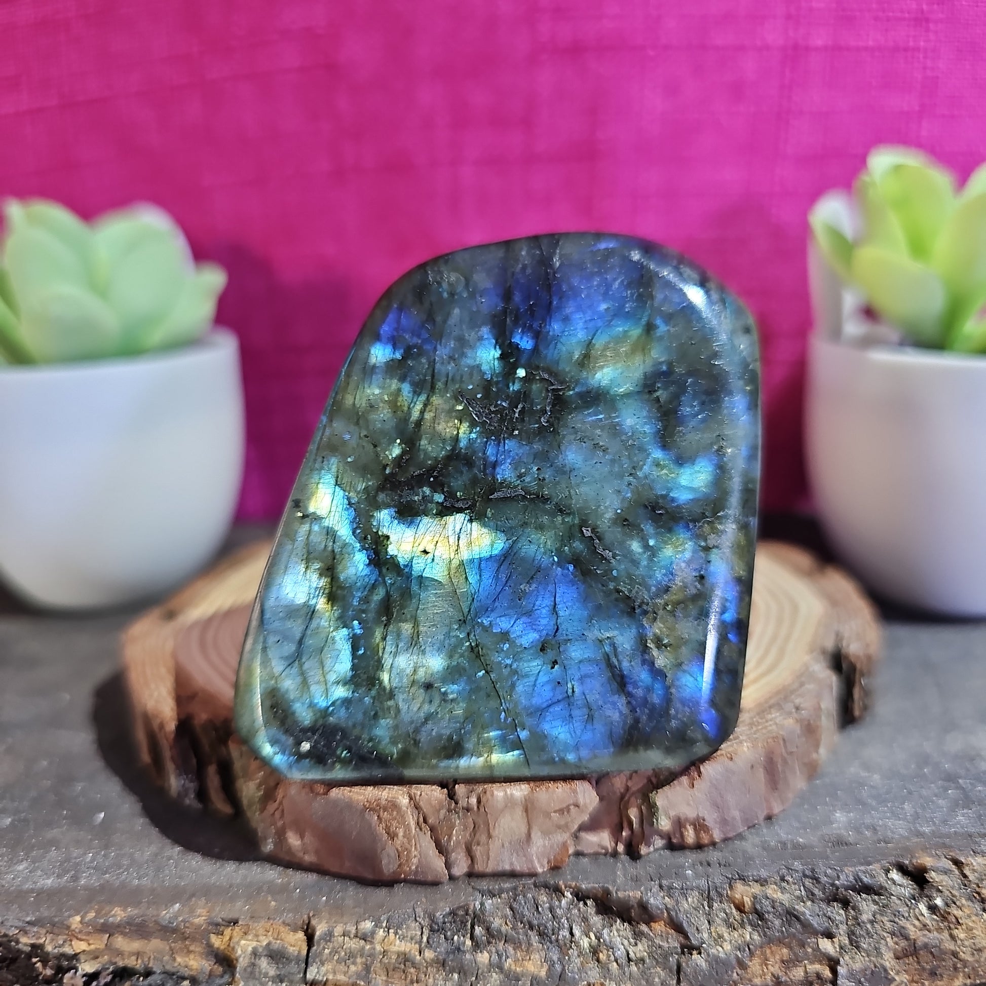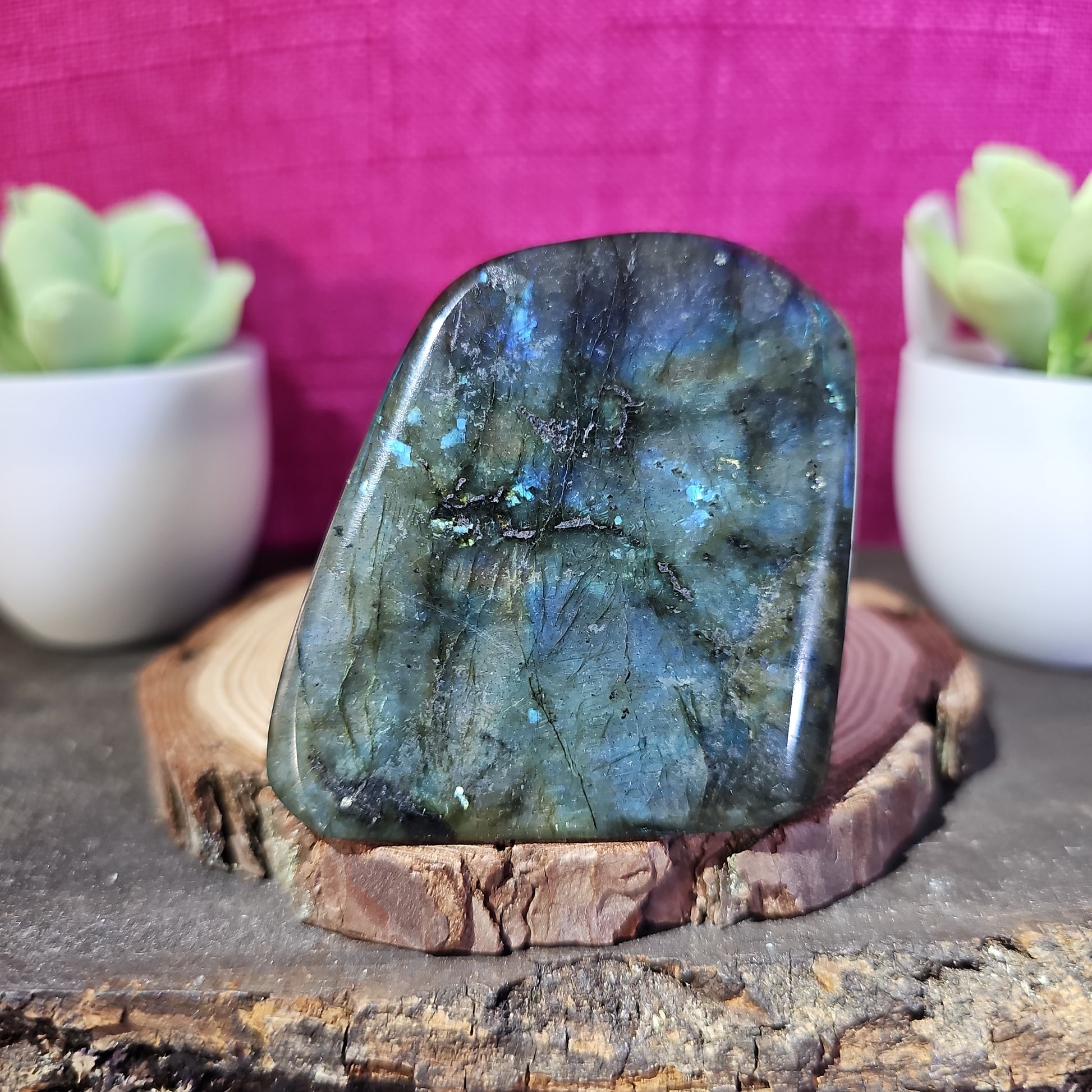 This stunning labradorite freeform is a must-have for any crystal enthusiast or collector. Featuring a unique, one-of-a-kind shape and a mesmerizing play of colors, this piece of labradorite is sure to catch the eye and captivate the mind. Labradorite is a powerful crystal known for its ability to enhance intuition, promote spiritual awakening, and protect against negative energy. This particular freeform is perfect for display on a desk, bookshelf, or meditation altar, and makes a great gift for anyone who loves crystals or natural beauty. Add this labradorite freeform to your collection today and experience the magic and wonder of this extraordinary crystal.