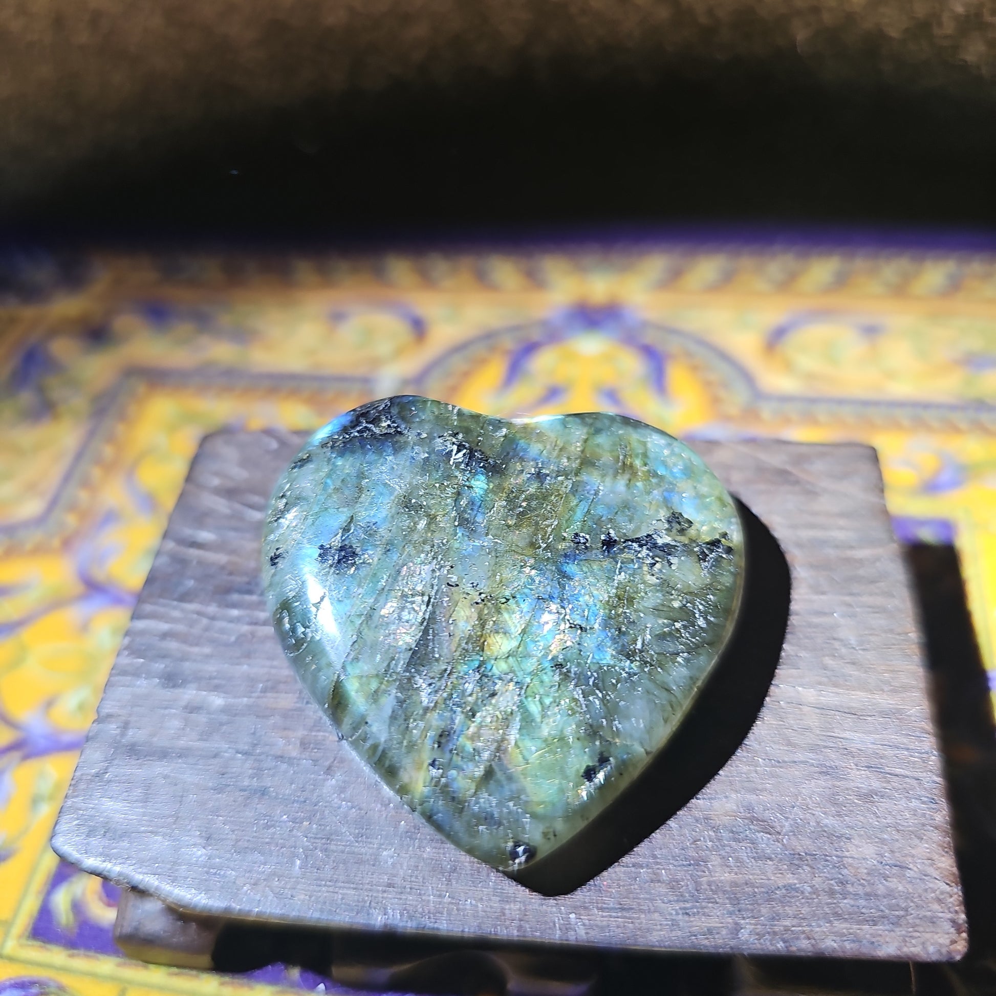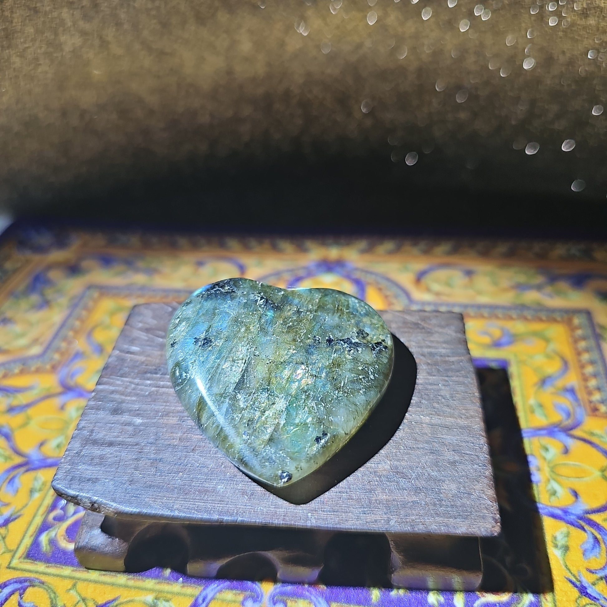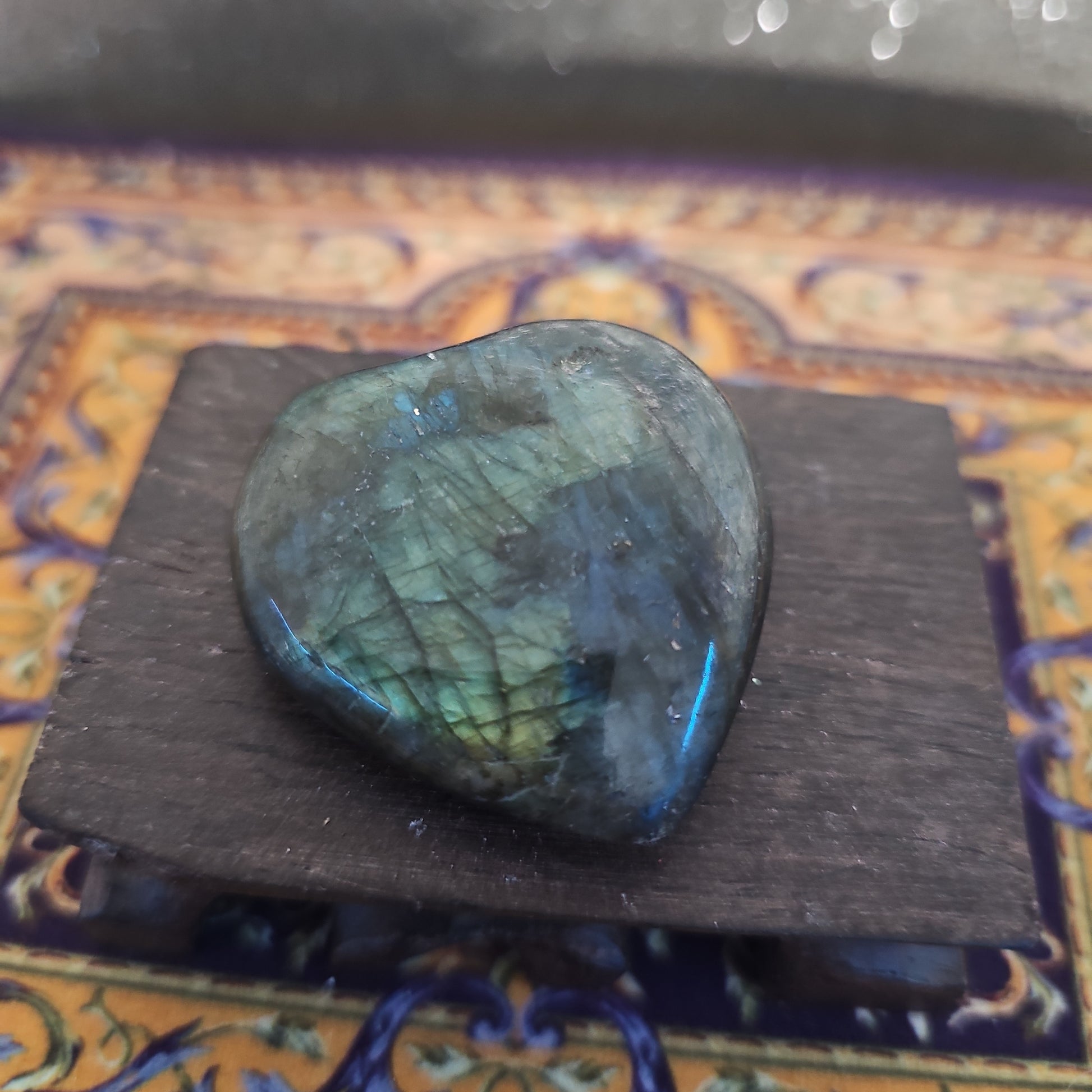 Introducing our Labradorite Heart - a stunning gemstone piece that is sure to capture your heart! Measuring 1.21 inches tall, this Labradorite Heart is the perfect addition to any crystal collection or as a standalone statement piece.
