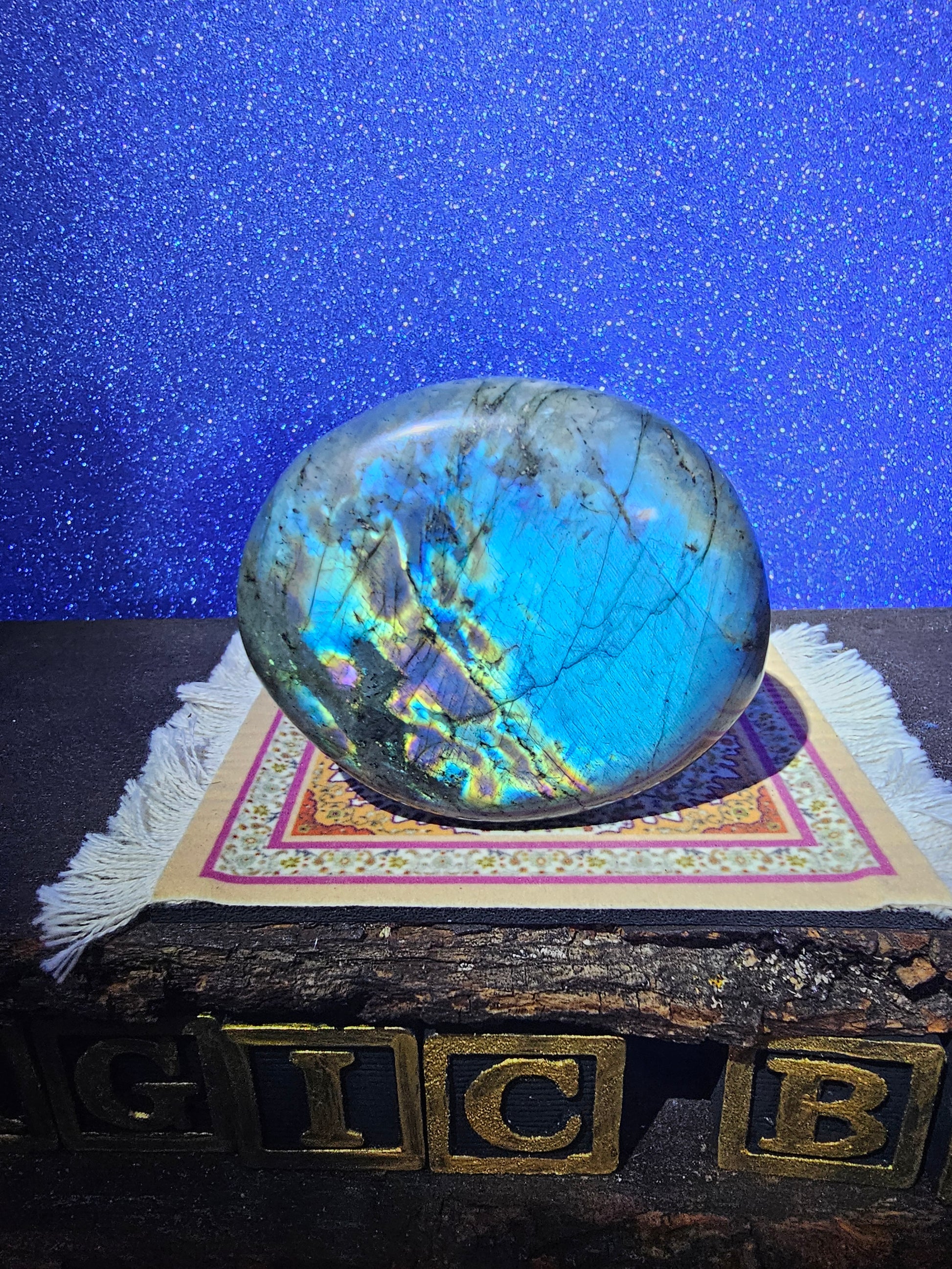 Introducing our stunning labradorite palmstone - the perfect addition to your crystal collection. Hand-selected for its captivating iridescence and unique coloration, this palmstone is the perfect size and shape to fit comfortably in your hand for use during meditation or as a comforting presence throughout the day. Labradorite is known for its protective and grounding properties, making it an ideal stone for those seeking to enhance their intuition and strengthen their connection to the earth. This labradorite palmstone is a must-have for anyone looking to add a touch of natural beauty and positive energy to their life.