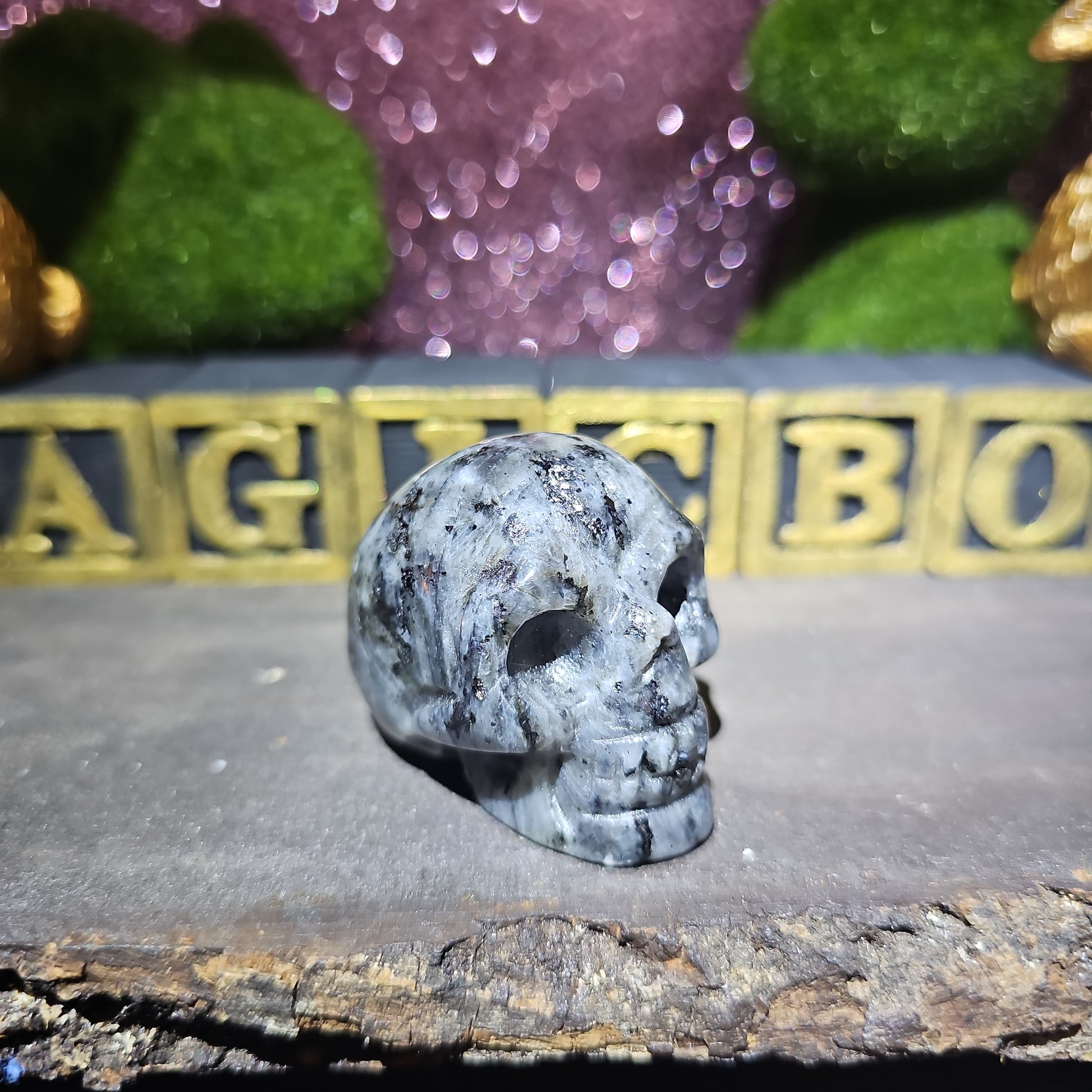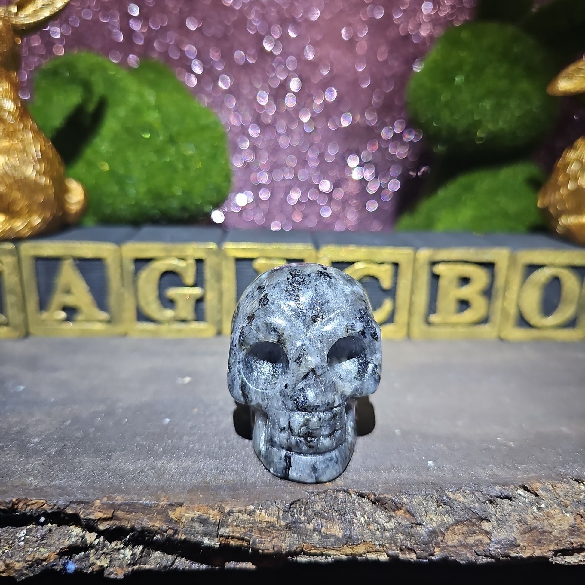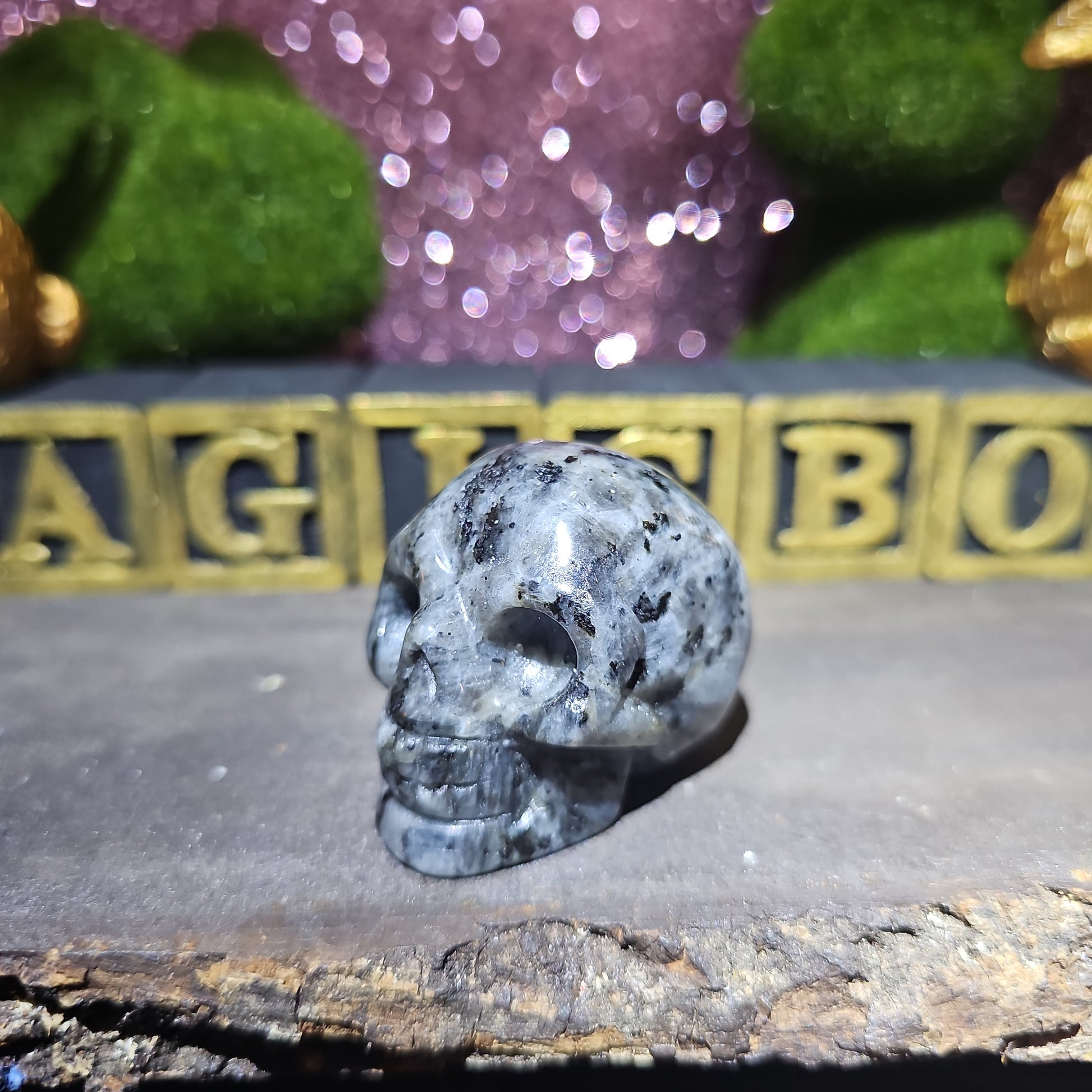 Unlock the mysteries of the cosmos with our mesmerizing Larvikite Skull. Crafted from the finest larvikite, this intricately carved skull embodies the ancient wisdom and powerful energies of the earth.