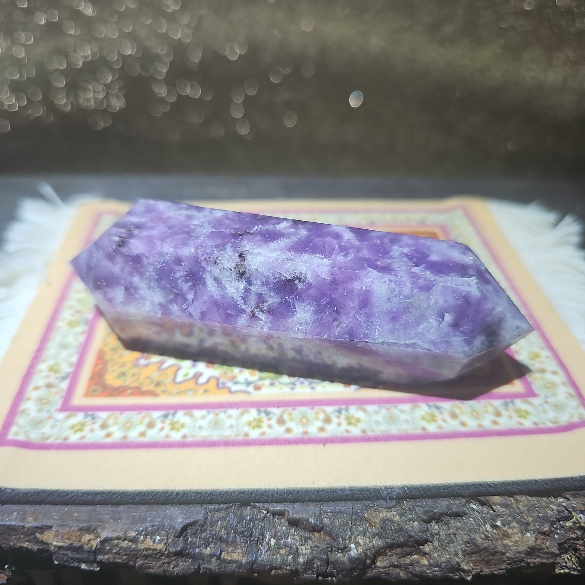 Each double-point is meticulously shaped and polished to showcase the natural beauty and iridescence of lepidolite and purple mica. From its elegant silhouette to its gentle hues, every piece emanates a sense of tranquility and inner peace.