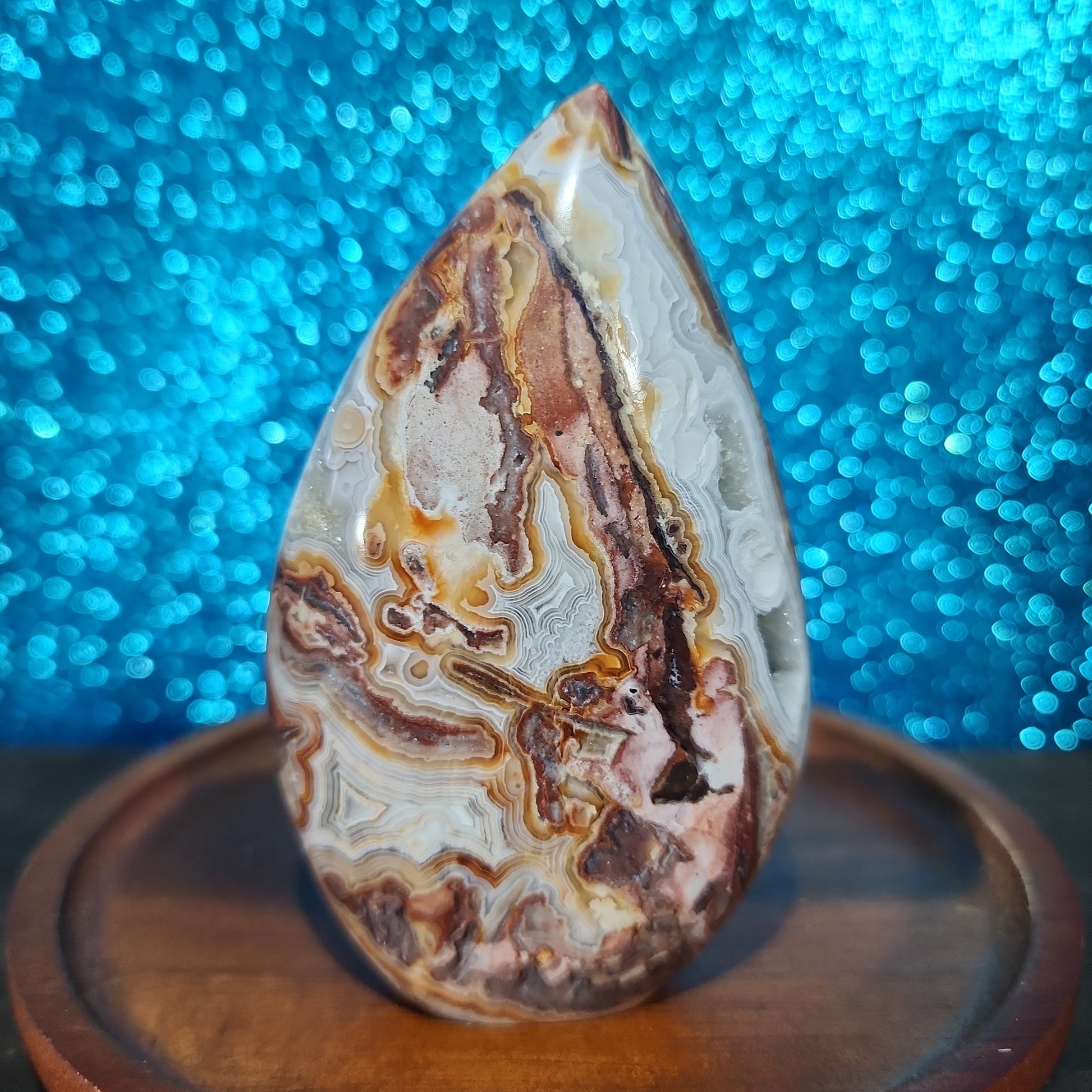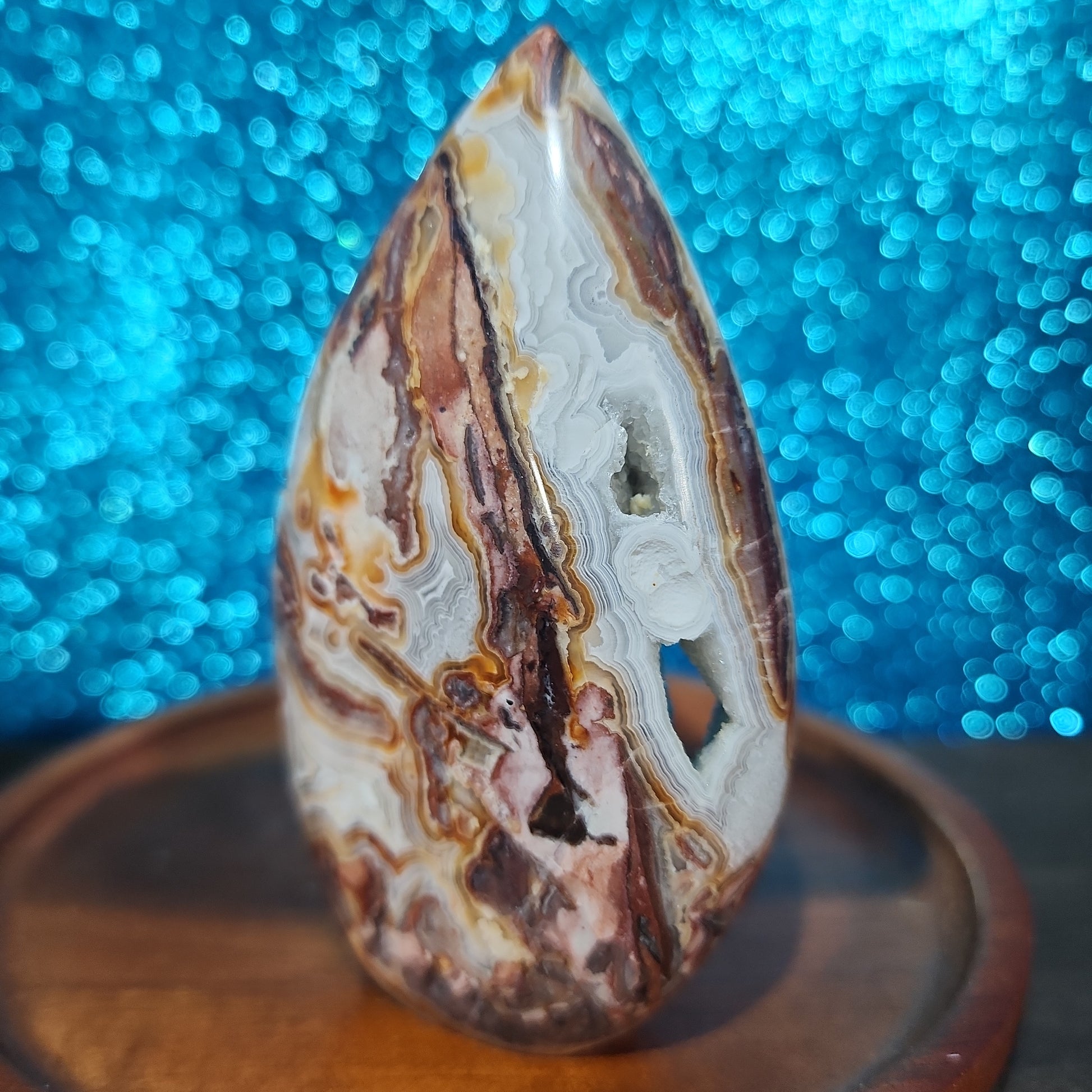 A Mexican Lace Agate Tower is a beautiful decorative piece made from a type of agate found in Mexico. This tower is handcrafted by skilled artisans and showcases the natural beauty of the stone with intricate patterns and color variations. Each tower is unique and may feature bands of white, gray, and brown, with translucent sections that allow light to pass through. Mexican Lace Agate Towers are often used as a decorative centerpiece, meditation aid, or healing tool due to their calming energy and ability to enhance spiritual growth.