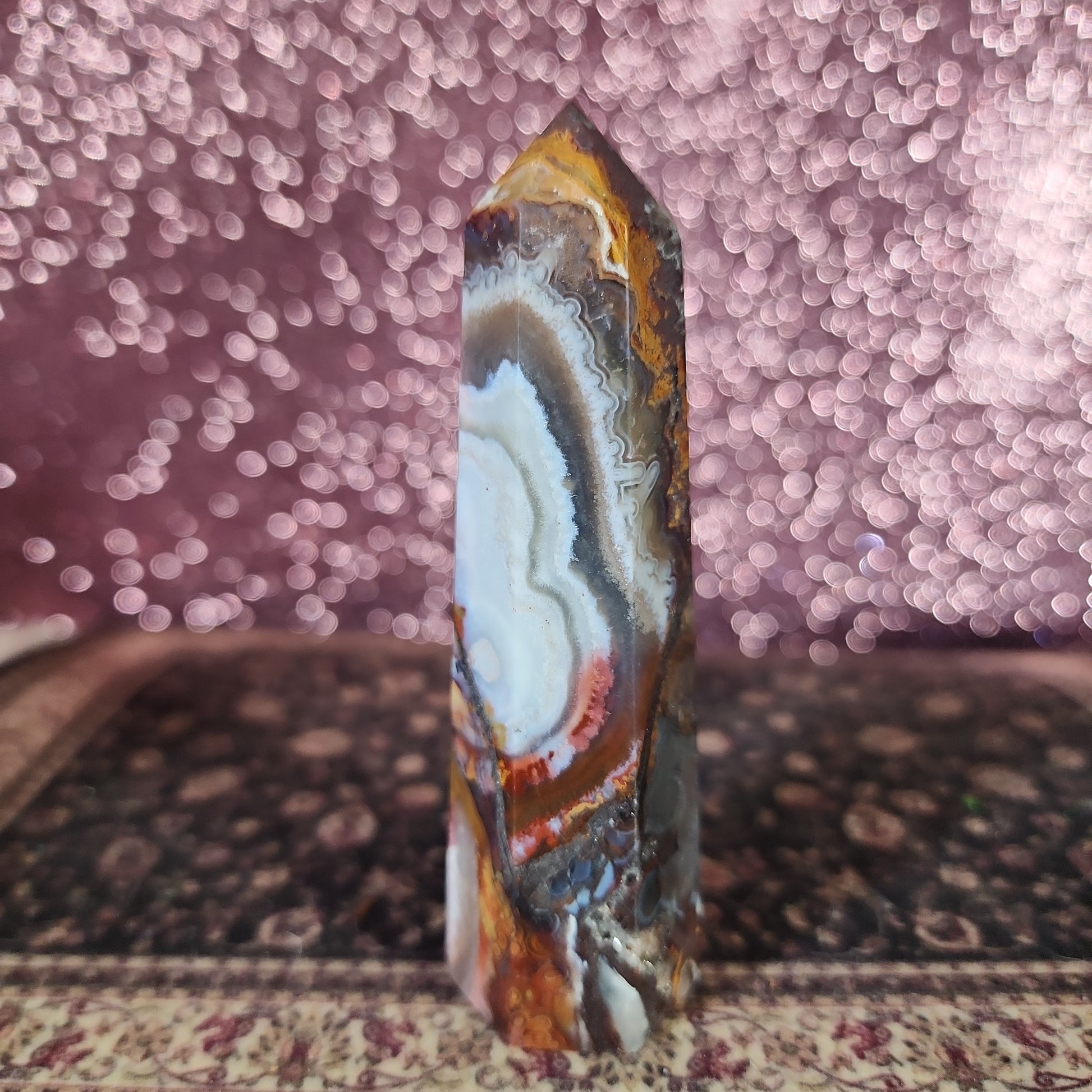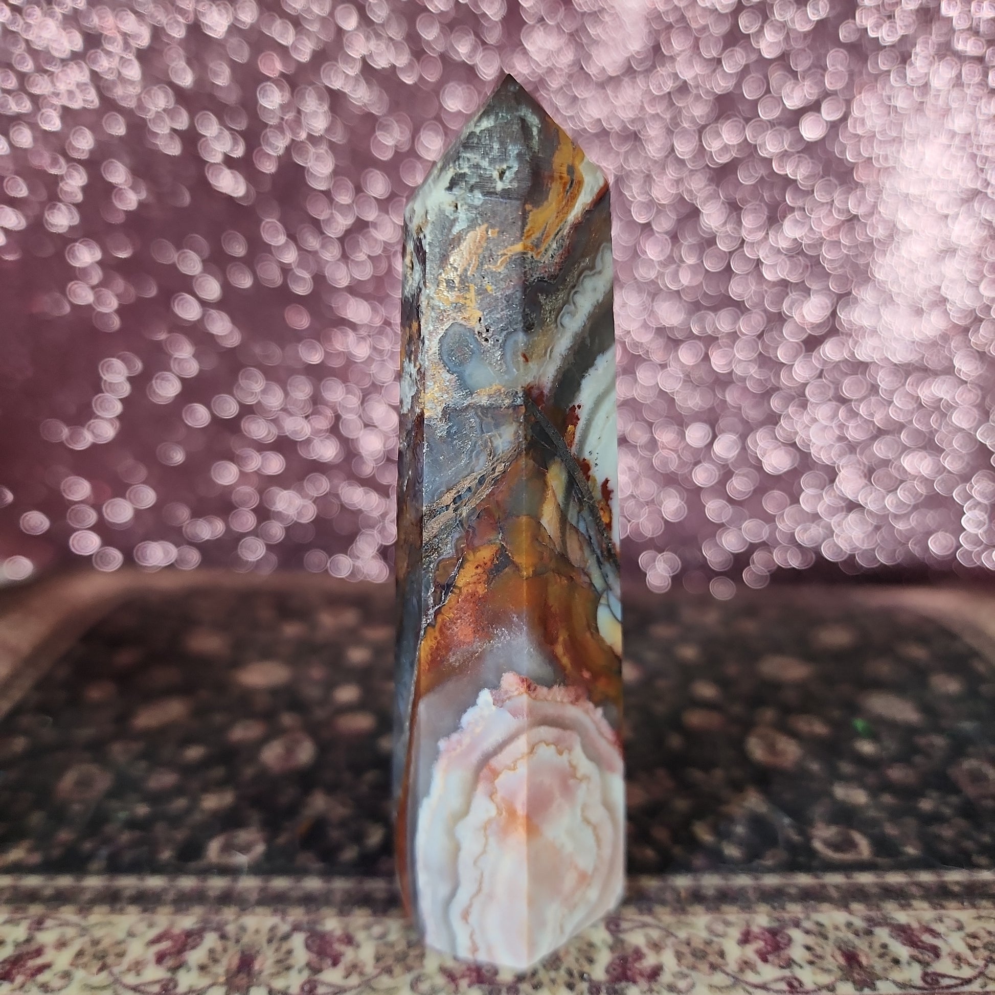 A Mexican Lace Agate Tower is a beautiful decorative piece made from a type of agate found in Mexico. This tower is handcrafted by skilled artisans and showcases the natural beauty of the stone with intricate patterns and color variations. Each tower is unique and may feature bands of white, gray, and brown, with translucent sections that allow light to pass through. Mexican Lace Agate Towers are often used as a decorative centerpiece, meditation aid, or healing tool due to their calming energy and ability to enhance spiritual growth.