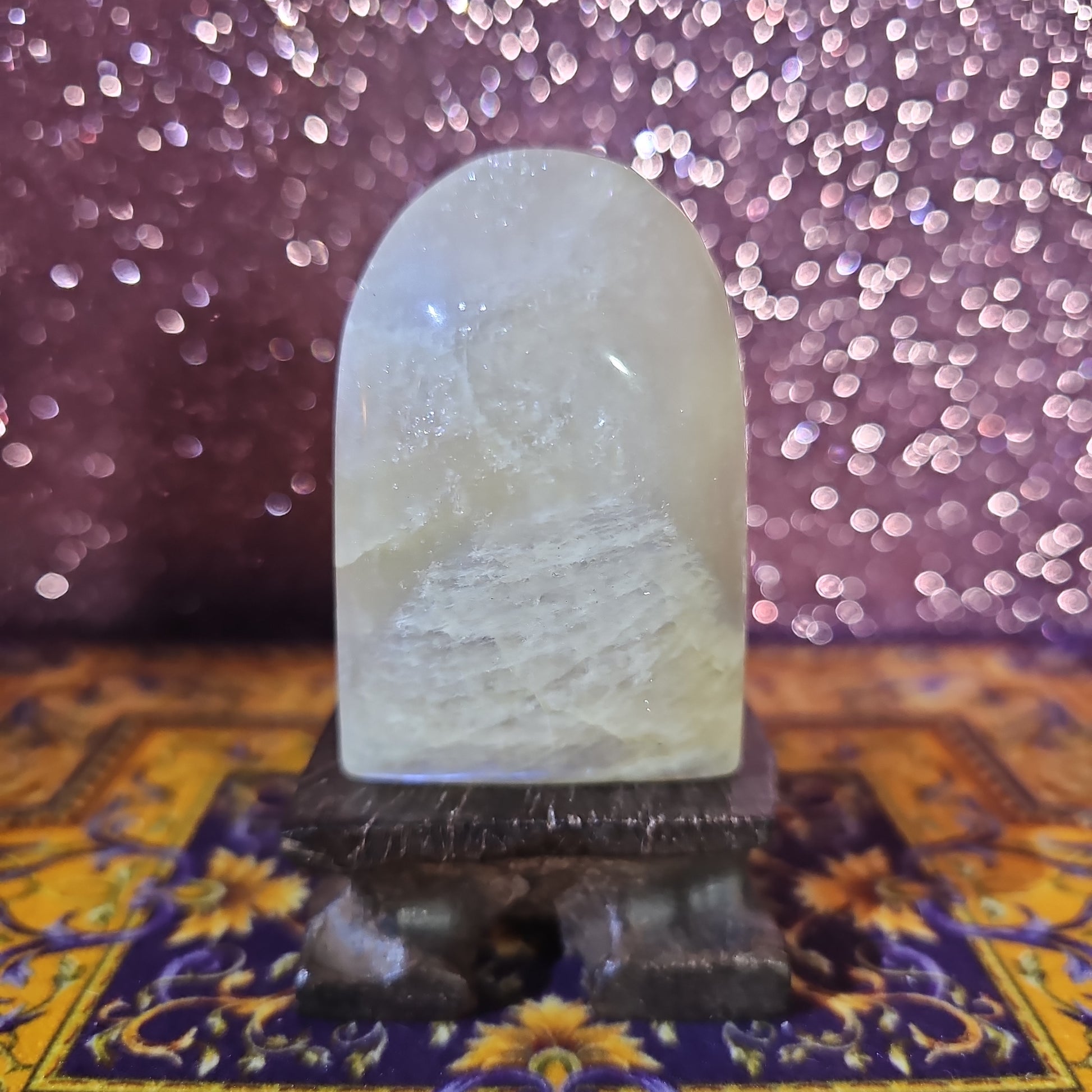 This stunning moonstone freeform is a one-of-a-kind gemstone that boasts a mesmerizing play of light and color. Its unique, irregular shape adds to its natural beauty and makes it a perfect statement piece for any room or decor. The moonstone is known for its soothing and calming properties, making this freeform not only a beautiful addition to your collection but also a source of positive energy. Its iridescent surface shimmers with a soft blue hue, making it a versatile piece that complements any style and adds a touch of elegance to any space. Perfect for display on a tabletop, bookshelf, or mantle, this moonstone freeform is a must-have for anyone who appreciates the beauty and power of natural gemstones.