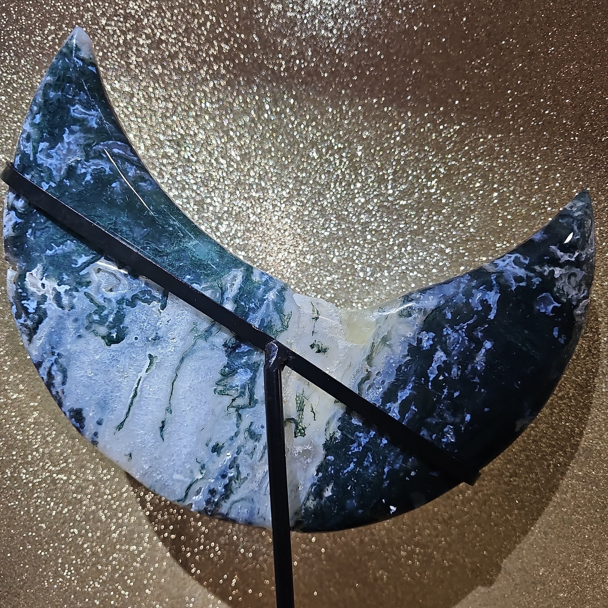 Embrace the mystical allure of the cosmos with our captivating Moss Agate Moon. This celestial treasure is meticulously crafted from the finest Moss Agate, renowned for its lush green hues and mesmerizing patterns resembling the lunar landscape.