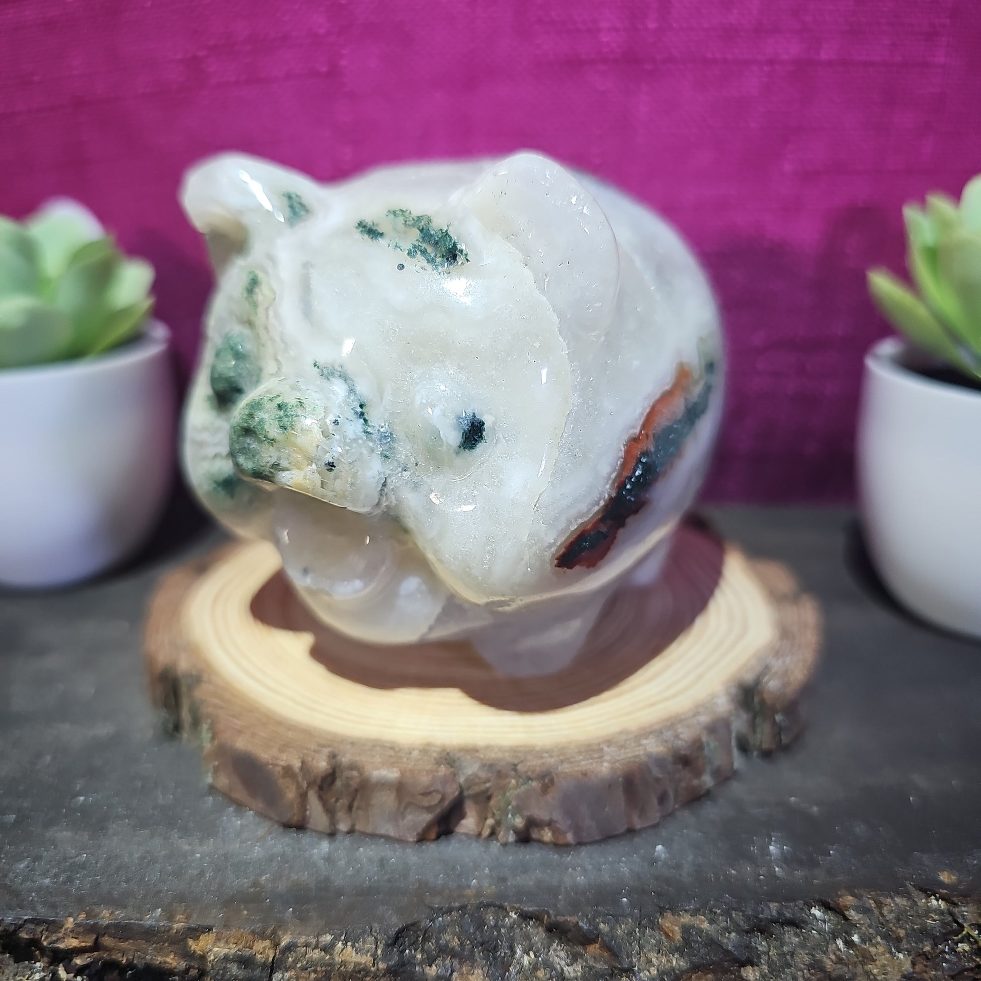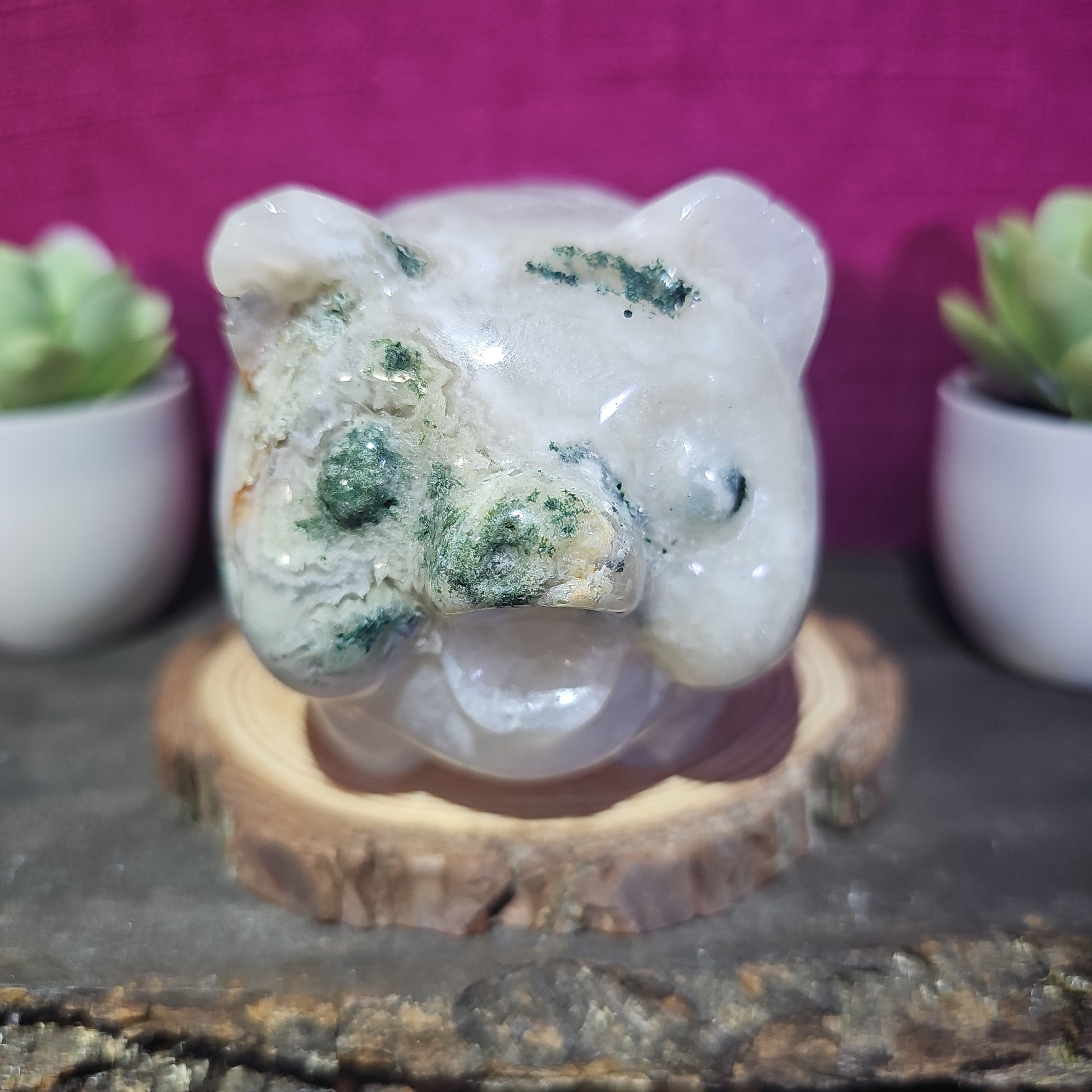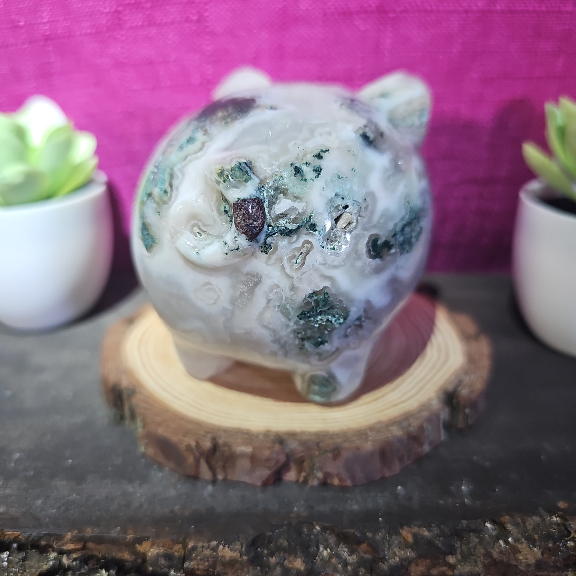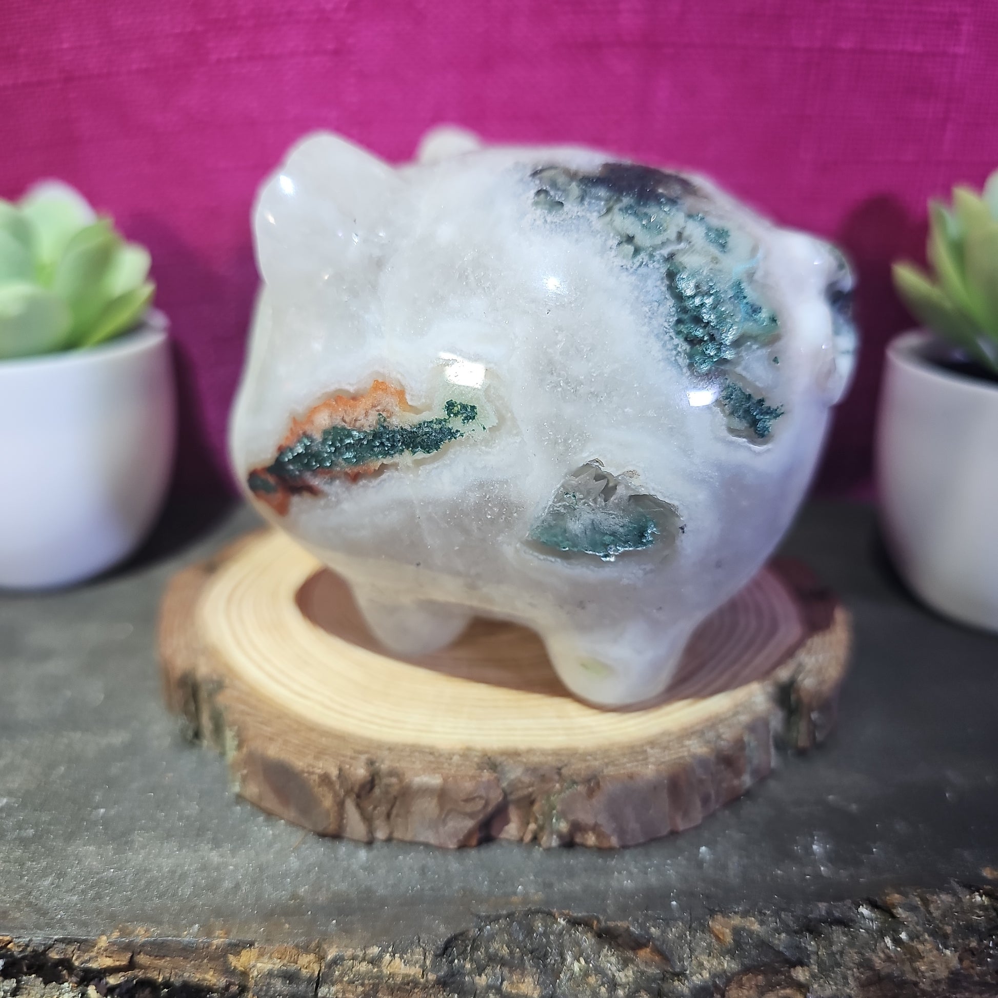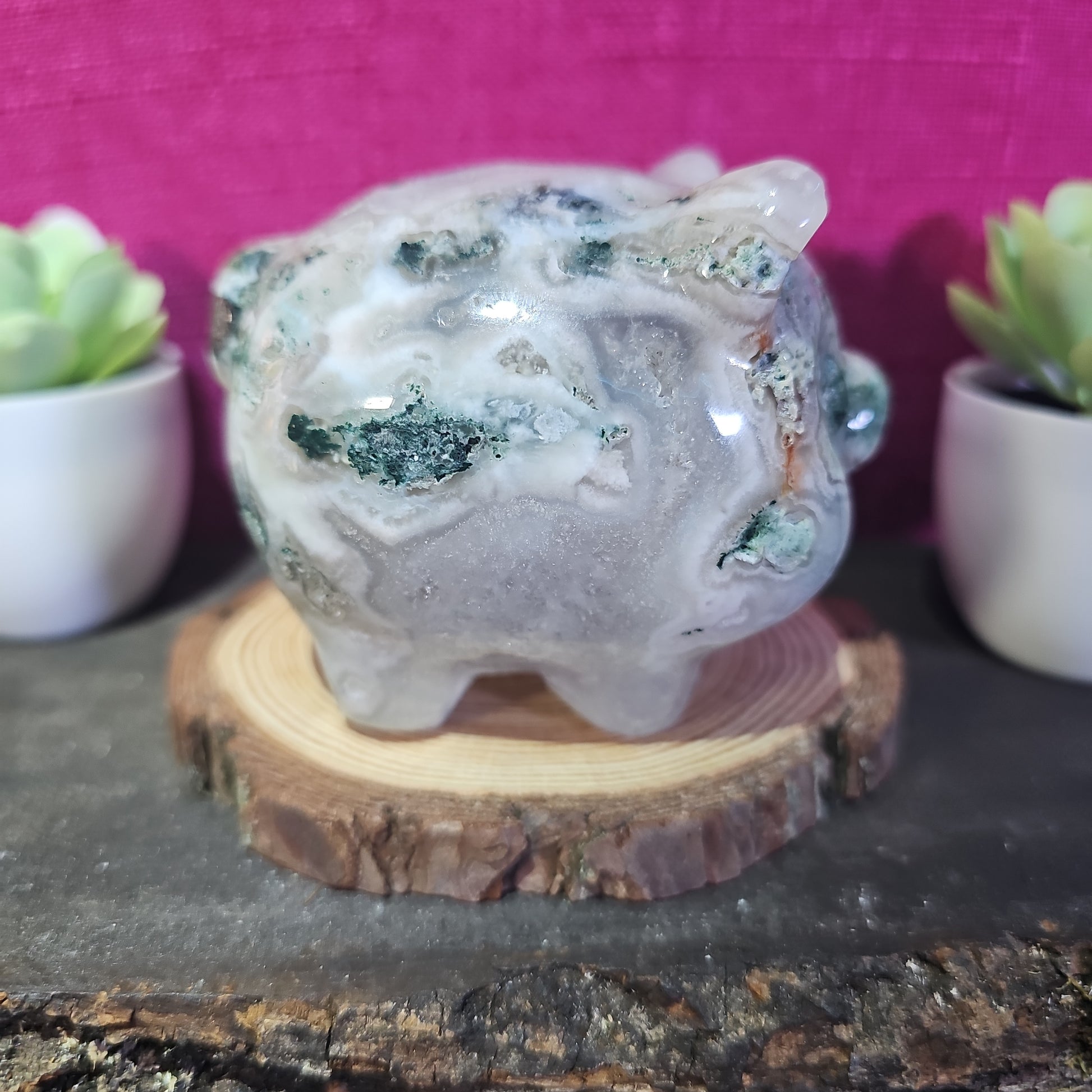 Bring a touch of whimsy and nature into your space with our Moss Agate Pig. Crafted from the finest moss agate, this charming figurine embodies the playful spirit of the countryside with its earthy hues and natural textures.