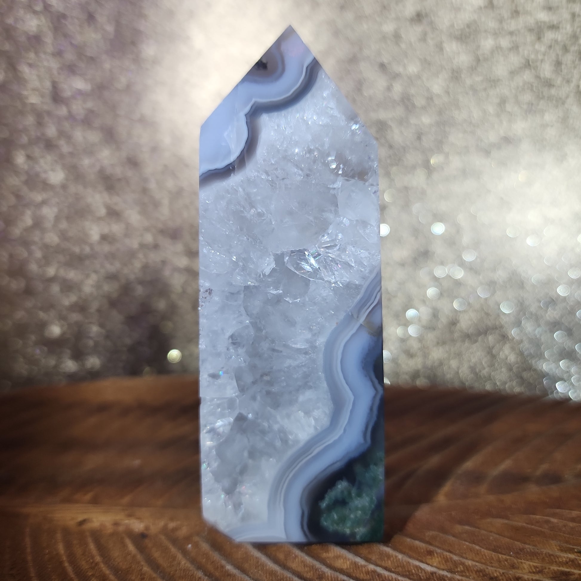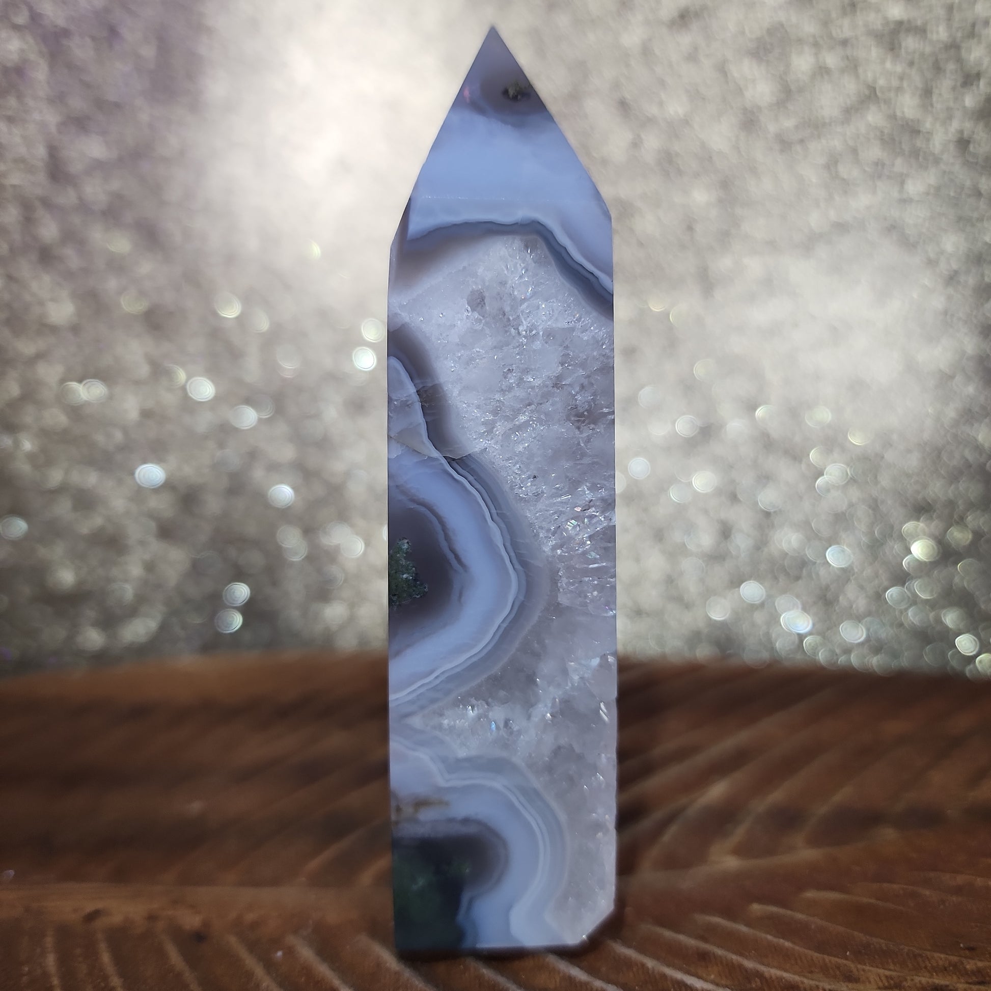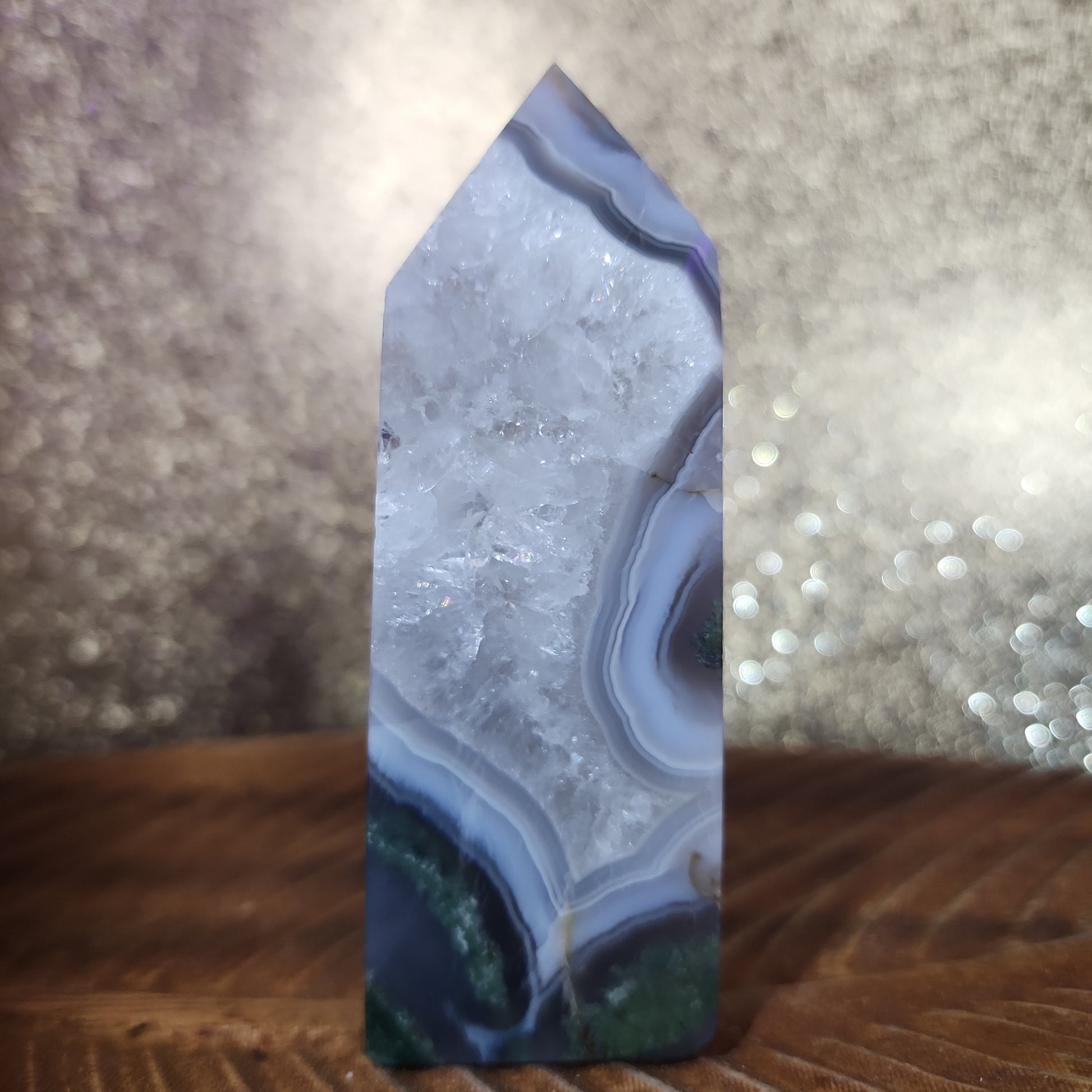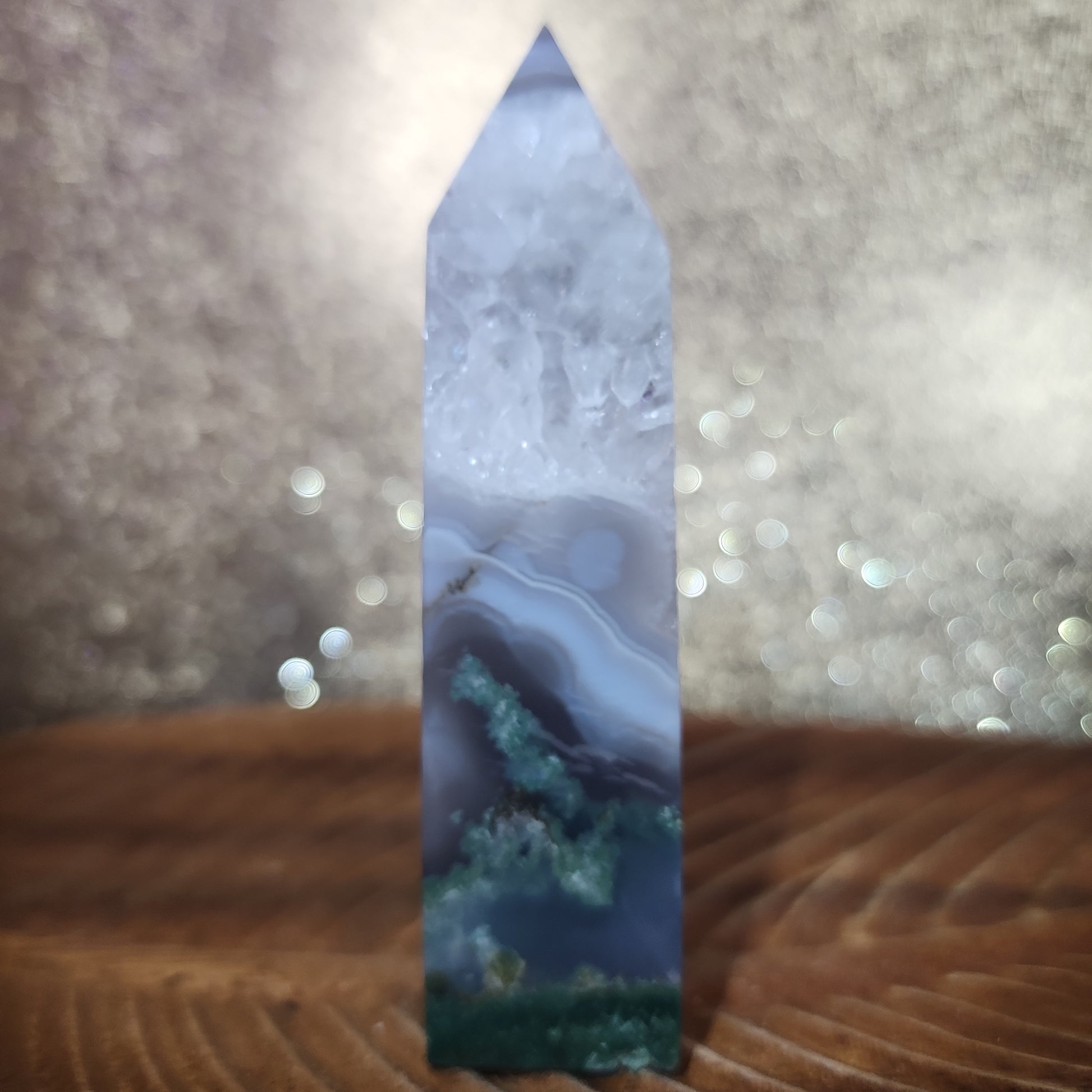 Experience the magical allure of our Moss Agate Tower, generously adorned with nature's captivating beauty. This extraordinary crystal masterpiece combines the tranquil essence of Moss Agate with an abundance of mesmerizing agate inclusions, creating a breathtaking fusion of Earth's wonders.