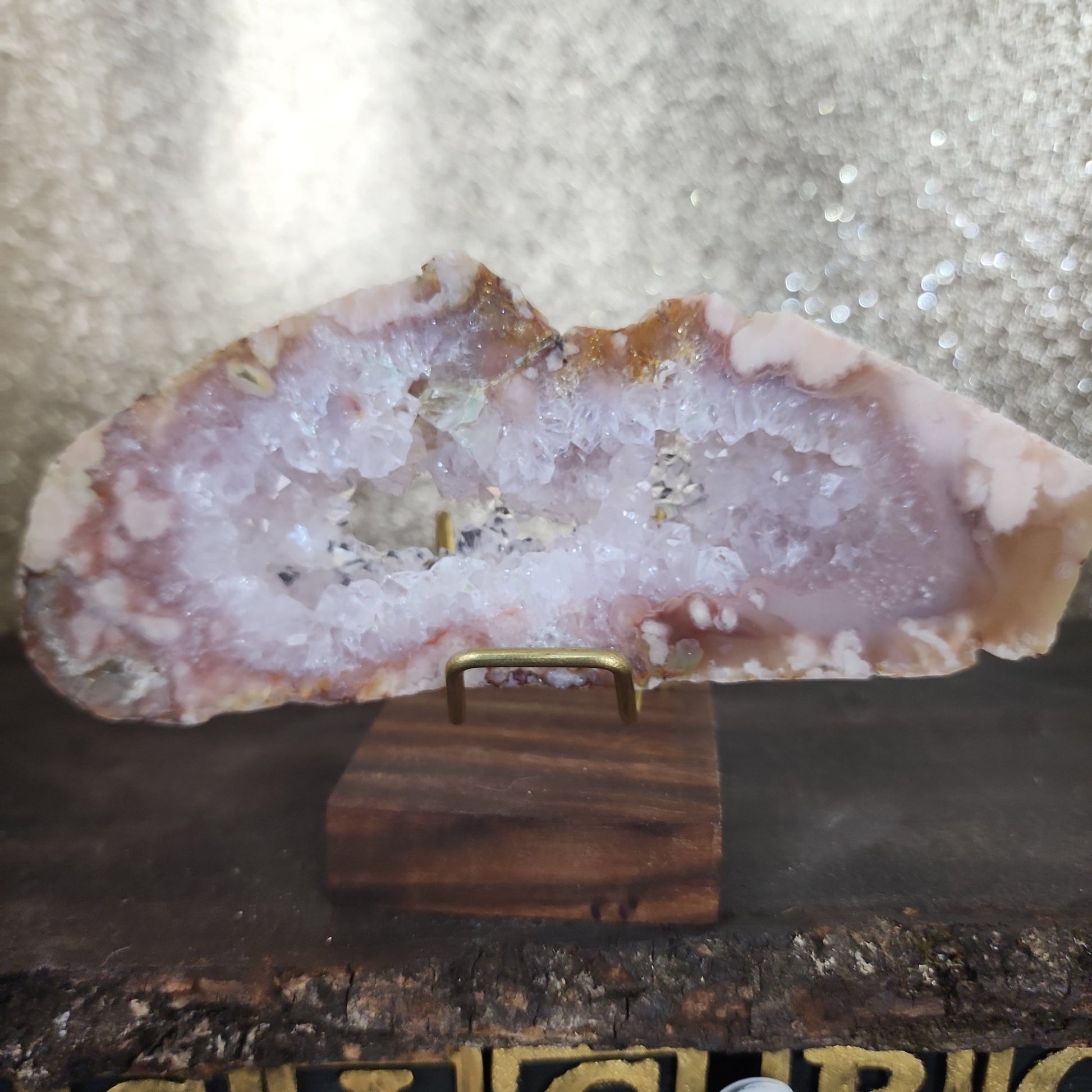 Introducing the Flower Agate Slab, a natural gemstone that features soft pink and lavender hues with delicate white veins and crystal formations. The slab is polished to a smooth and glossy finish, making it a stunning decorative piece for any home or office. Believed to have healing properties, this unique slab is a must-have for gemstone collectors and anyone looking to add a touch of natural beauty to their space.