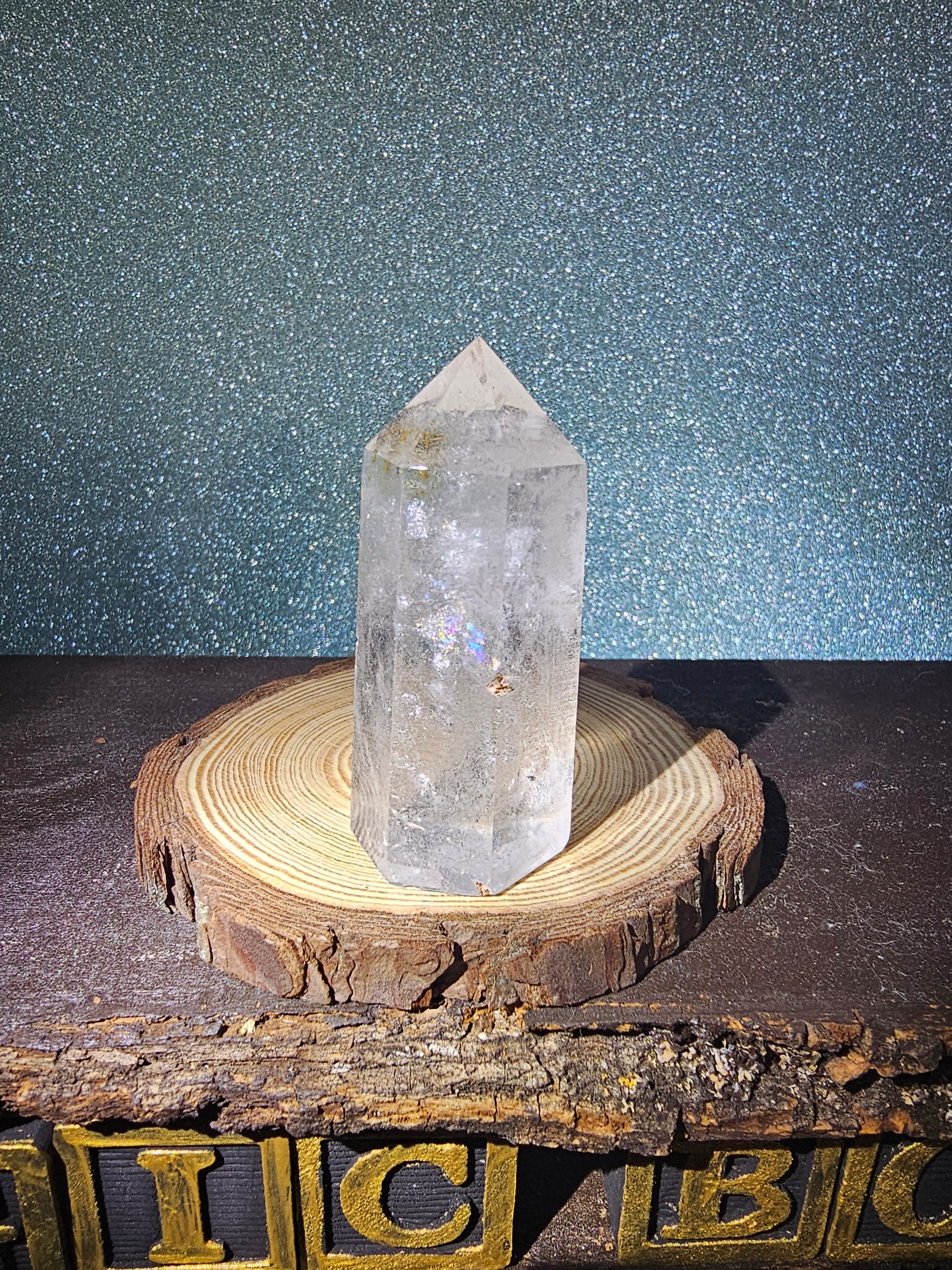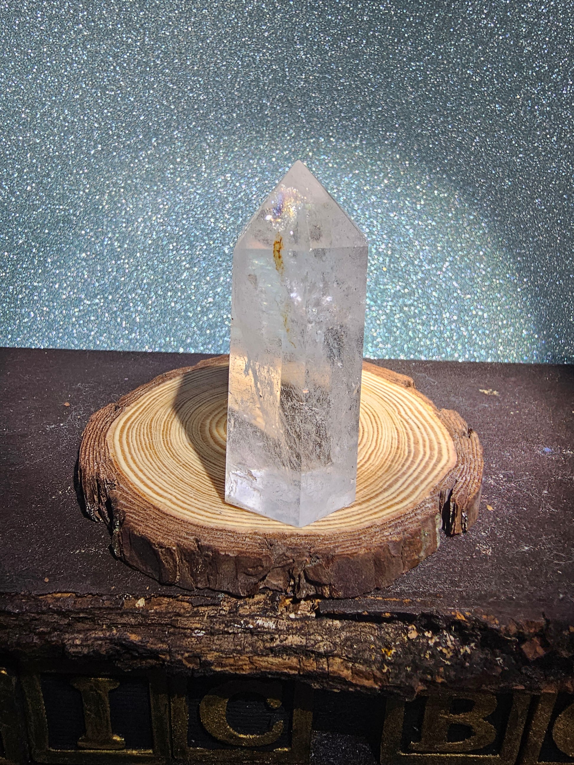 Clear quartz is known as the "Master Healer" of all crystals and is believed to amplify energy, enhance focus, and promote clarity of thought. As you hold or meditate with this tower, you may feel its energy working to dispel negative energy, balance your chakras, and promote overall well-being.