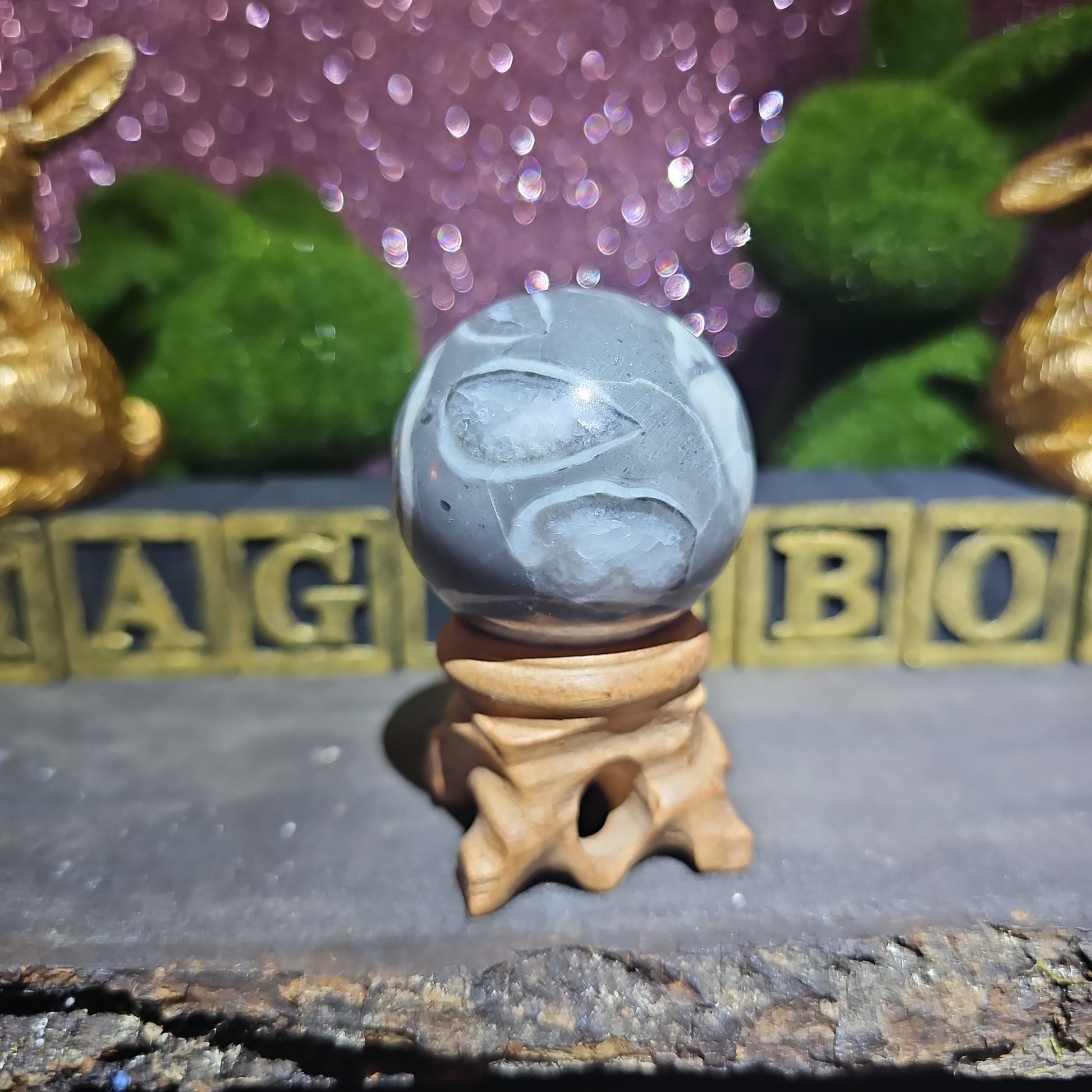 Each glance into the depths of this sphere reveals a new layer of complexity and beauty, inviting you to explore the boundless wonders of the universe. Whether displayed as a focal point in your home or used as a tool for meditation and reflection, our Thousand Eyes Sphere serves as a reminder of the infinite possibilities that await those who dare to dream.