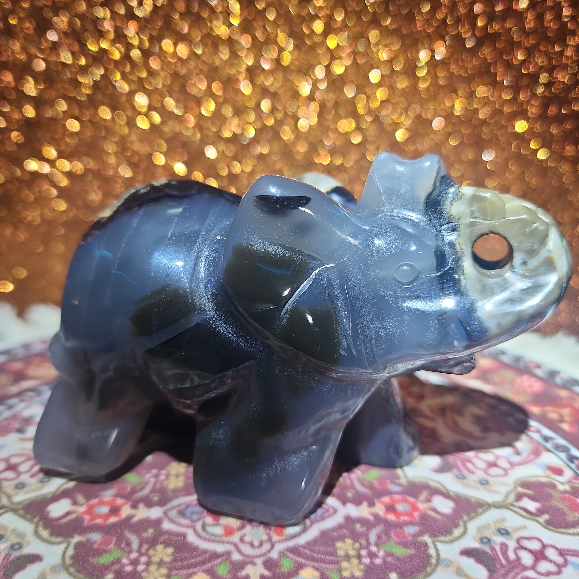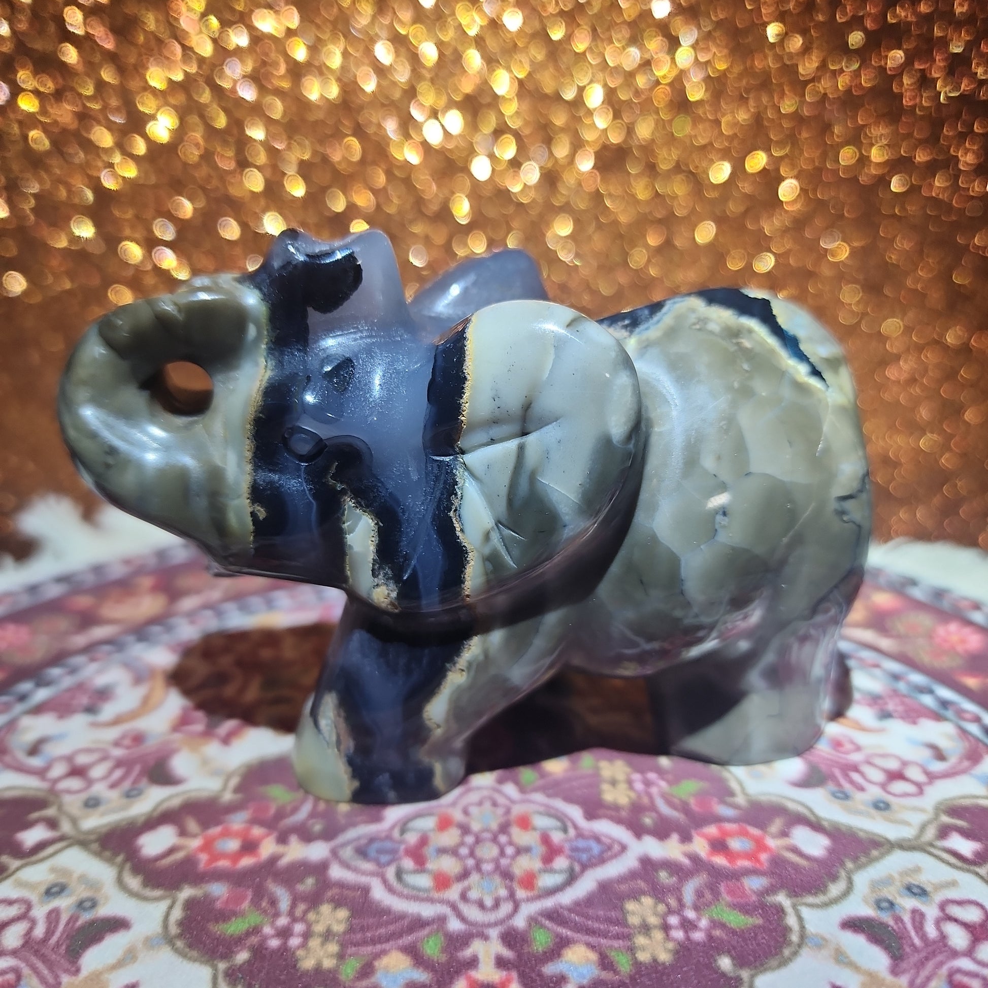 Our Volcanic Agate Elephant is a majestic fusion of geological splendor and artistic craftsmanship. Carved from genuine volcanic agate, this remarkable sculpture showcases the strength and grace of one of Earth's most magnificent creatures.