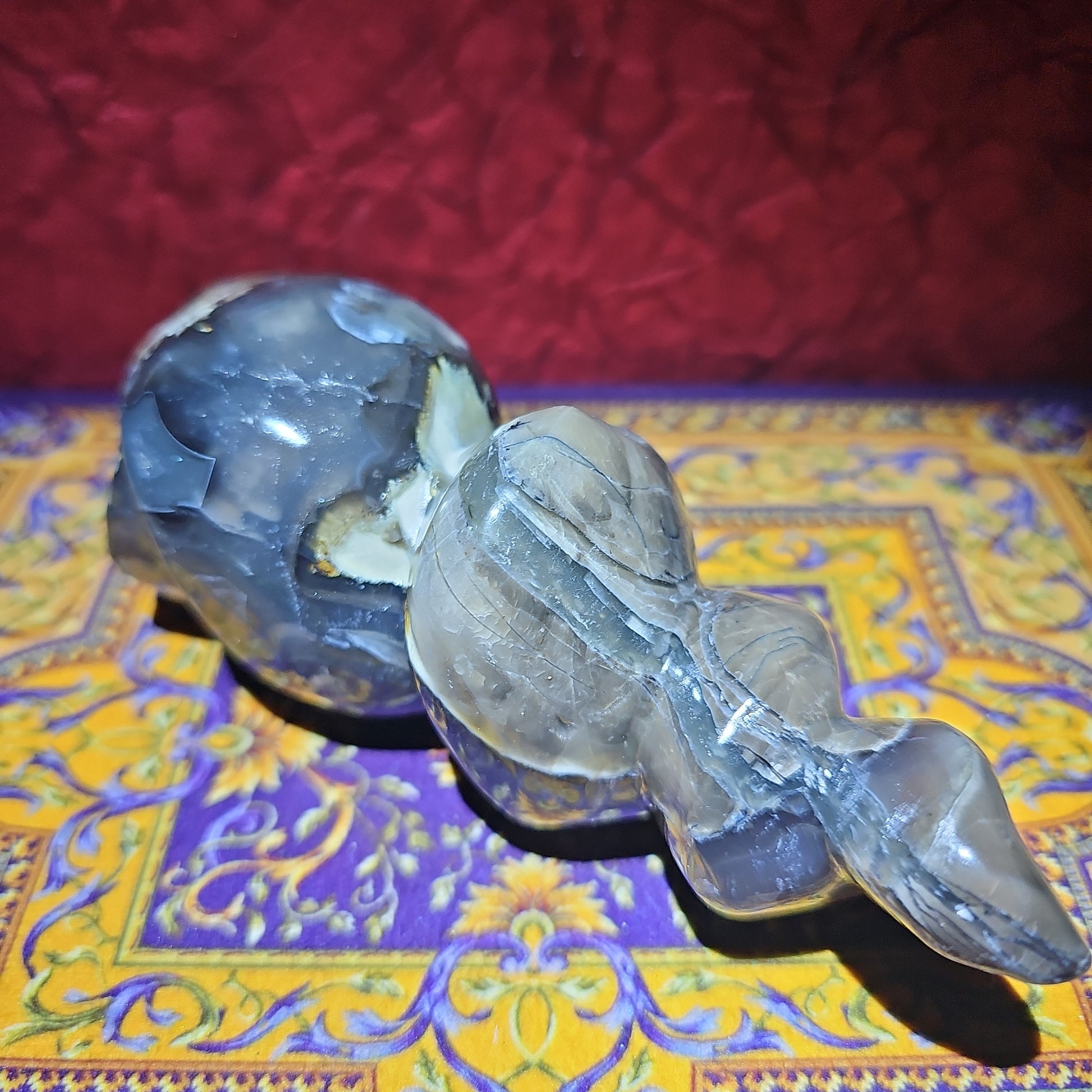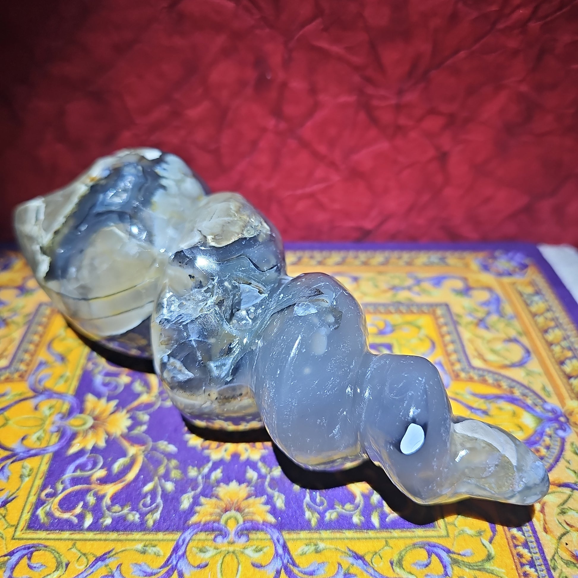 Volcanic agate, forged from the intense heat and pressure of volcanic eruptions, captures the essence of Earth's fiery energy, while the seashell shape brings to mind the calming presence of the ocean. This harmonious fusion of elements creates a visually enchanting and spiritually resonant work of art.