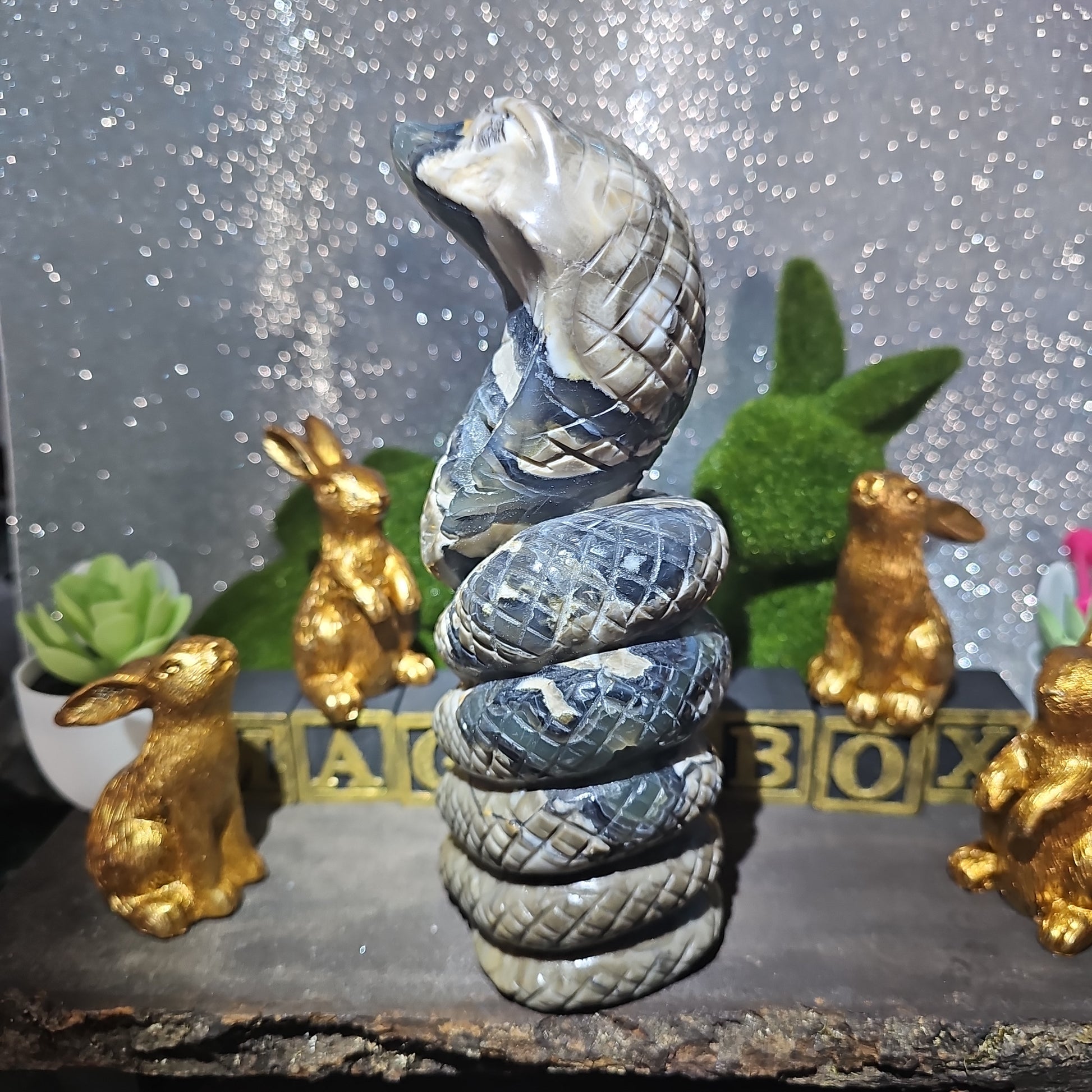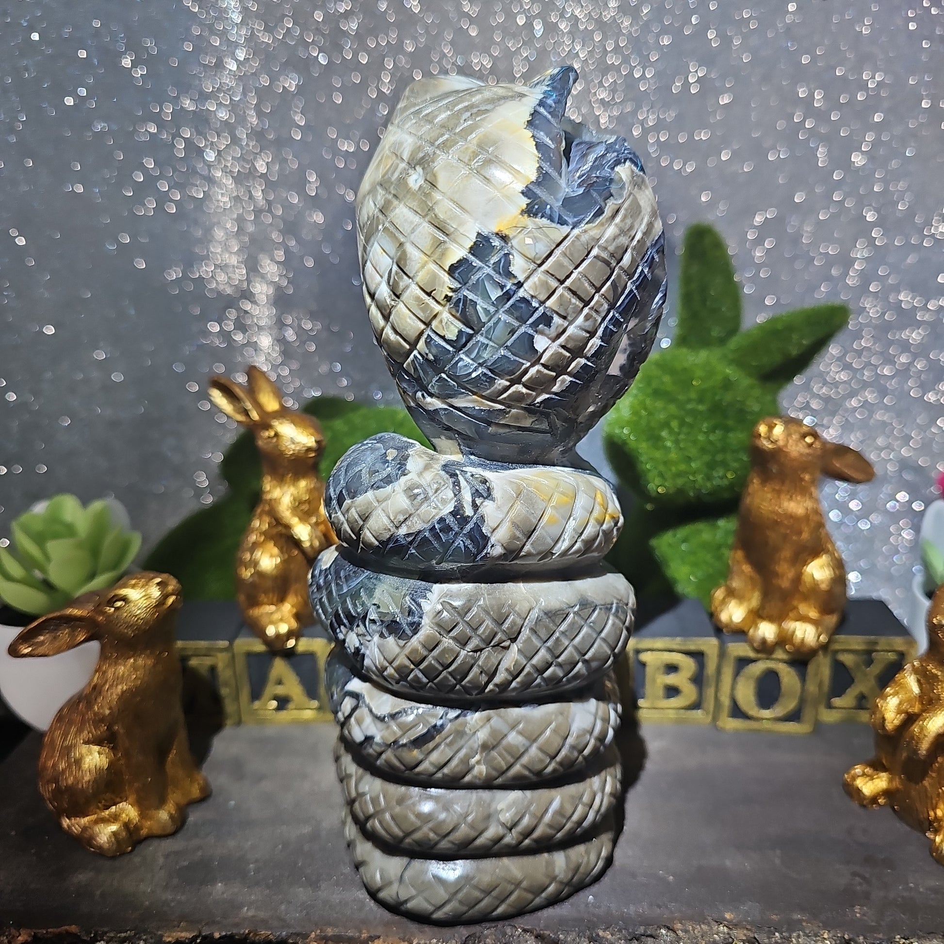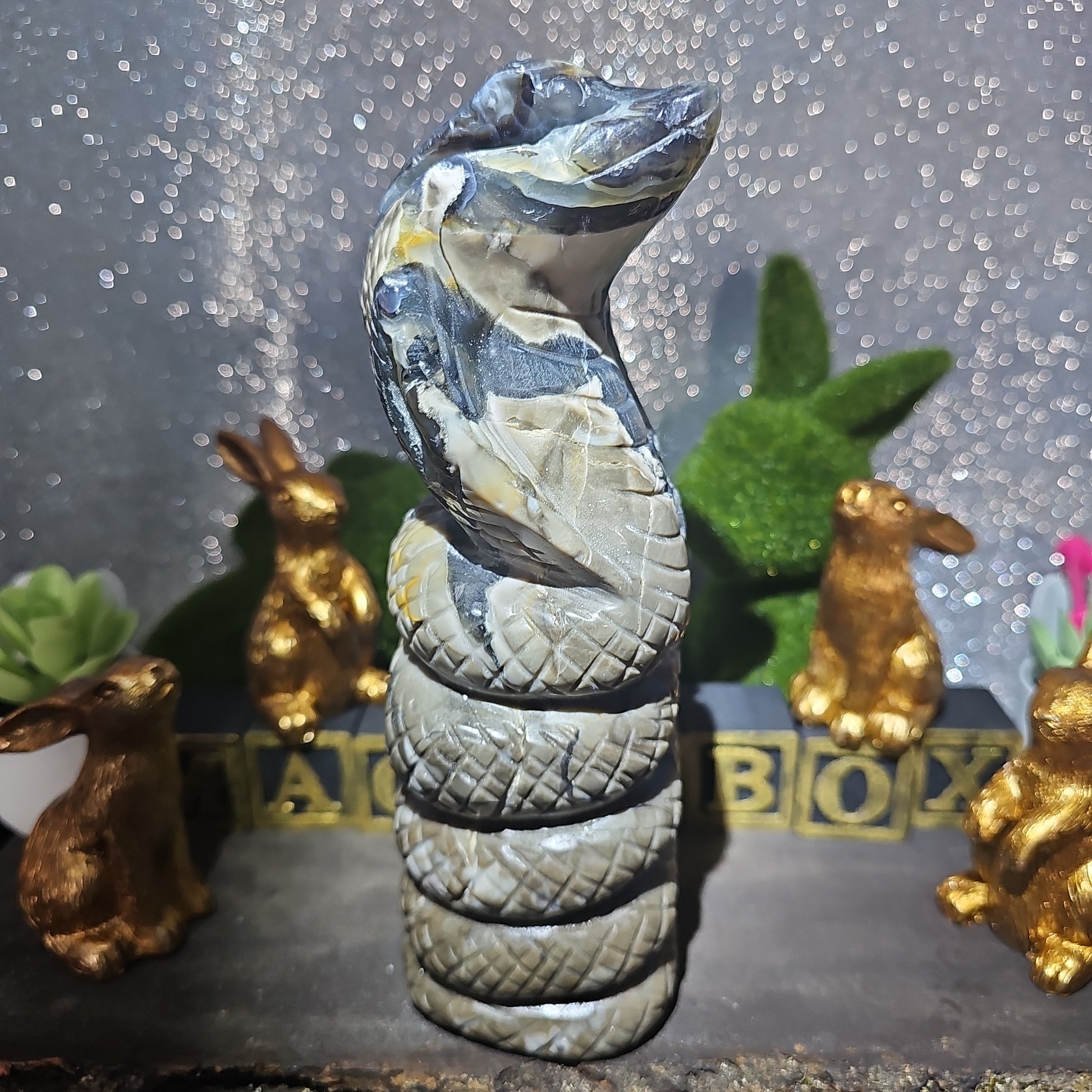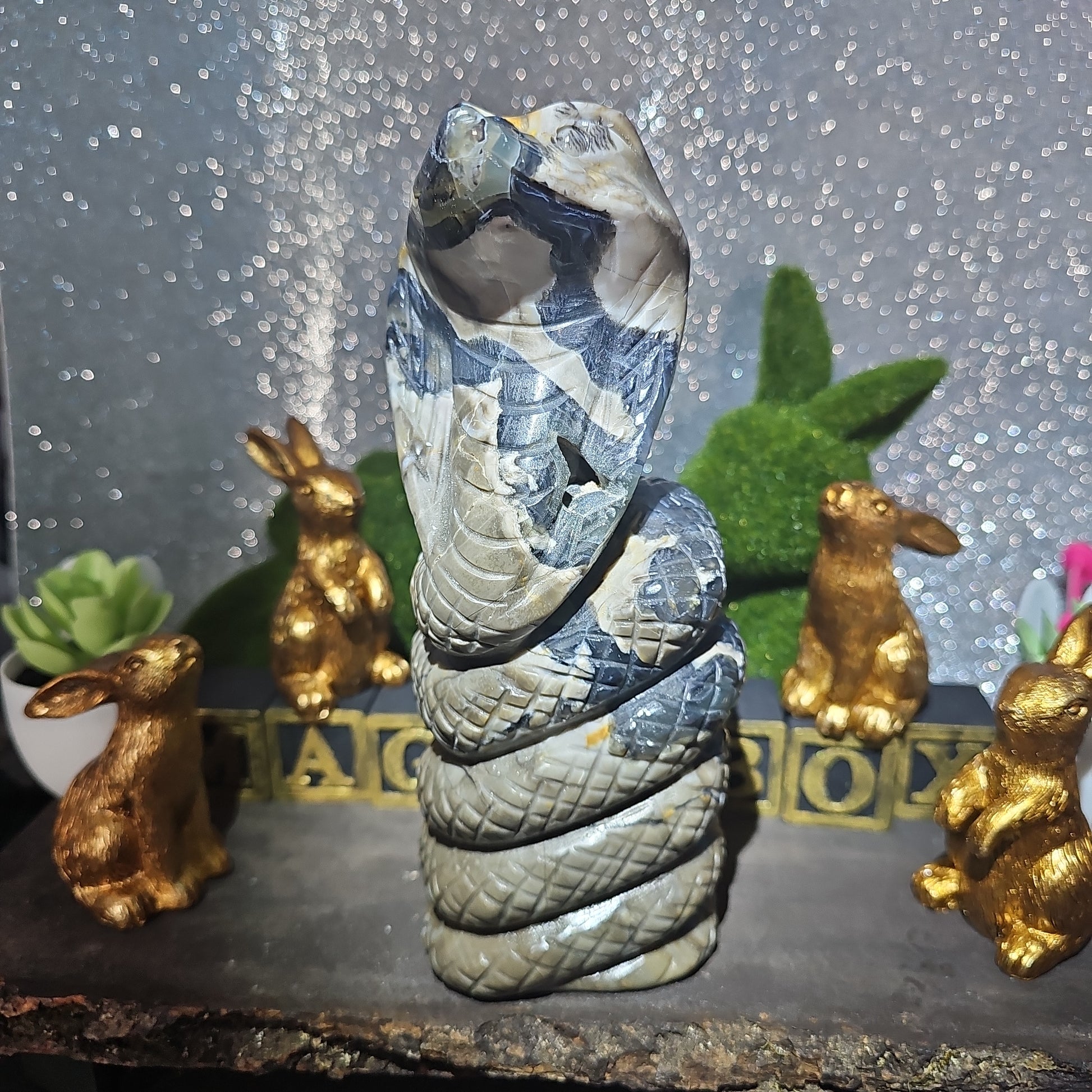 Each snake is meticulously carved to capture the essence of these revered creatures, with intricate details that showcase the unique patterns and textures of volcanic agate. With its sleek form and dynamic presence, this serpent serves as a symbol of transformation, rebirth, and renewal.