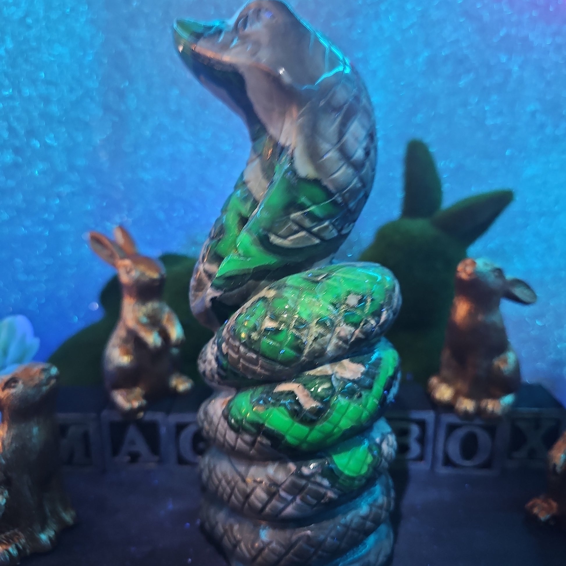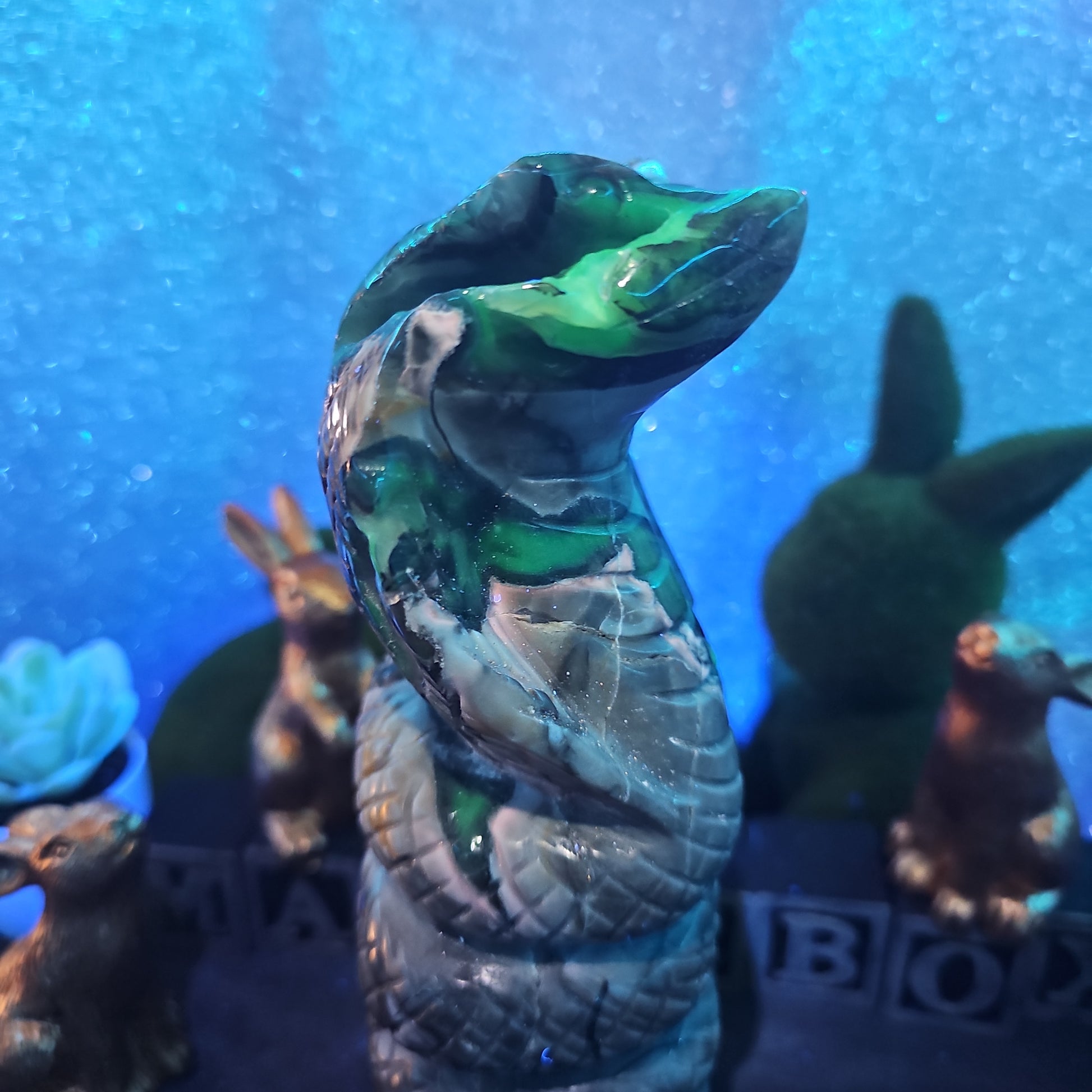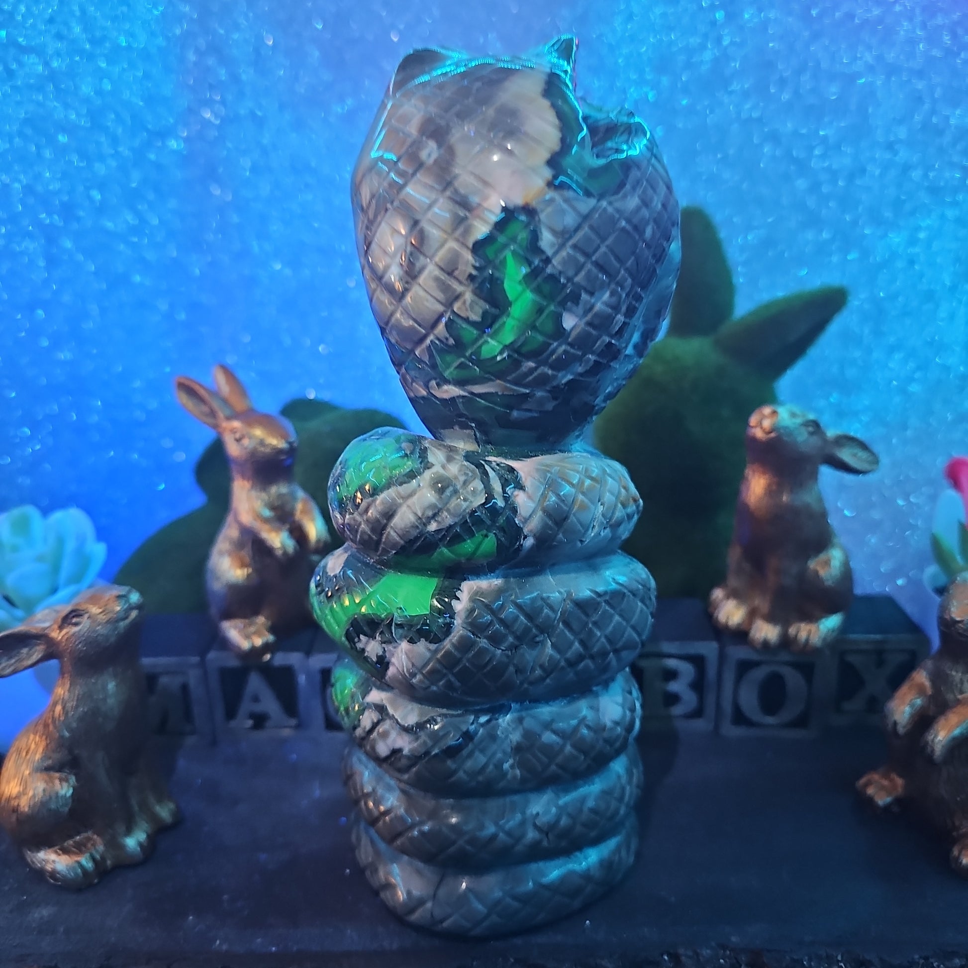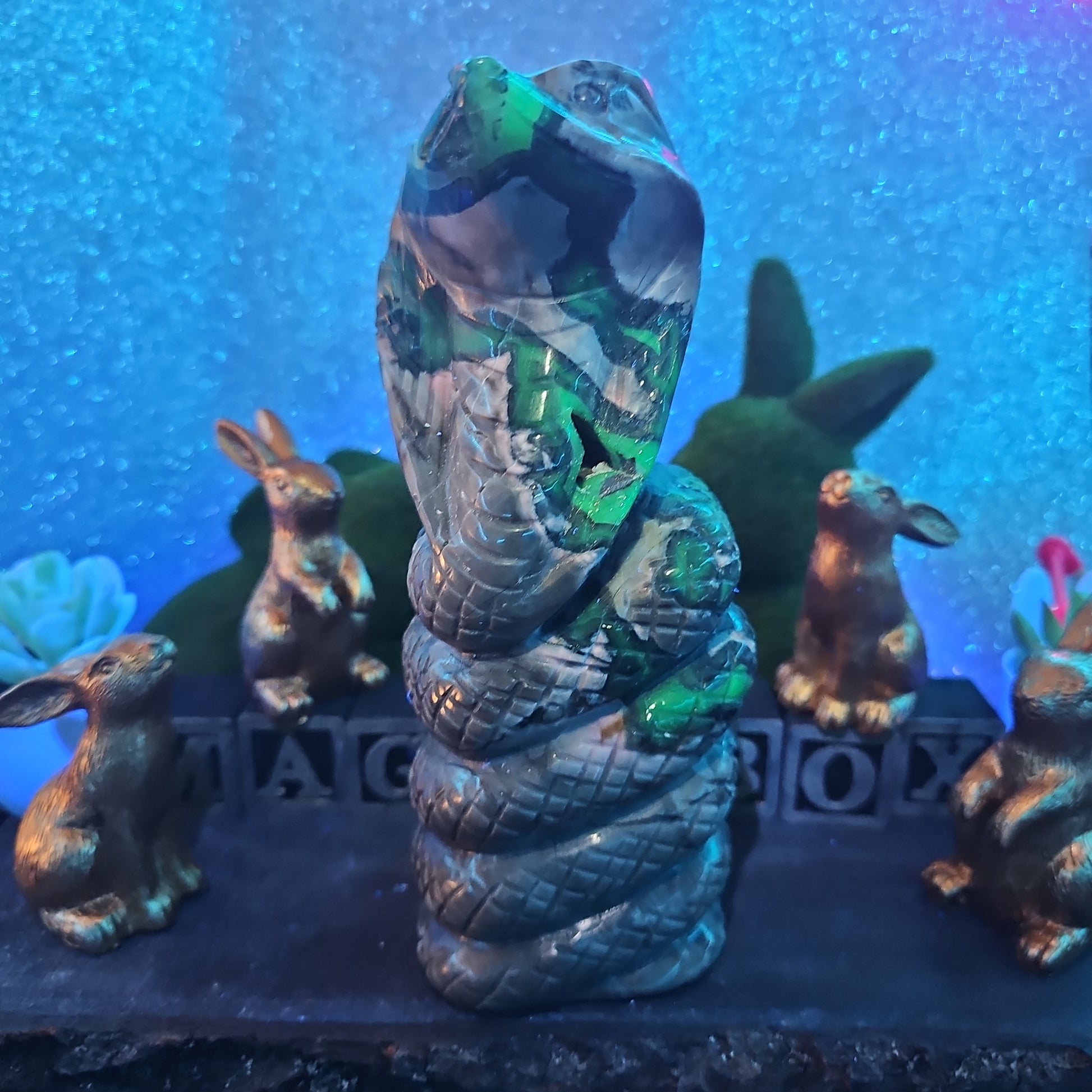 Each snake is meticulously carved to capture the essence of these revered creatures, with intricate details that showcase the unique patterns and textures of volcanic agate. With its sleek form and dynamic presence, this serpent serves as a symbol of transformation, rebirth, and renewal.
