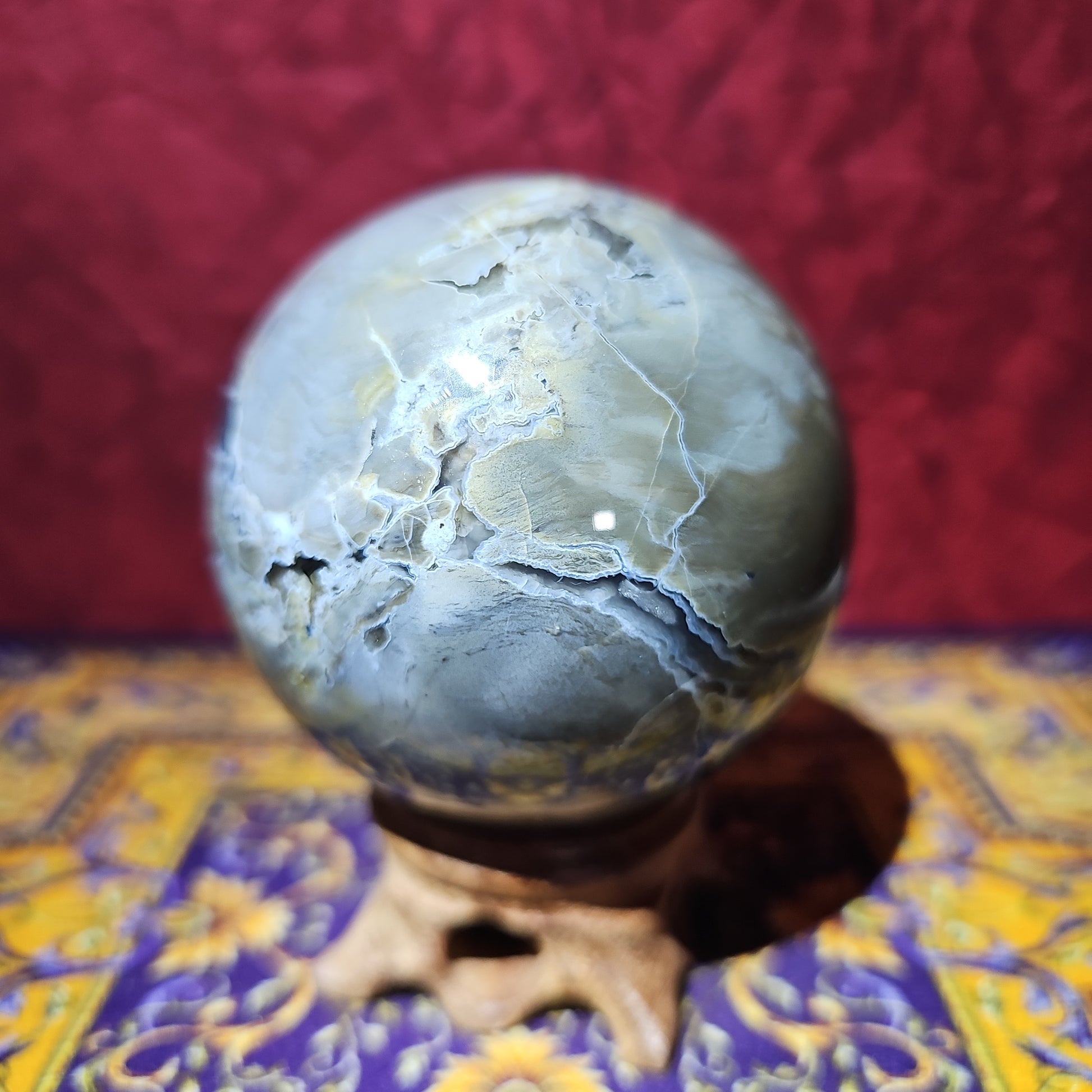 Introducing the Volcanic Agate Sphere, a captivating and unique gemstone creation that combines the raw power of volcanic energy with the mesmerizing beauty of agate. Crafted with precision and care, this exquisite sphere is a testament to the natural wonders of the Earth.