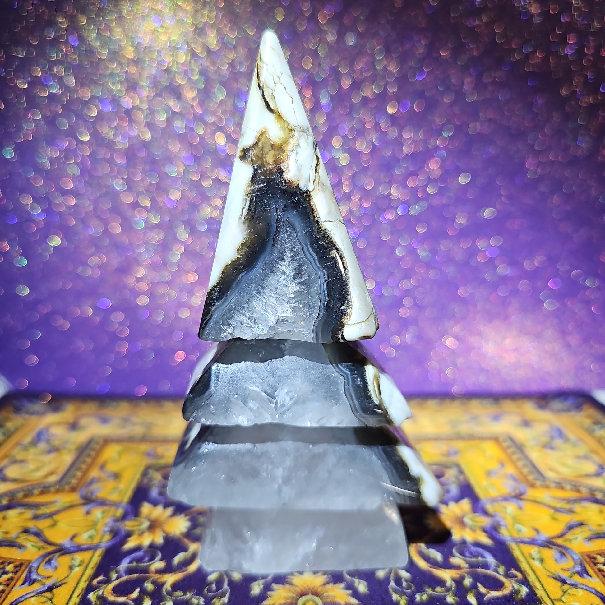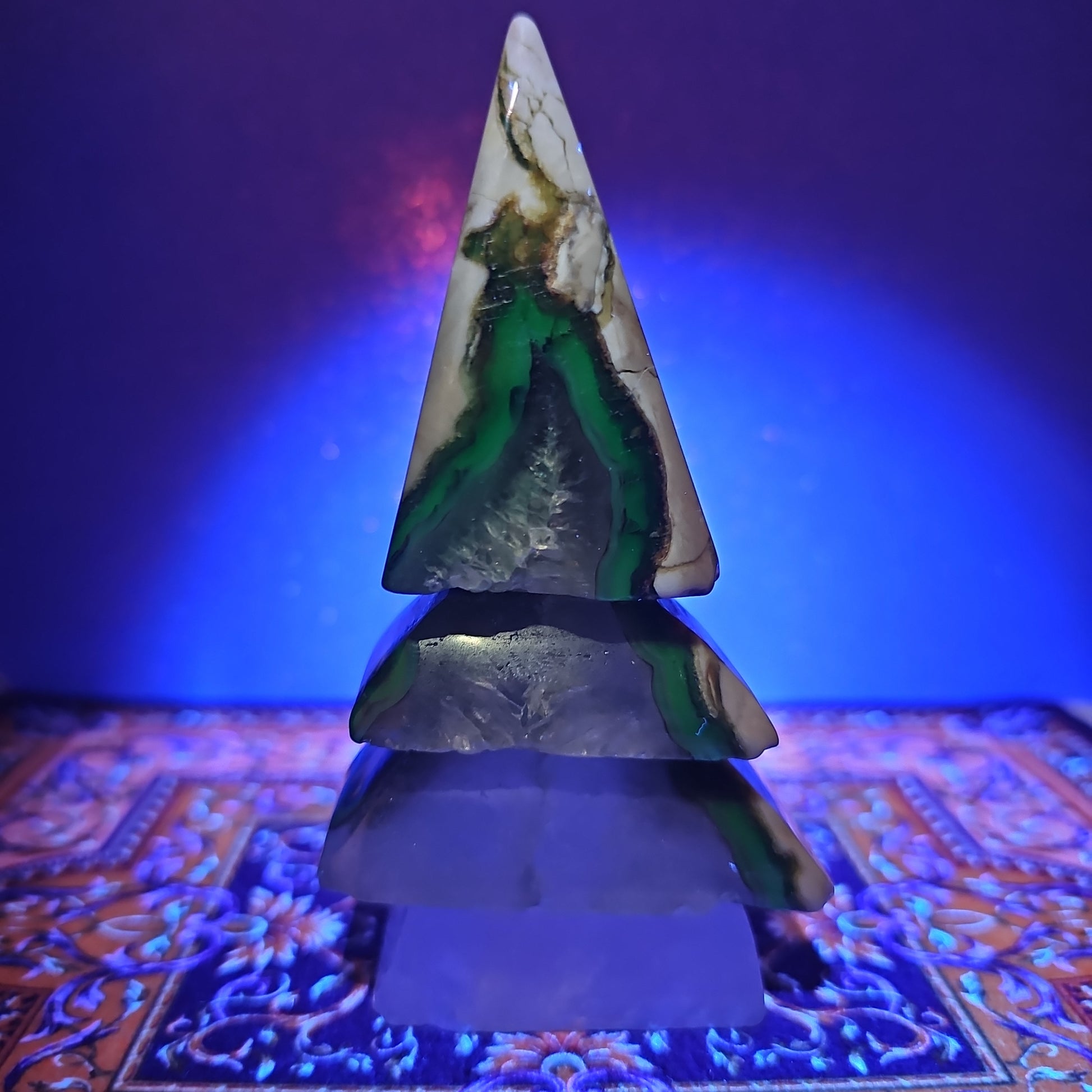 Volcanic agate, formed from the fiery depths of volcanic activity, displays vibrant colors and unique patterns. The tree carving accentuates the natural beauty of volcanic agate, creating a visually enchanting and spiritually resonant work of art.